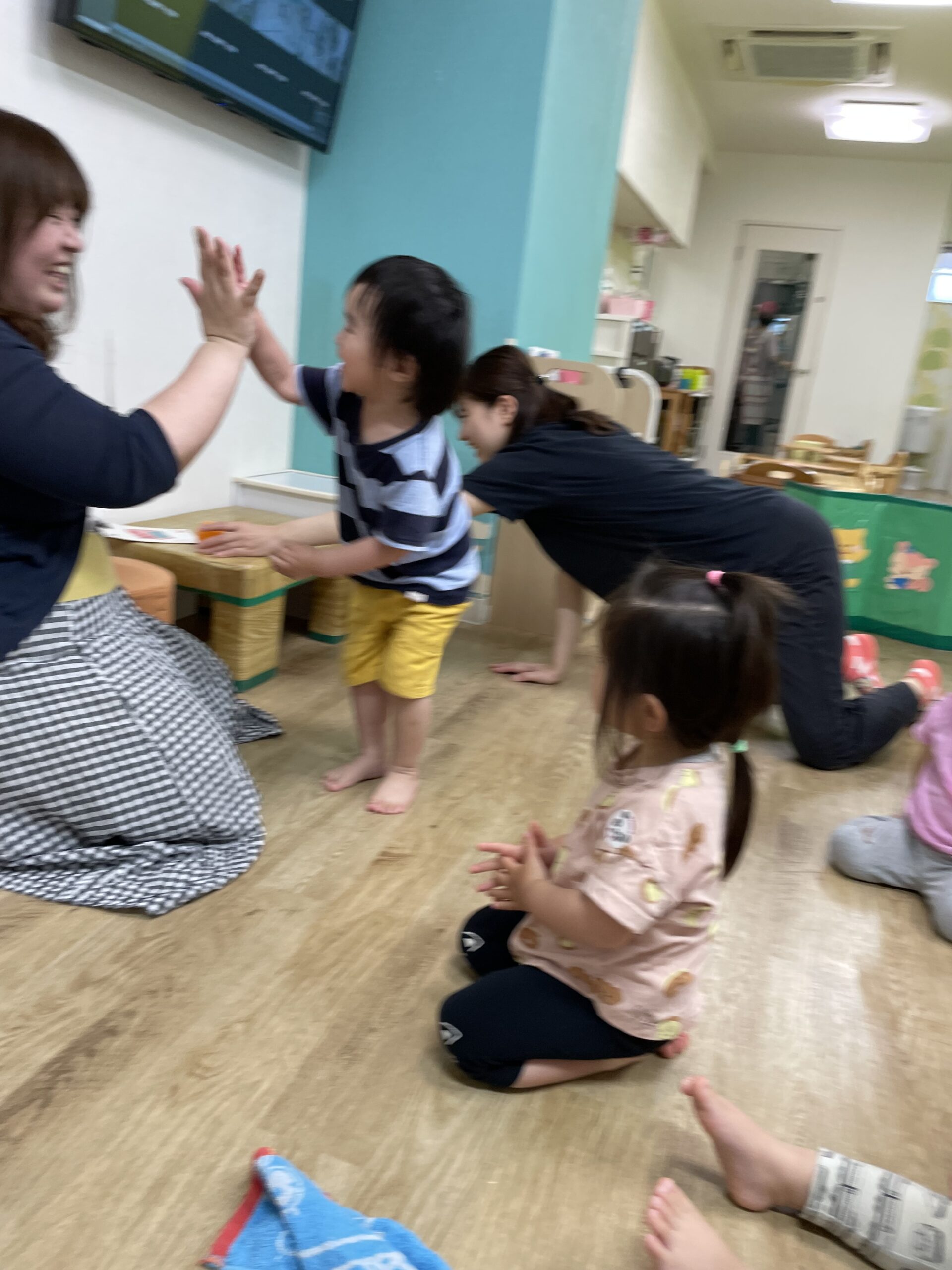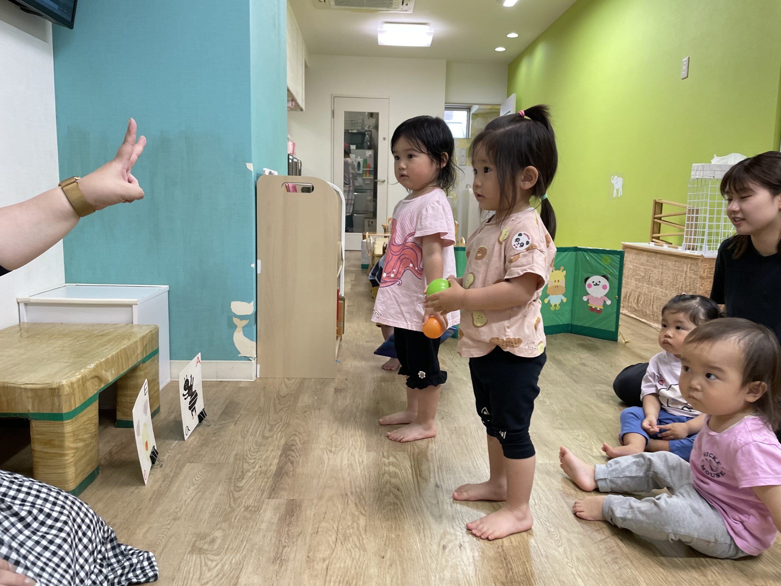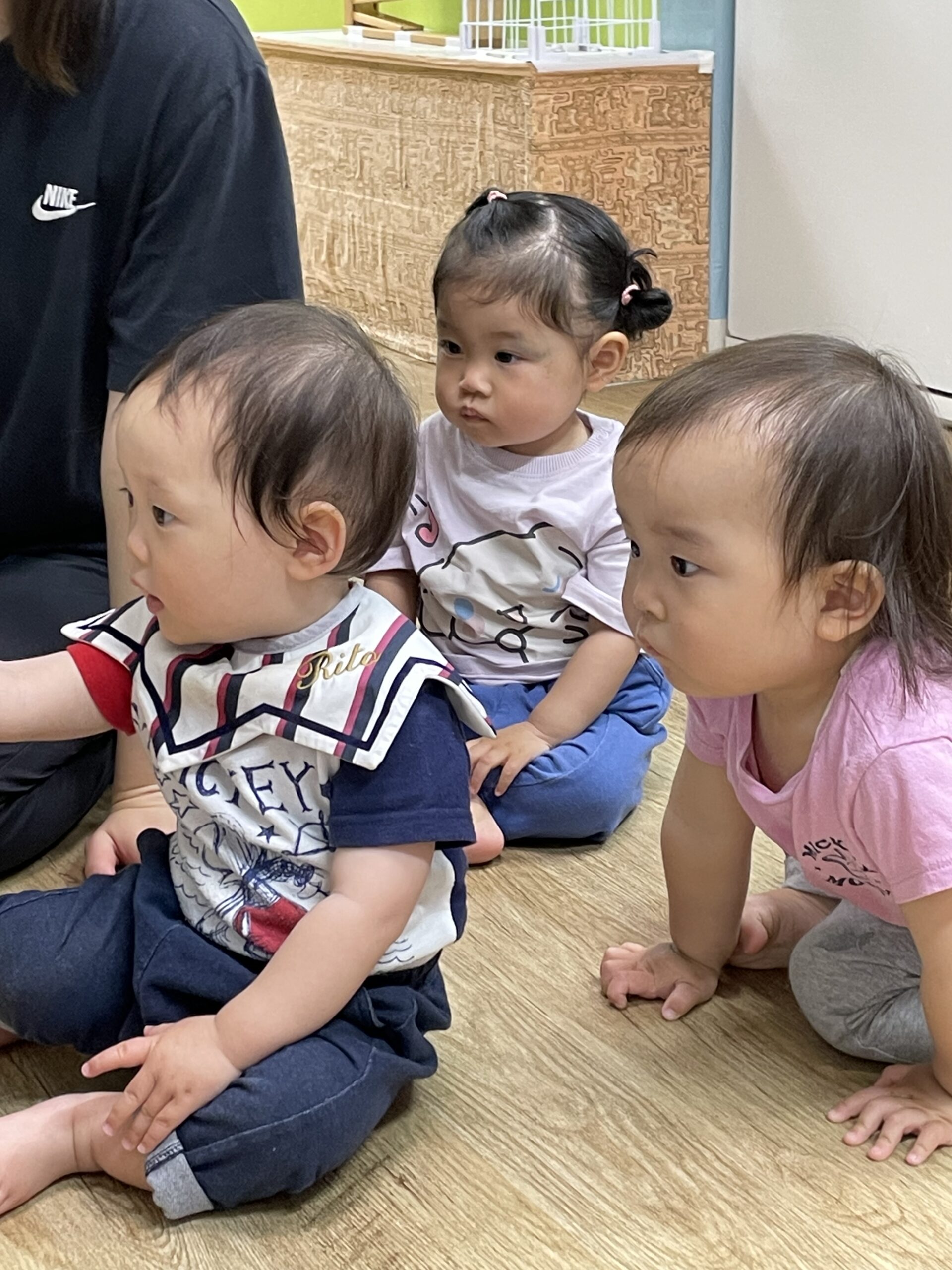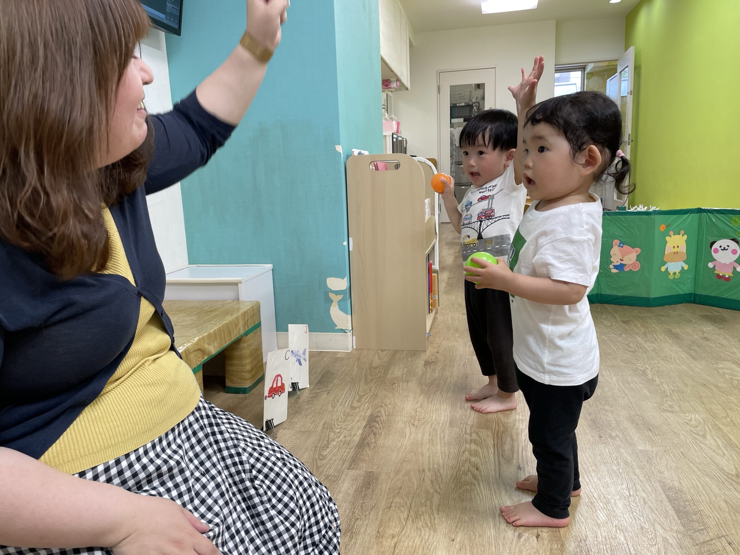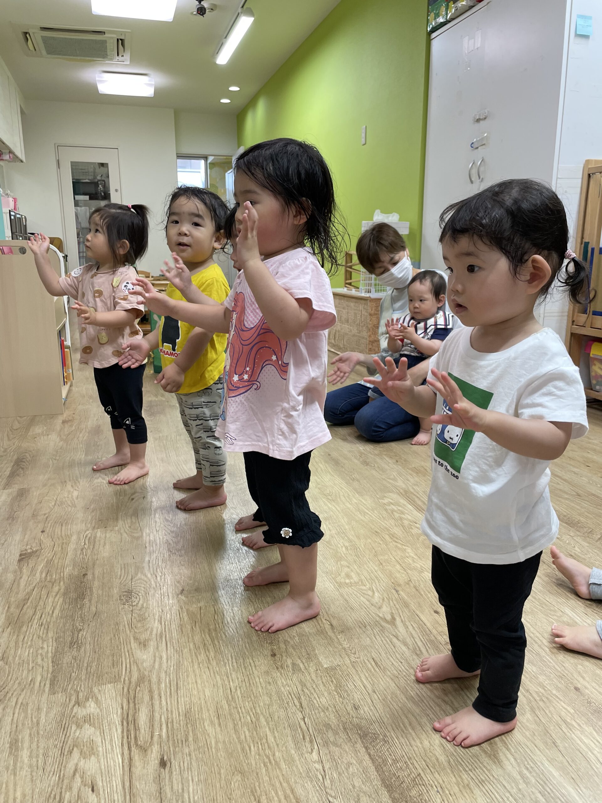 今日は、英語教室の日。「ハロー」と元気よく挨拶すると、曲🎶に合わせて体を揺らしたり、手を振って楽しんでいましたよ。