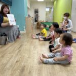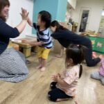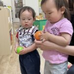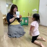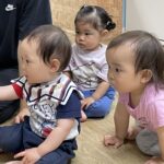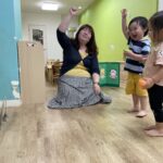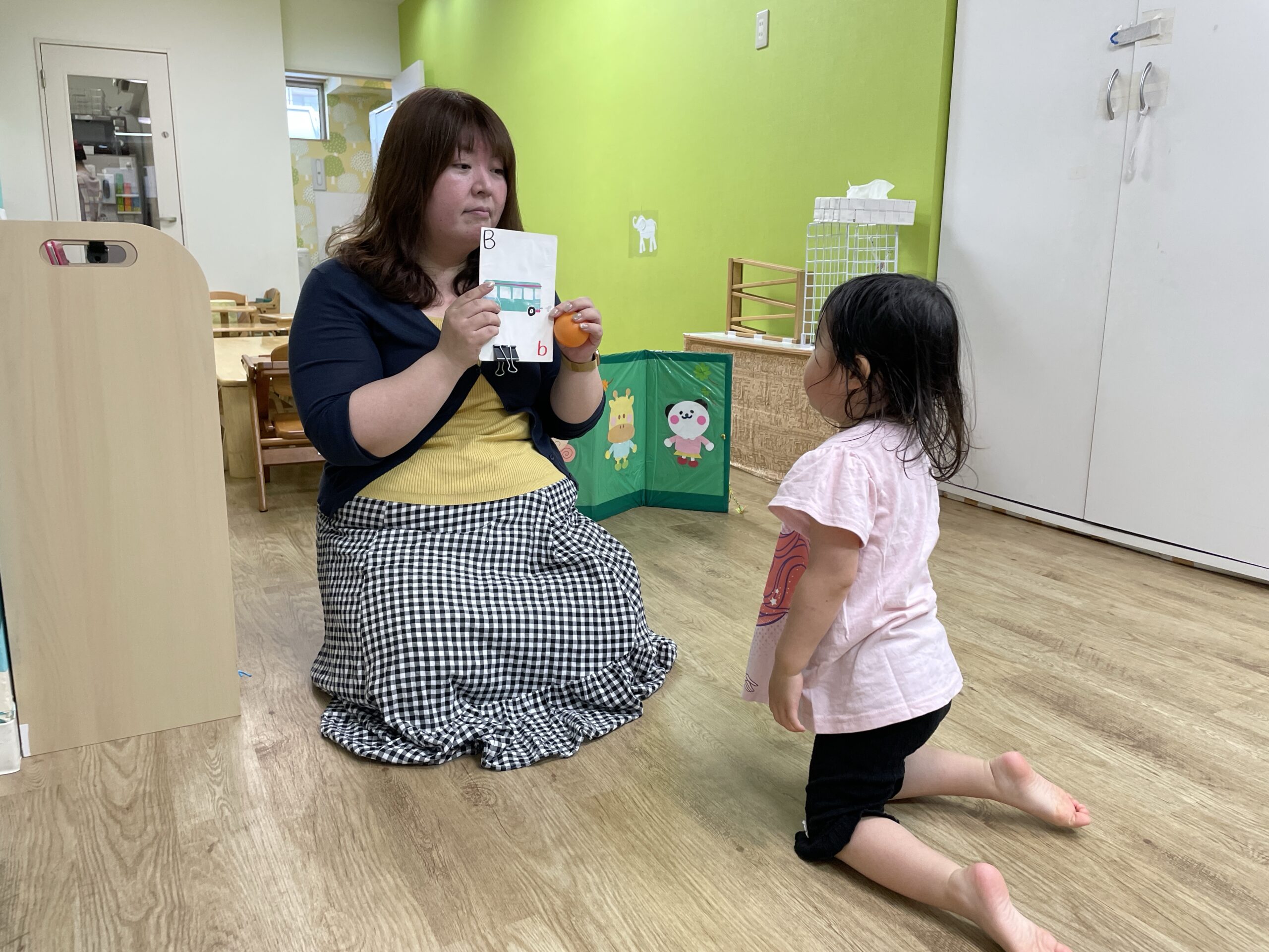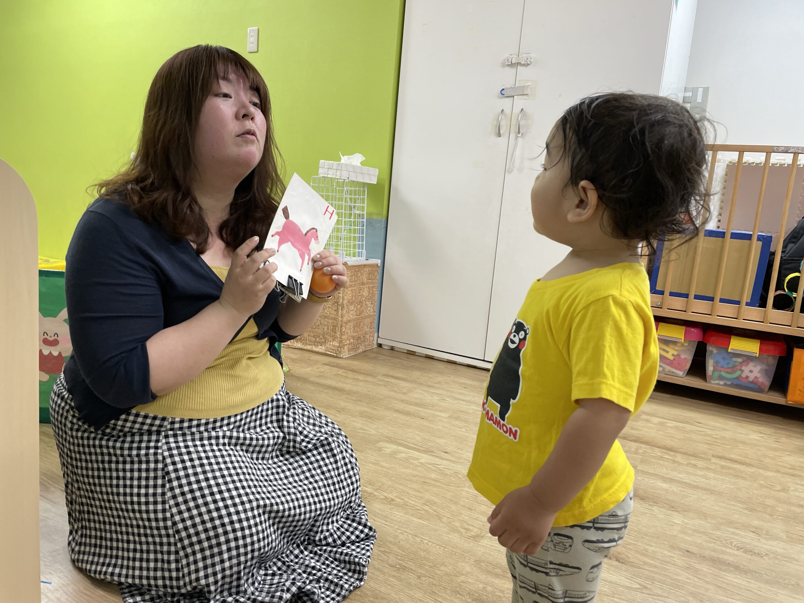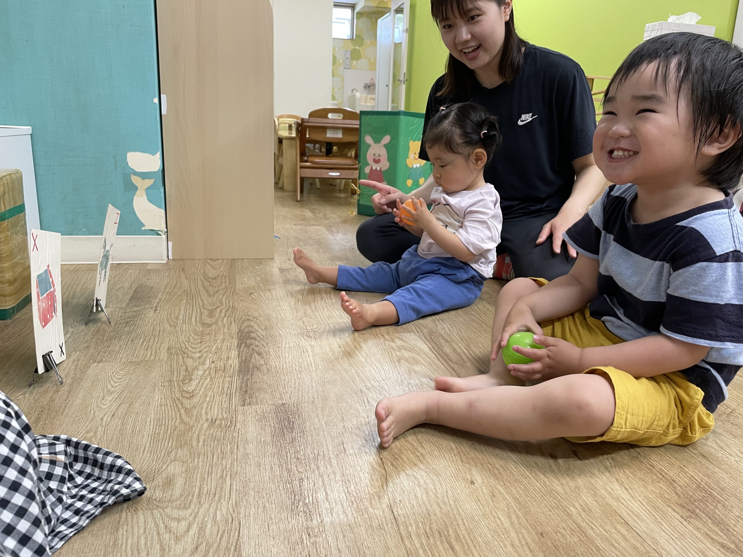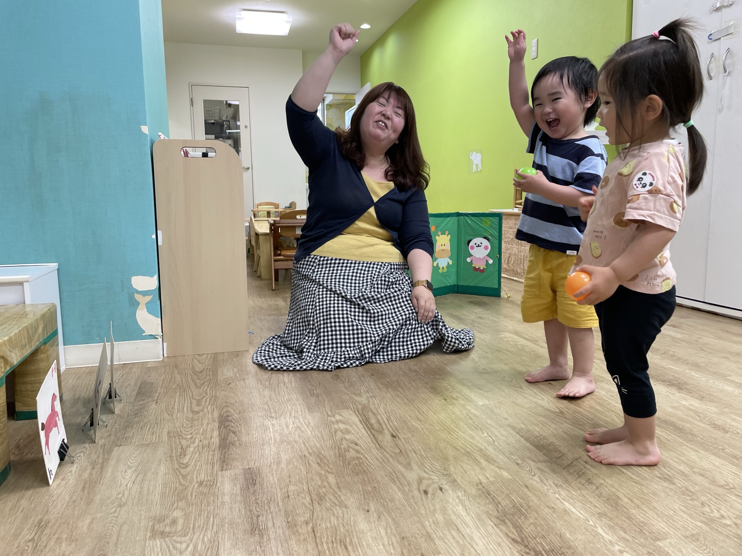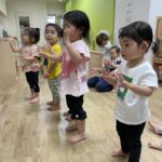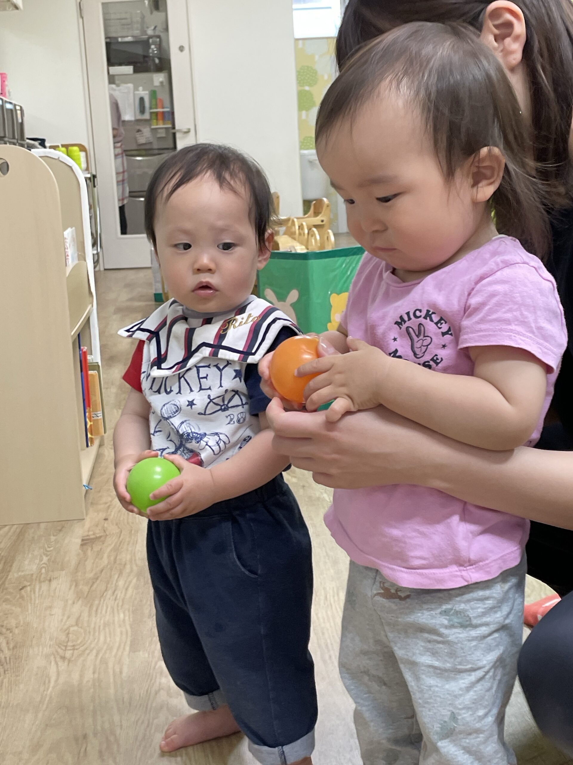 今日は、英語教室の日。「ハロー」と元気よく挨拶すると、曲🎶に合わせて体を揺らしたり、手を振って楽しんでいましたよ。