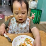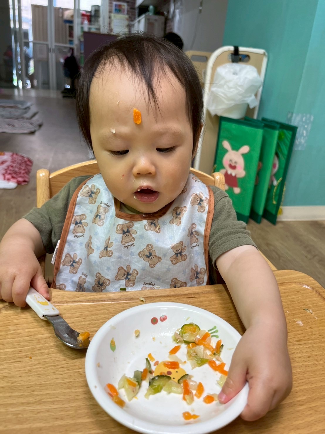 0歳児さん。溢したり、顔のまわりに付いたりしながらも給食を喜んで自分で食べています😊