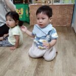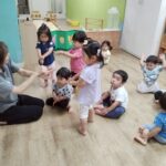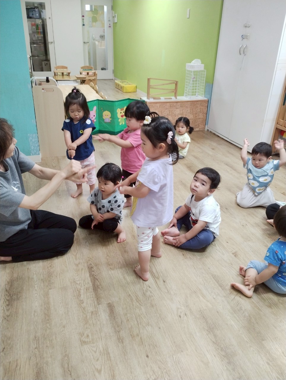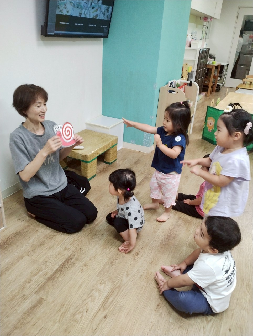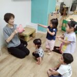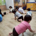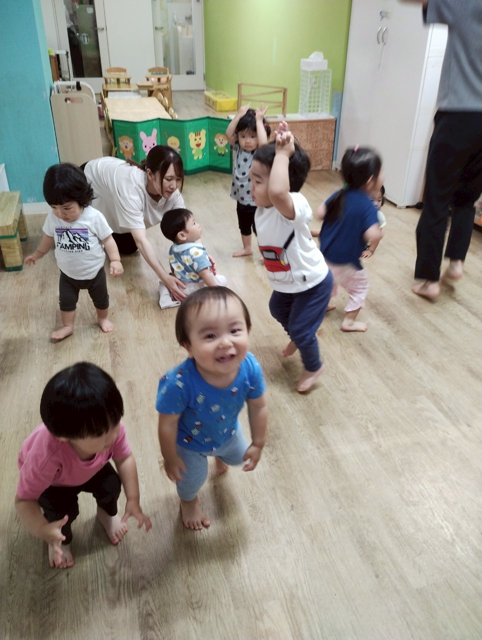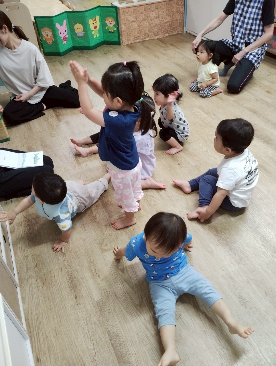今日は、「ぴょ~ん」という絵本を視聴した後、絵本に出てきた動物になりきって遊びました。カエル🐸になって飛び跳ねたり、カタツムリ🐌になって床を這ったりして楽しみました。