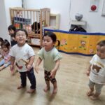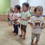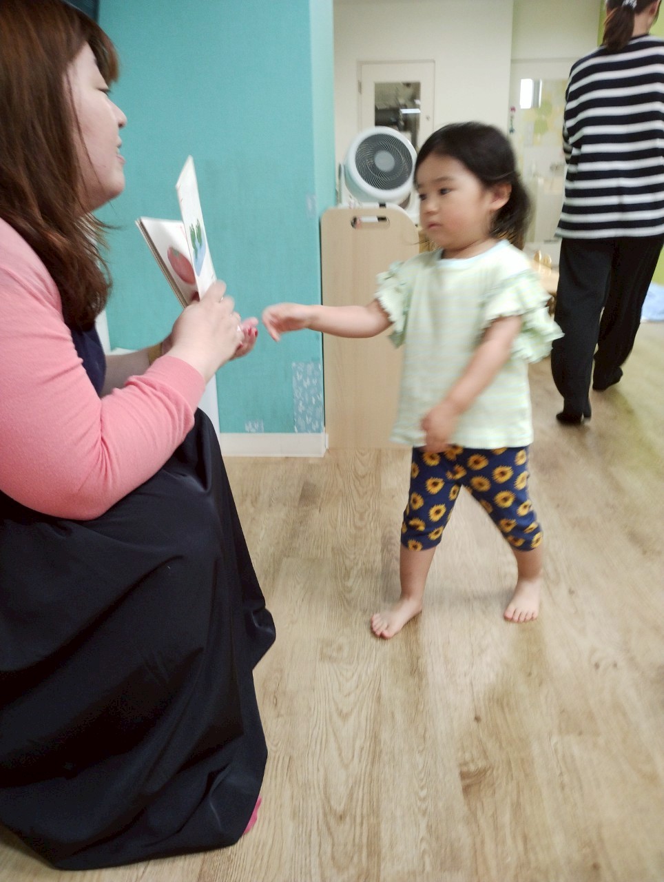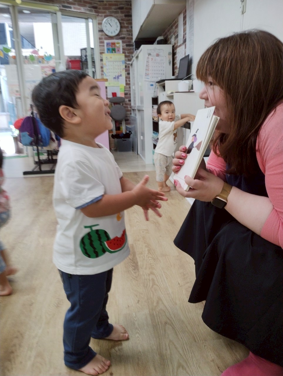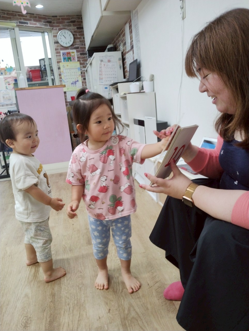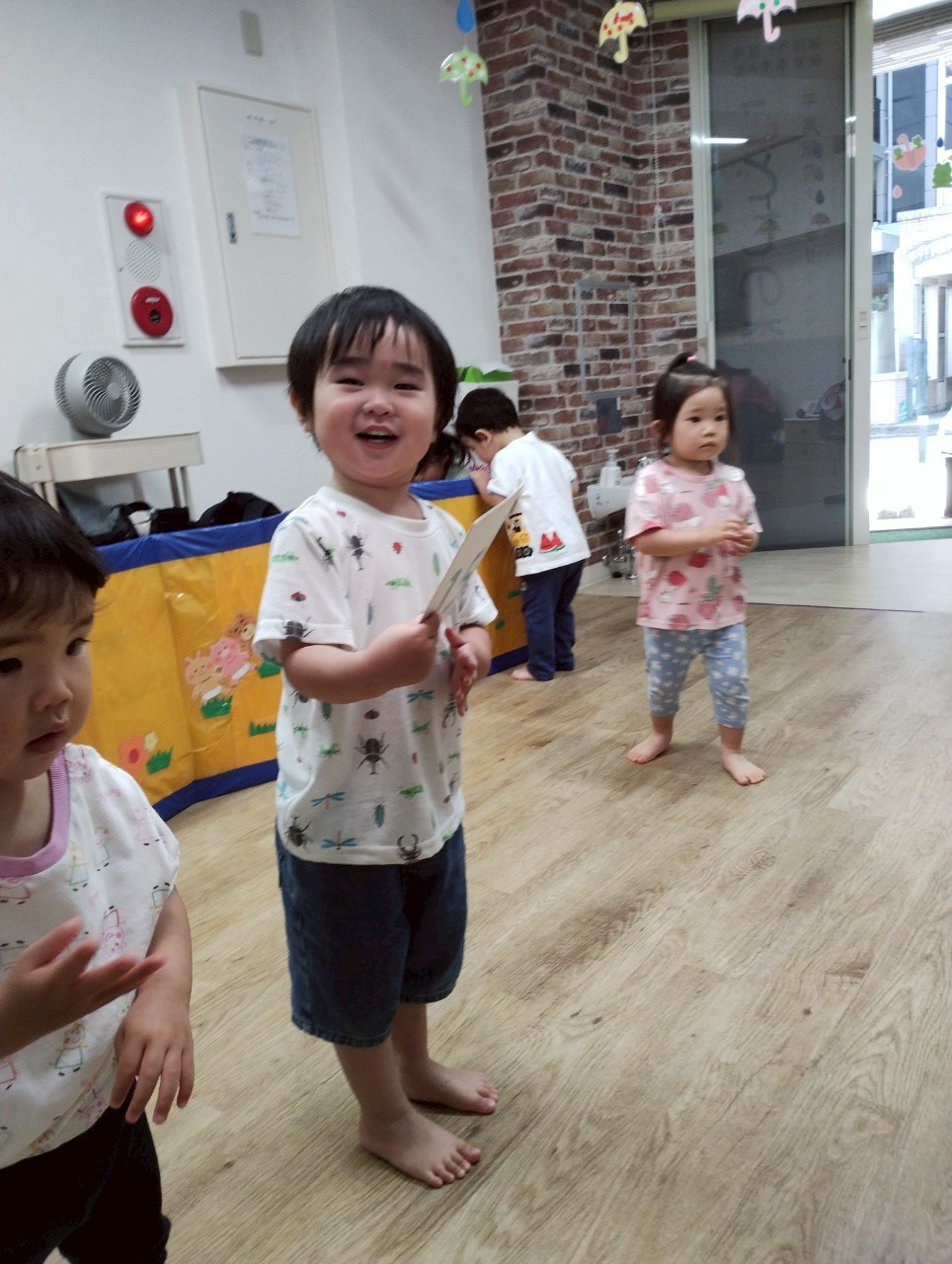 英語教室では、カードハンティングをしました。お部屋の中をあちこち覗き込んでカードを探す子どもたちでした。カードが見つかるととっても嬉しそうに渡しにいっていましたよ(*^-^*)