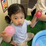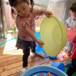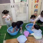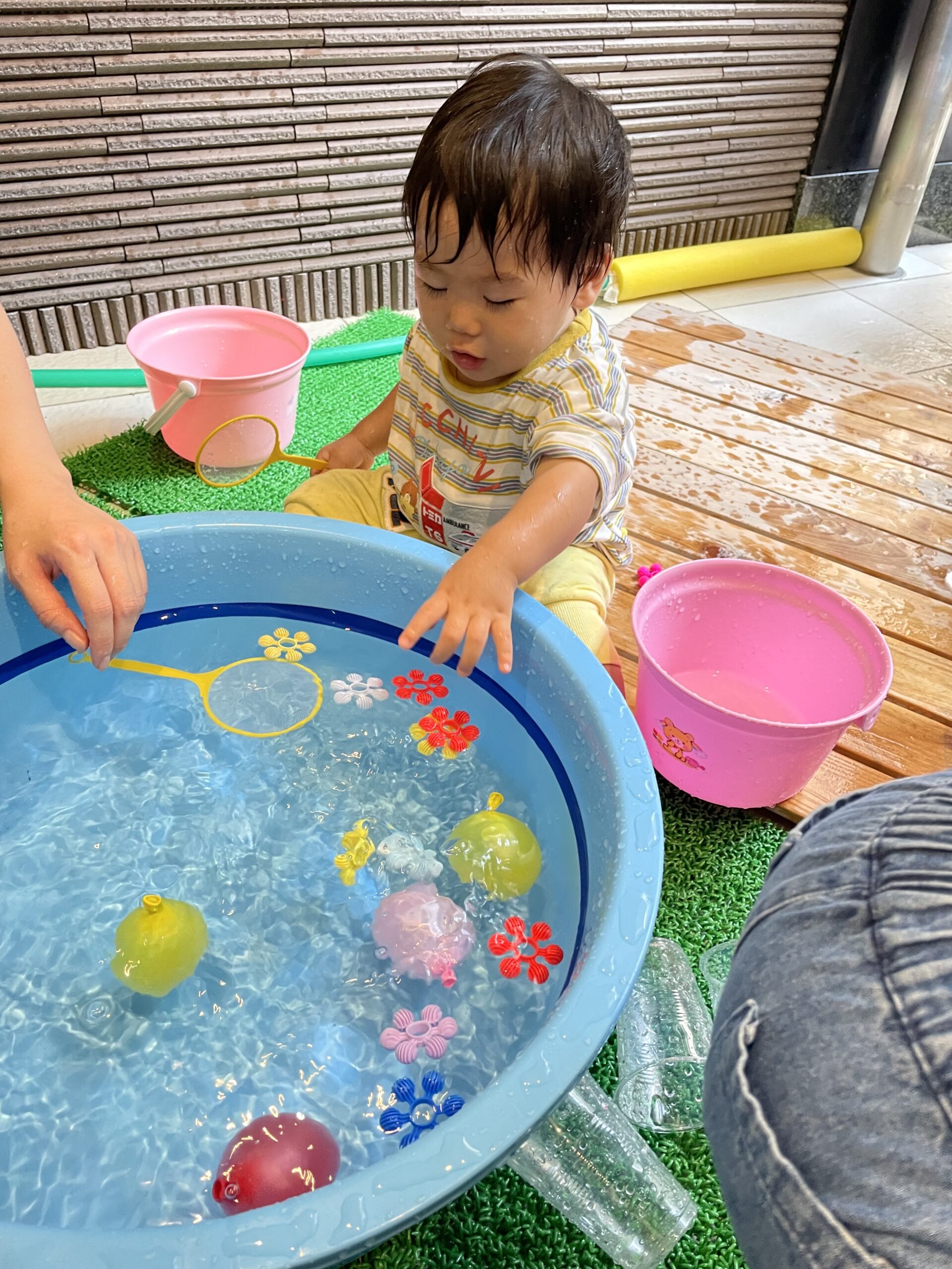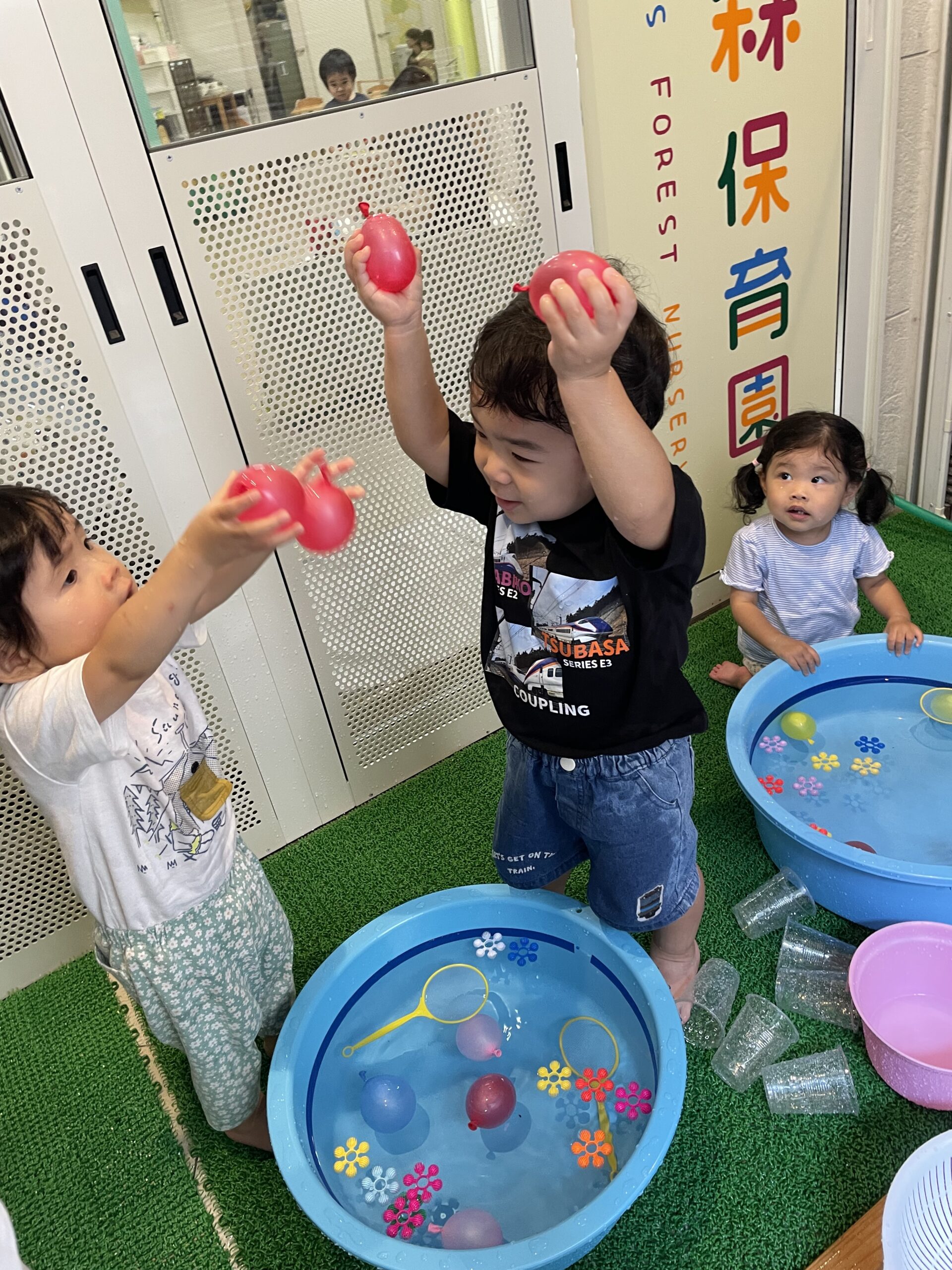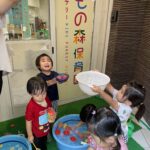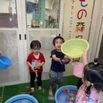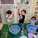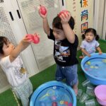 水風船を両手に持ち、「1,2…9,10!」でタライにドボンと投げ入れたり、洗面器に入れた水を頭からかぶってみたり!