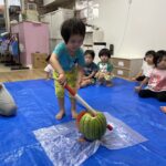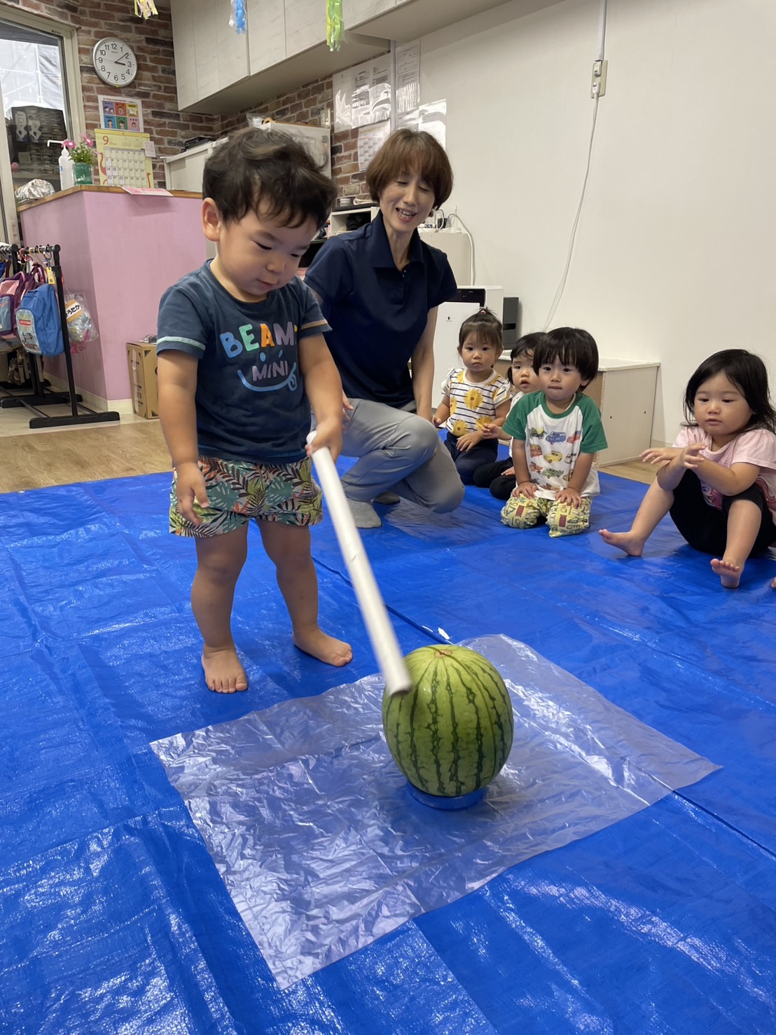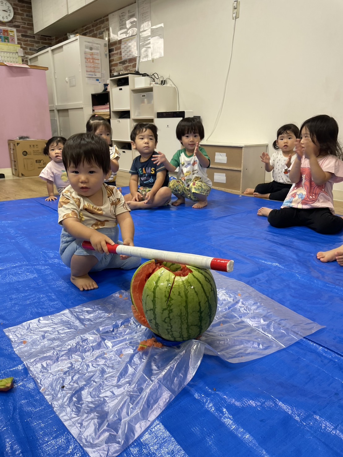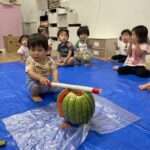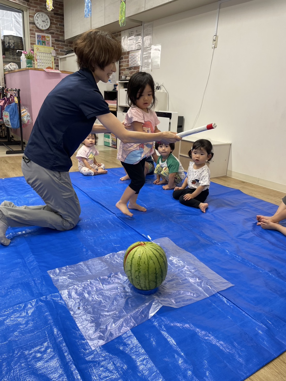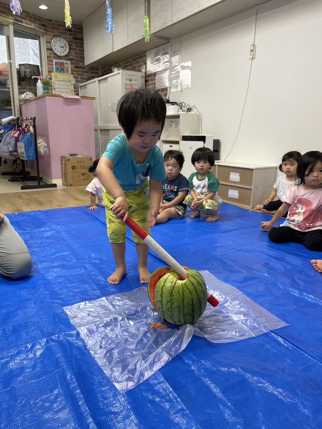 今日の15時のおやつはすいかだったのでお昼寝の後みんなですいか割りをしました🍉