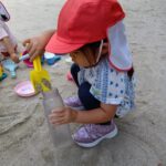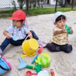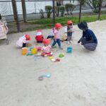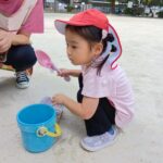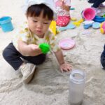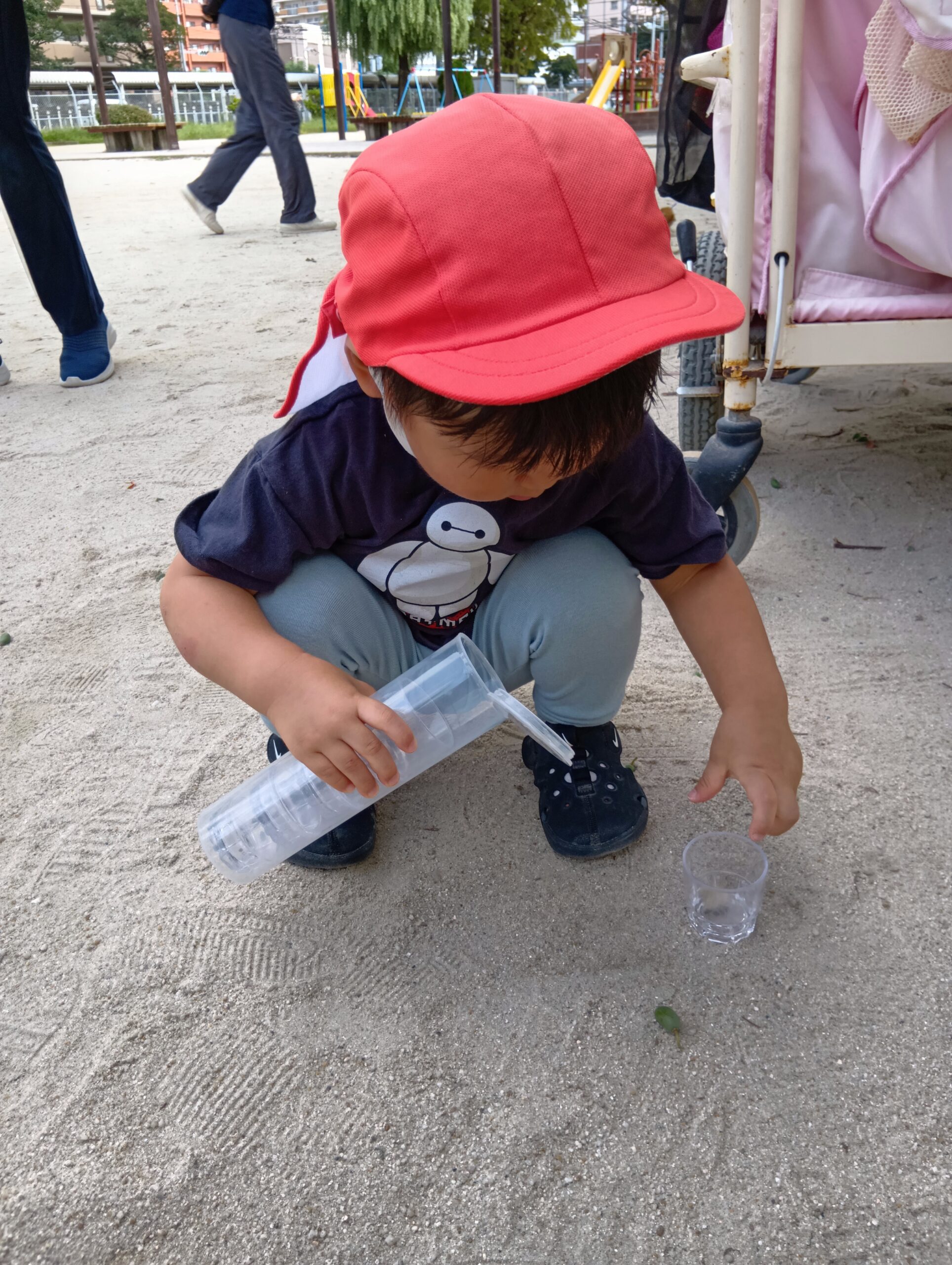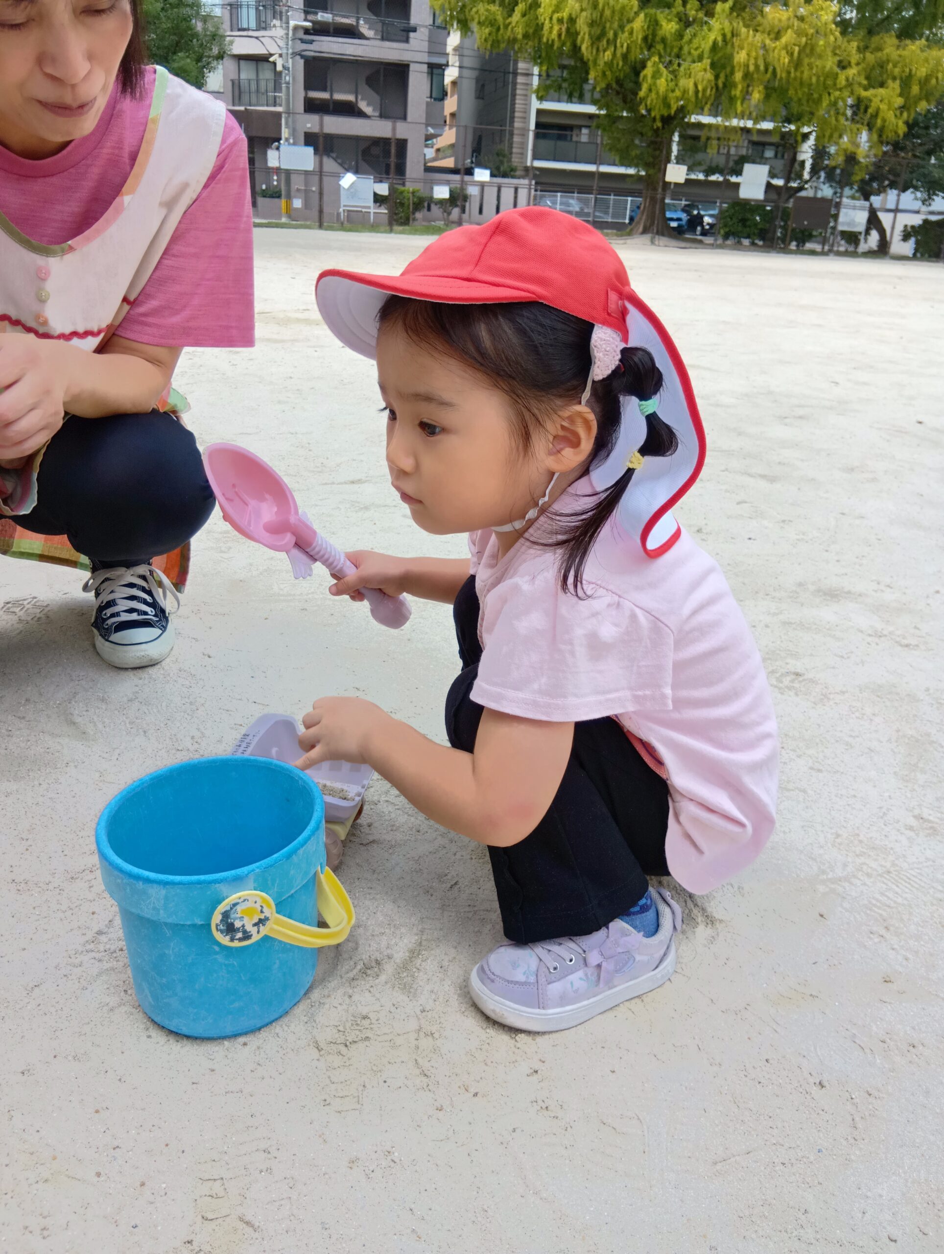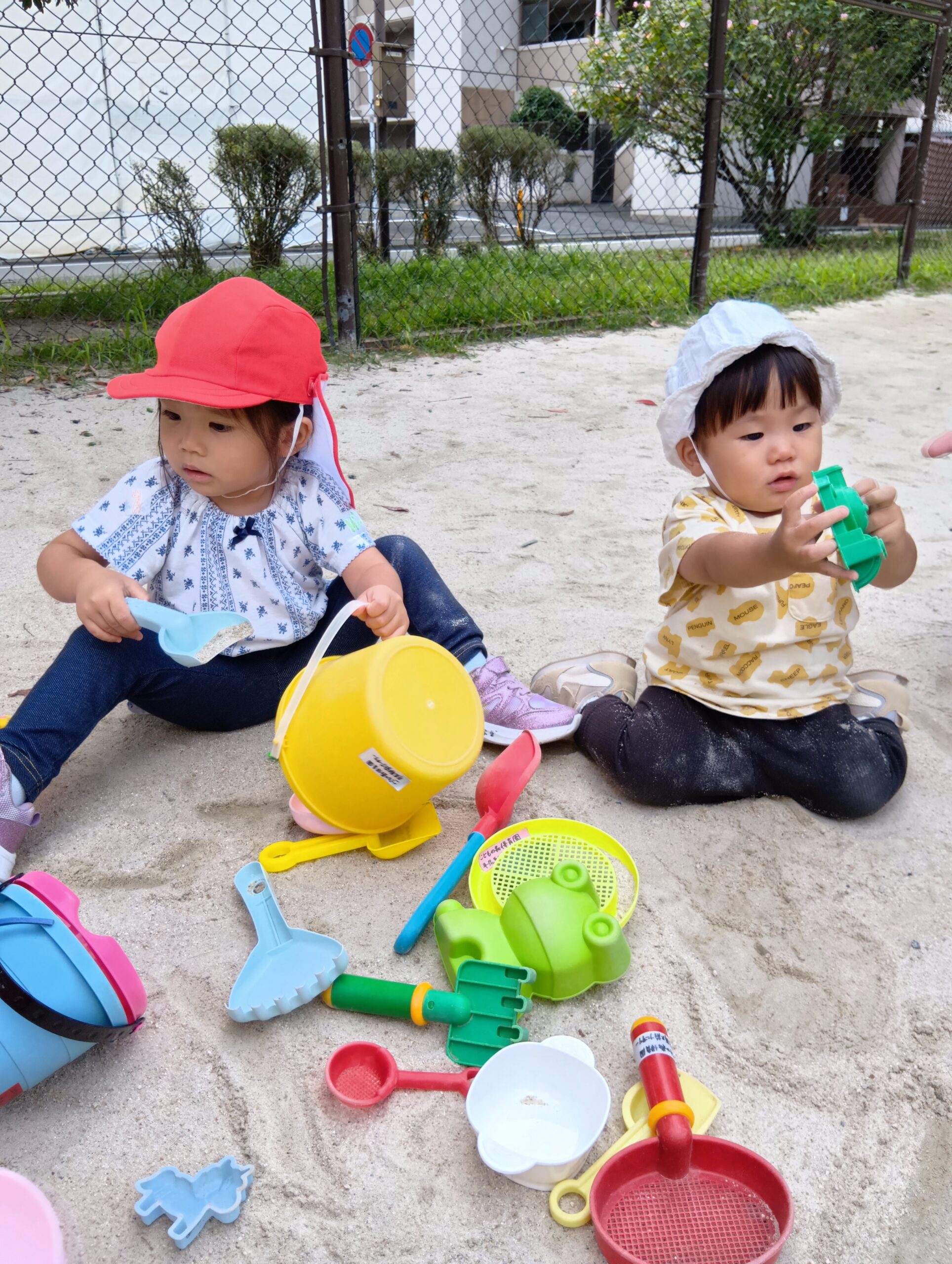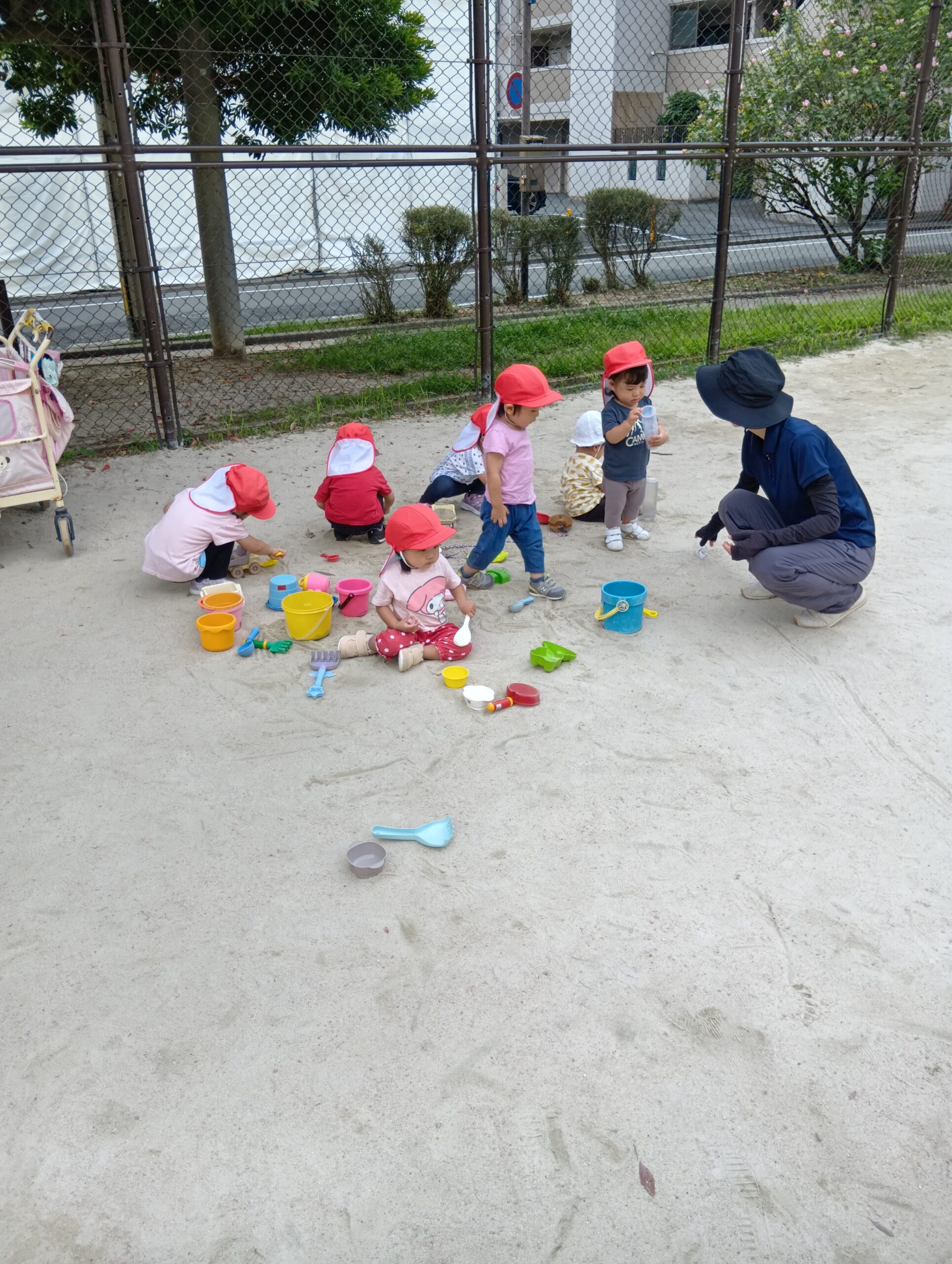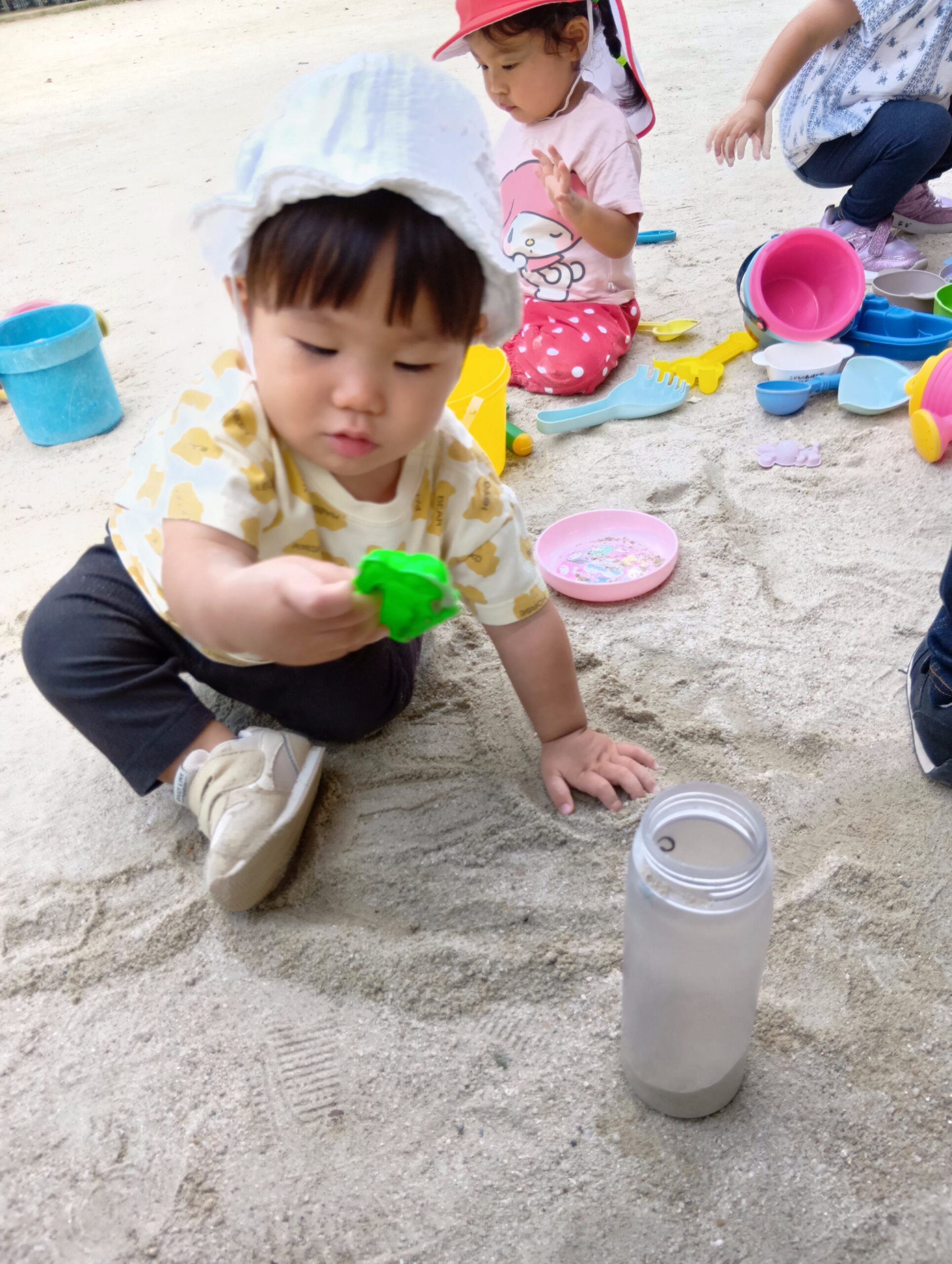 お砂場セットを出すと、お皿やバケツ、コップなどに砂をたくさん入れたり、「どうぞ〜ジュースで〜す」と作ってくれる子もいましたよ😌