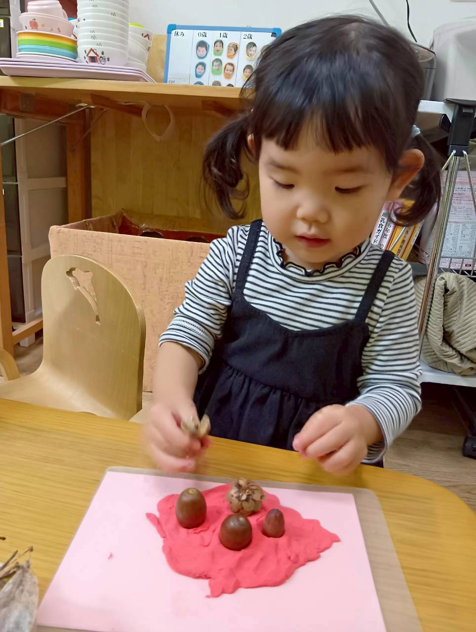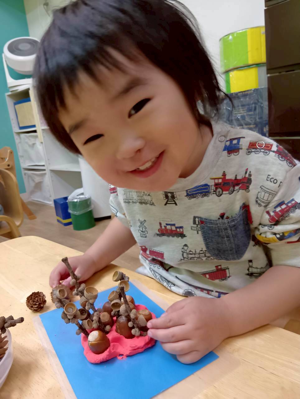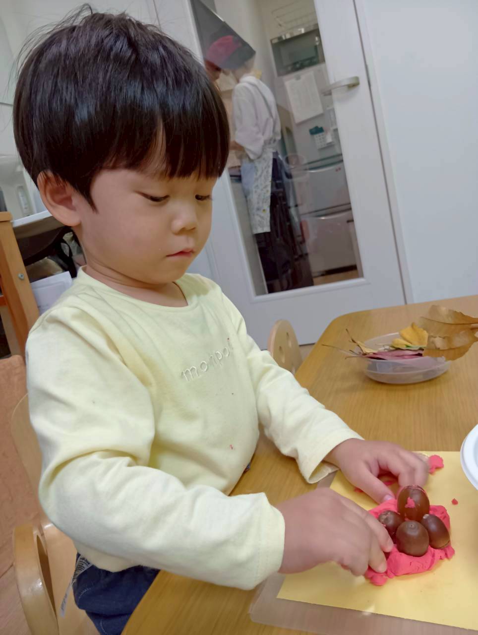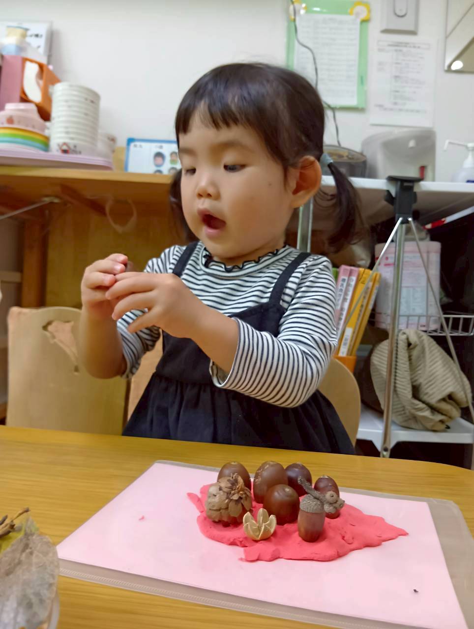 その後は紙粘土をこねてからどんぐりや落ち葉を刺していきました🍂