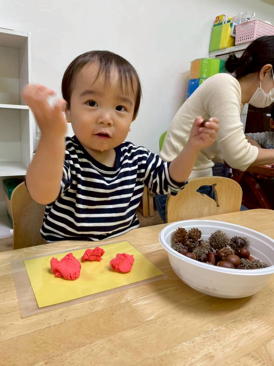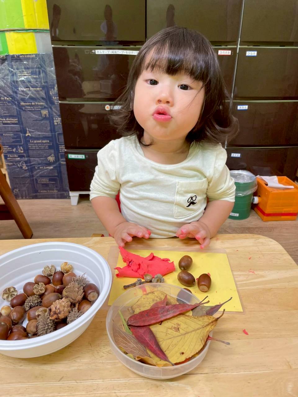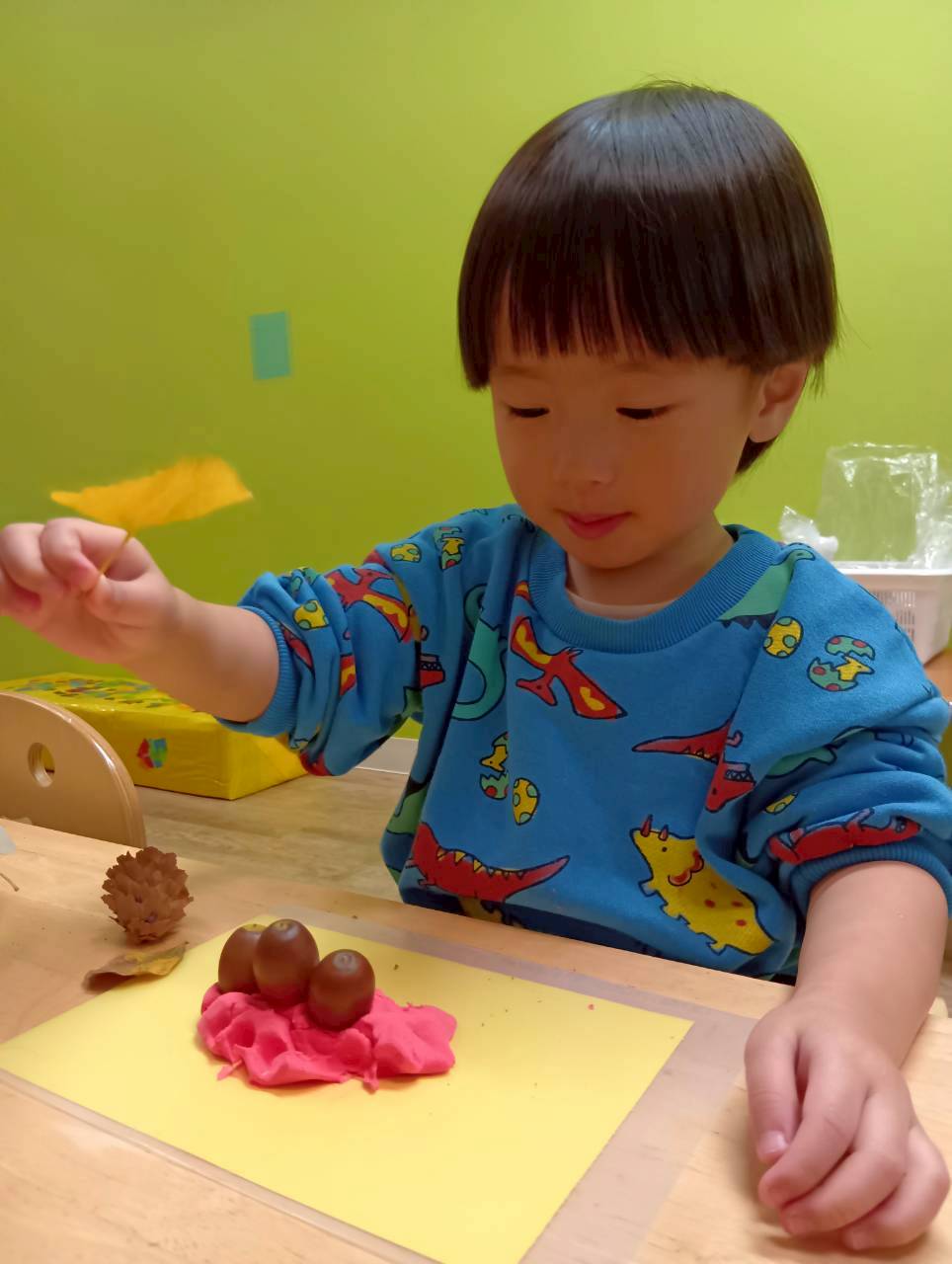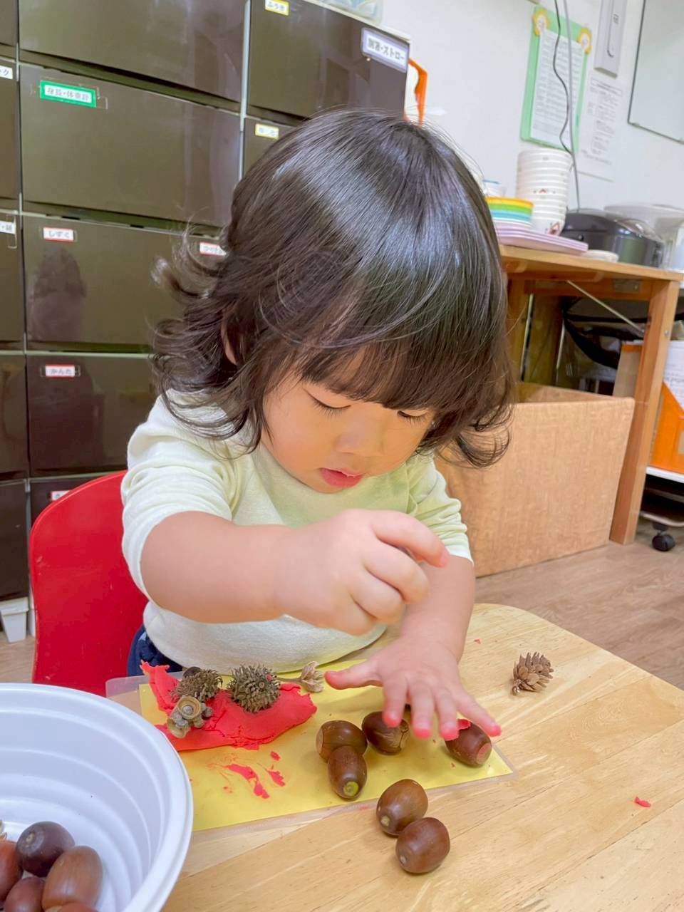 その後は紙粘土をこねてからどんぐりや落ち葉を刺していきました🍂
