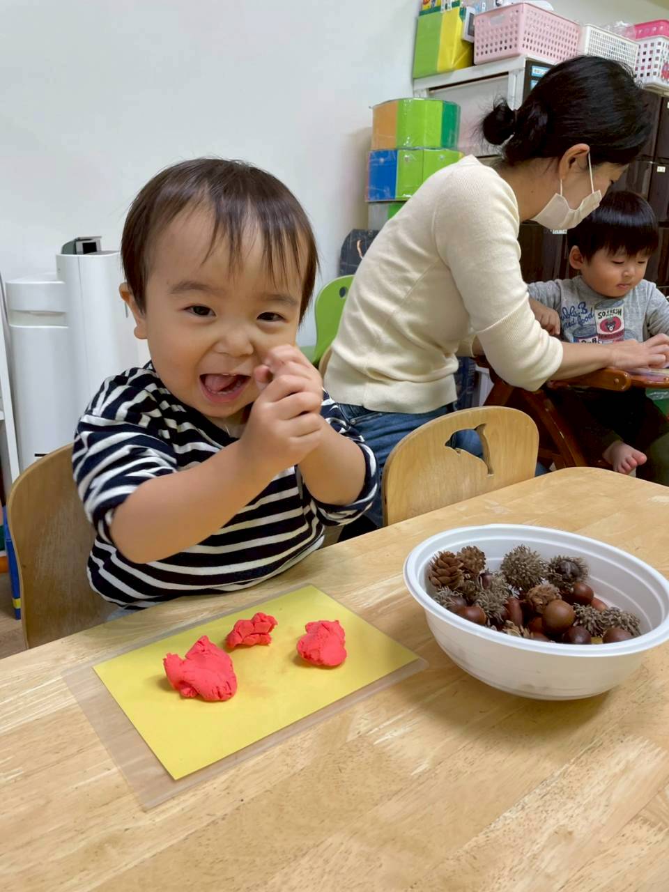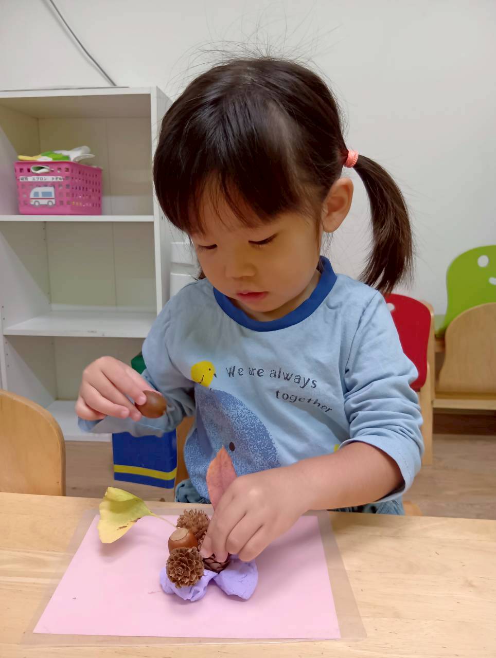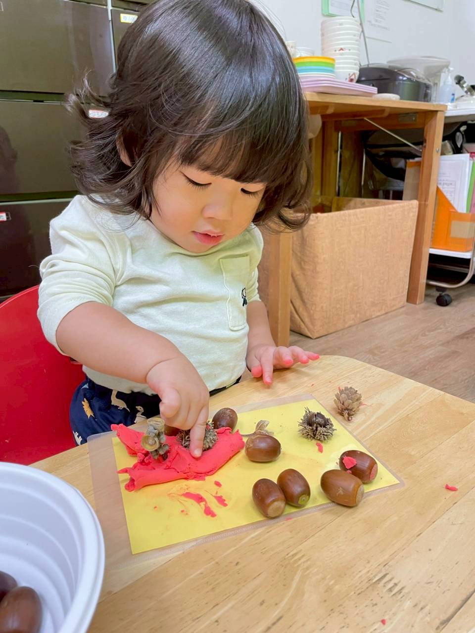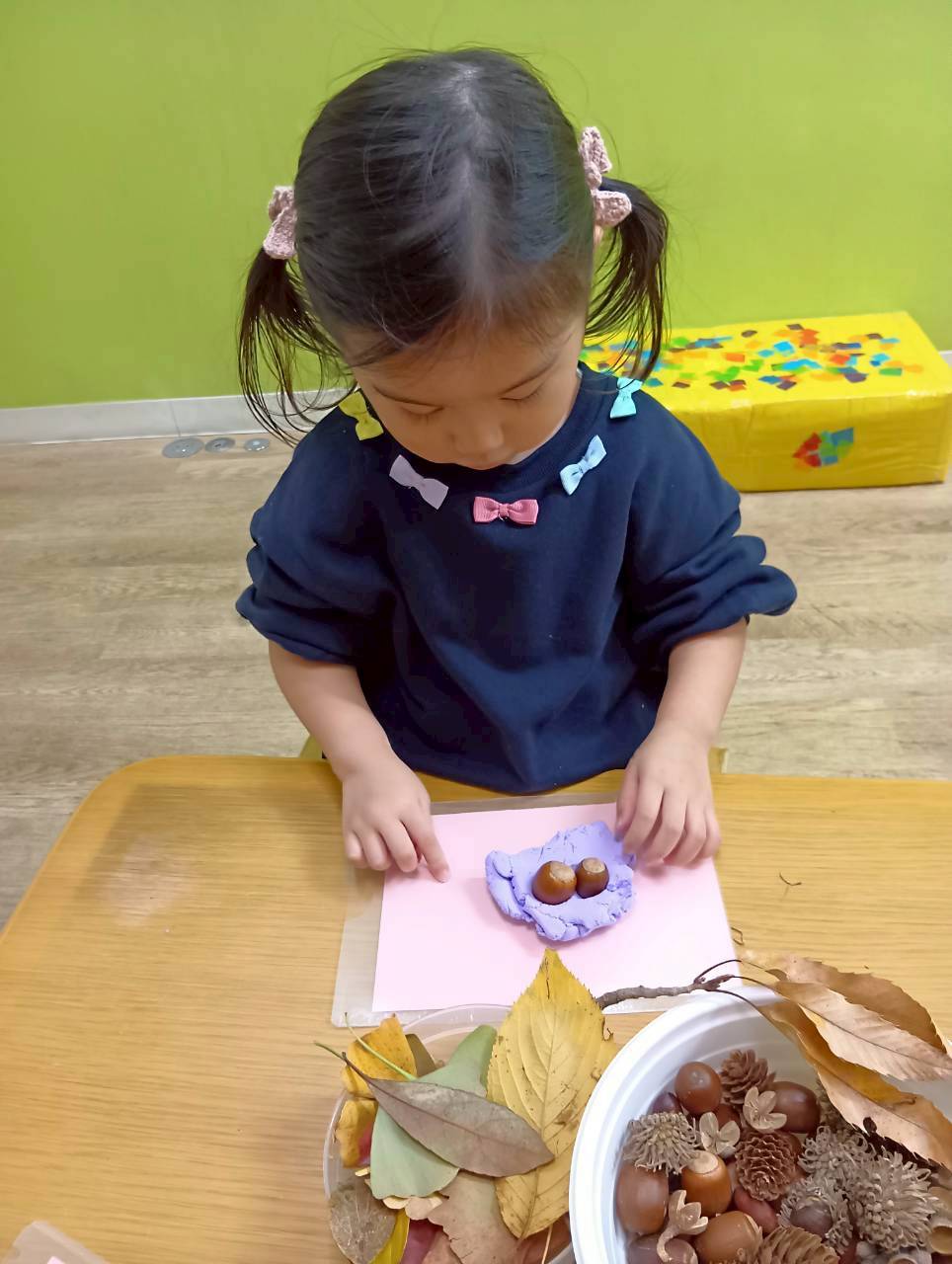 その後は紙粘土をこねてからどんぐりや落ち葉を刺していきました🍂
