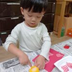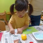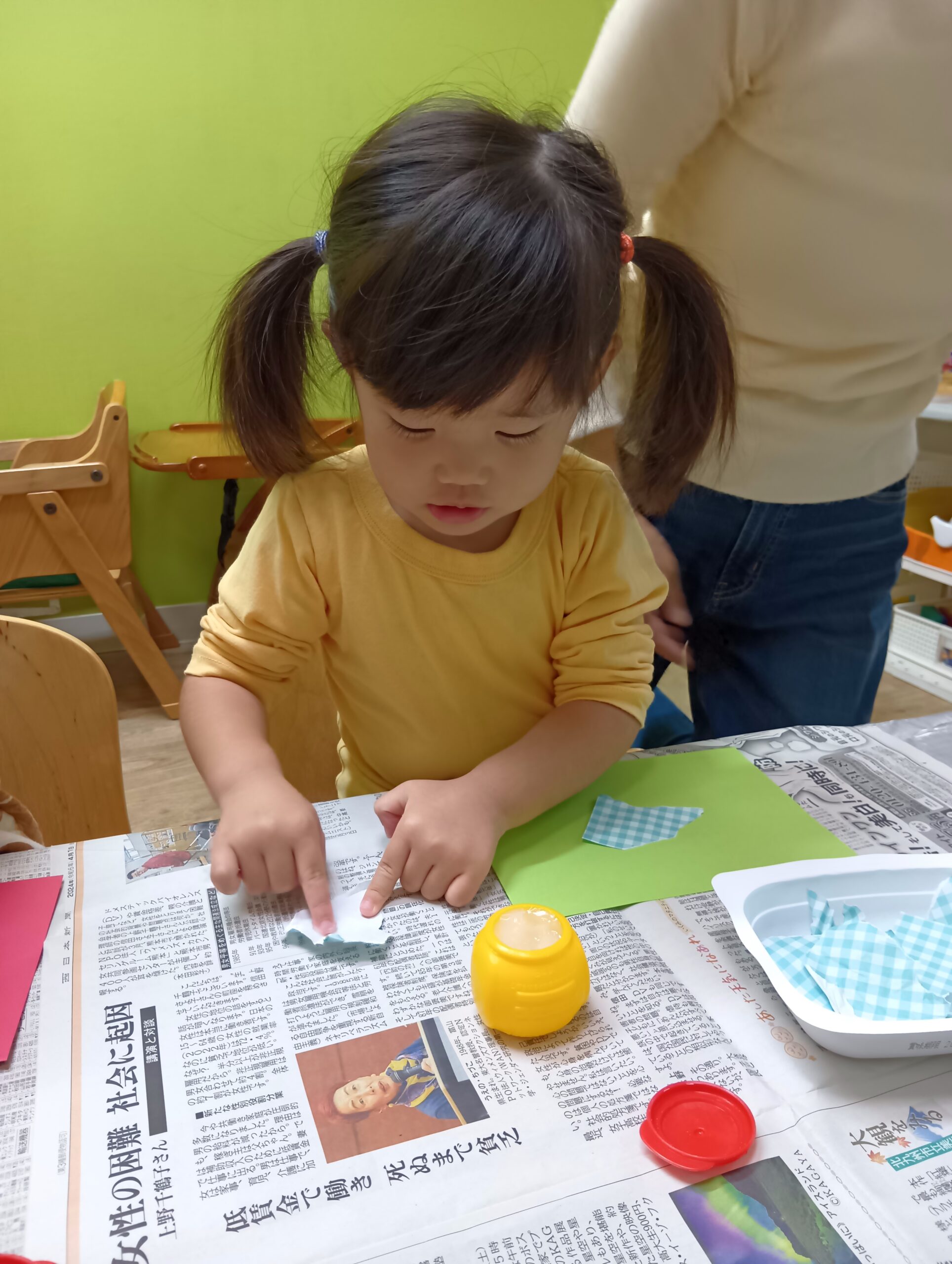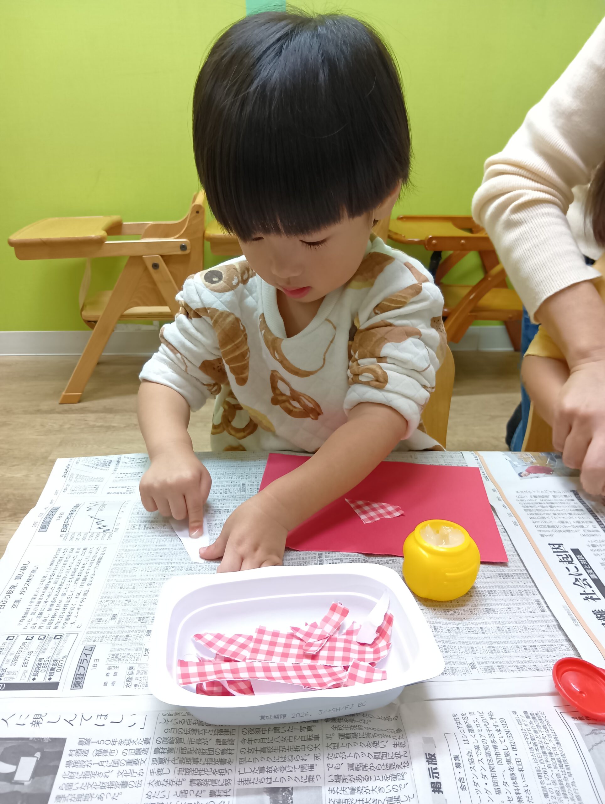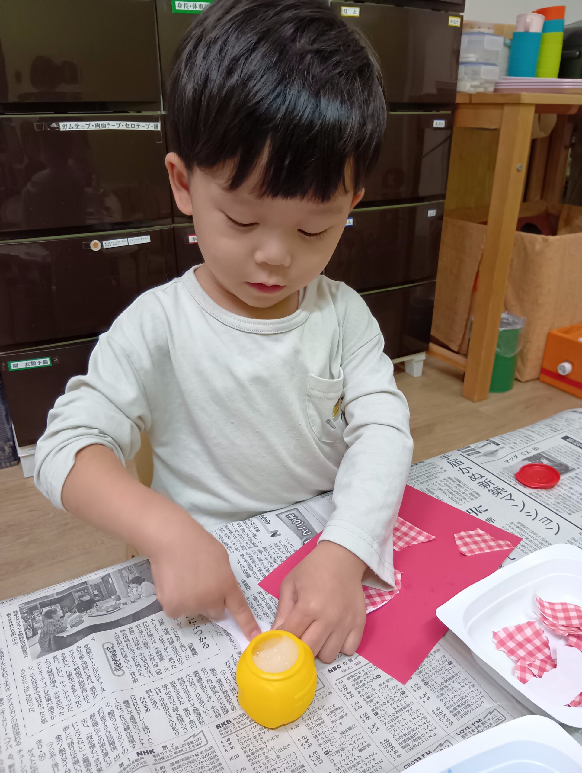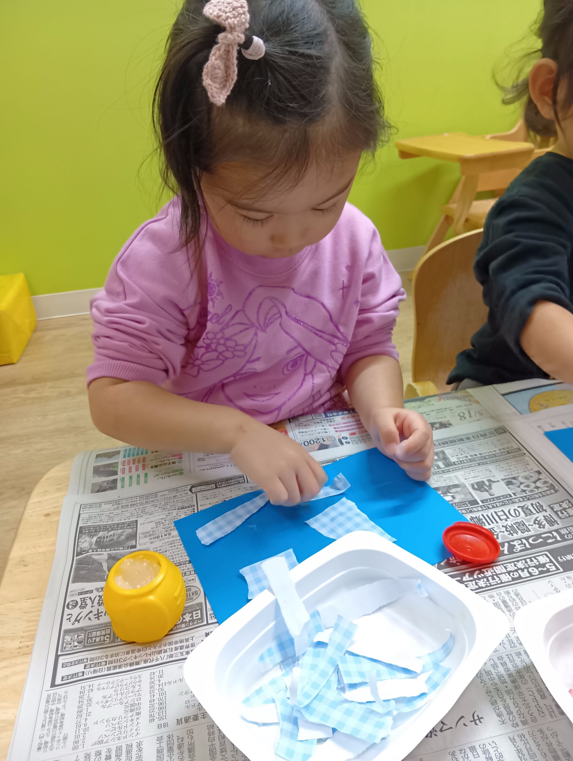 のりづけも初めてでしたが「少しずつとって使ってね」とお話すると、少しずつとり塗れていました♪