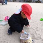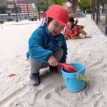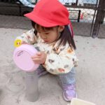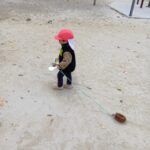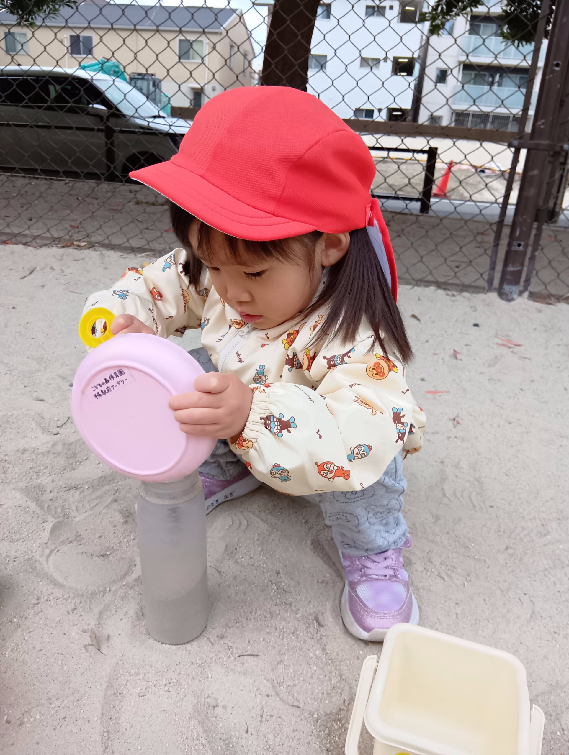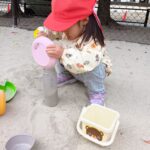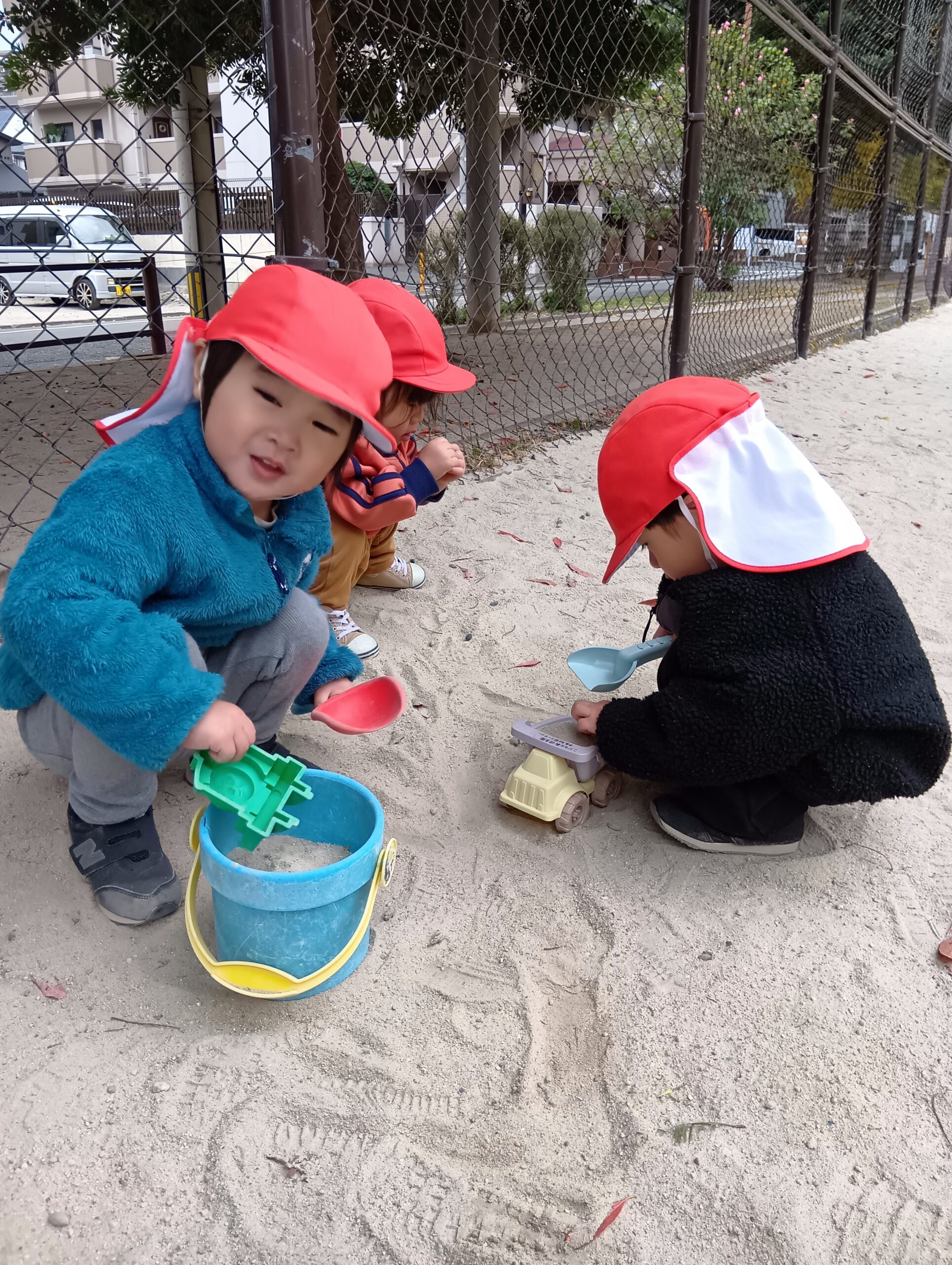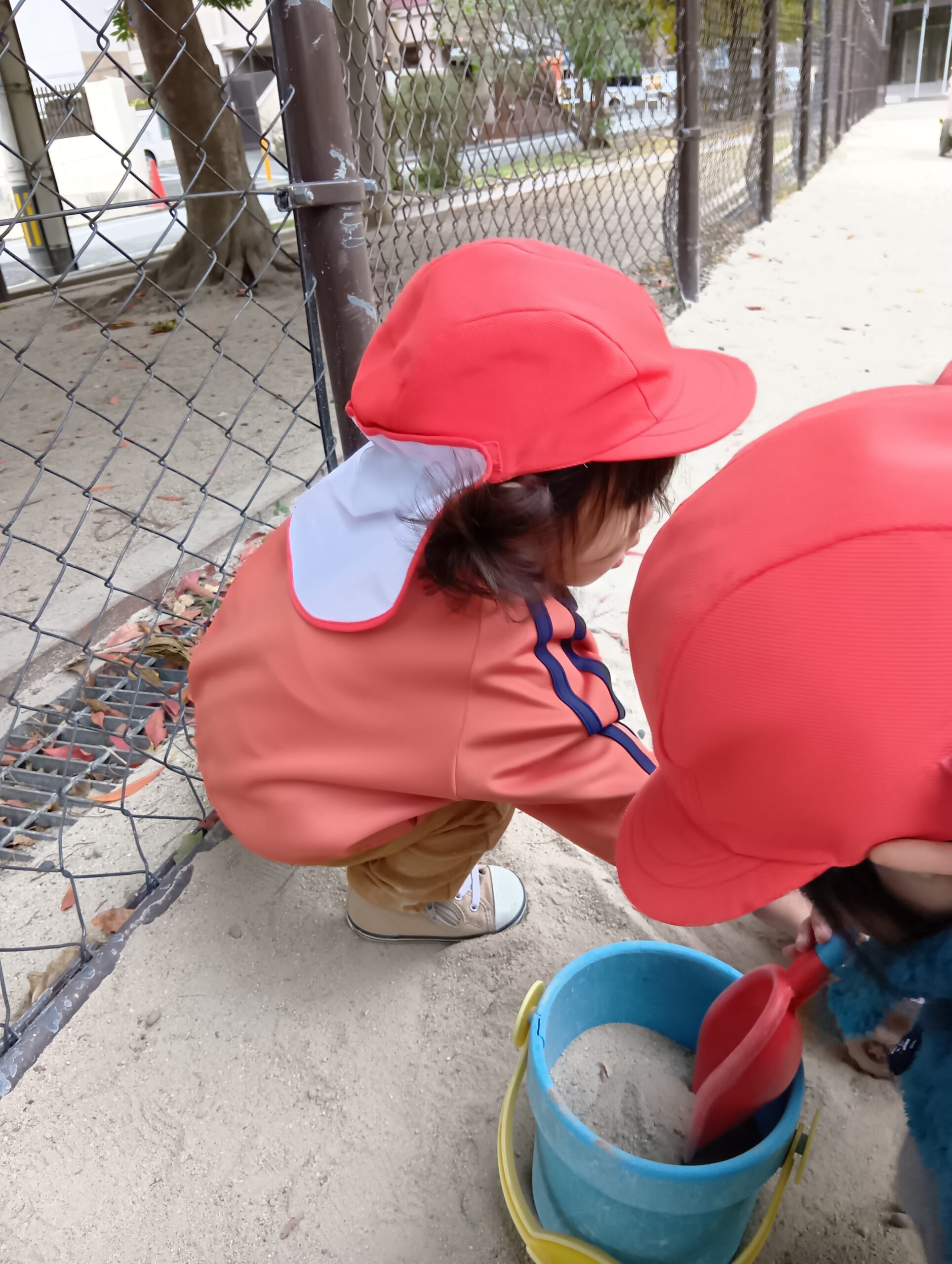 たわしや、砂遊び、落ち葉集めをして楽しんでいた子ども達😊