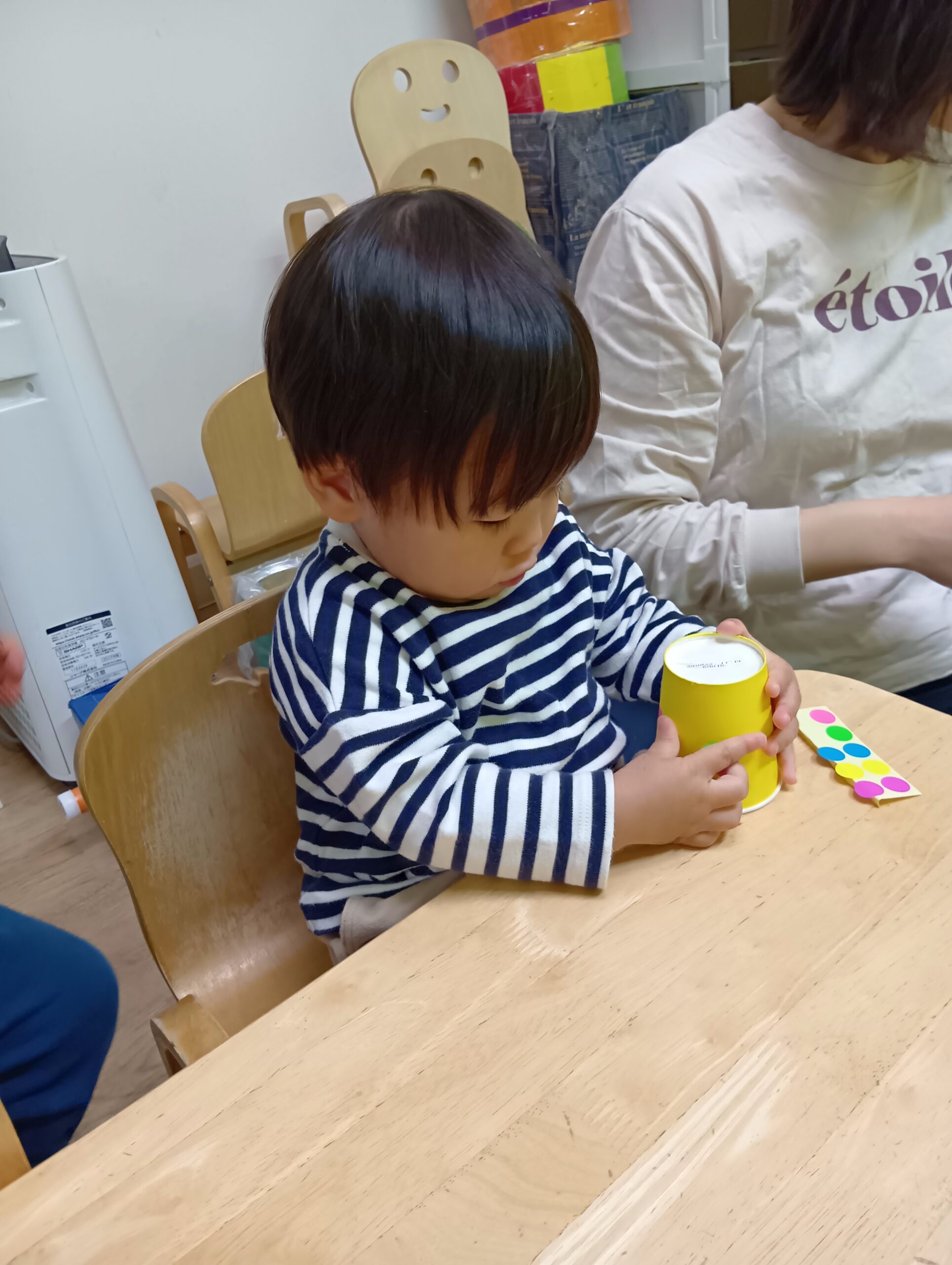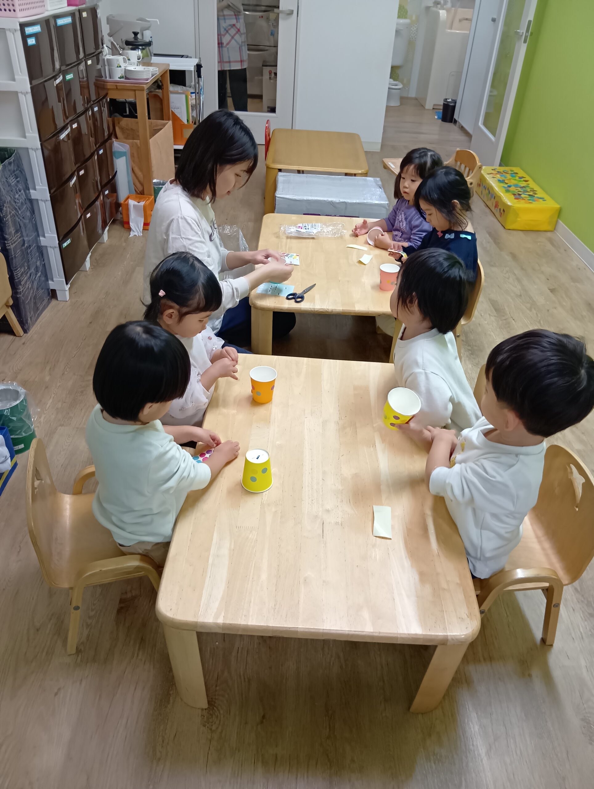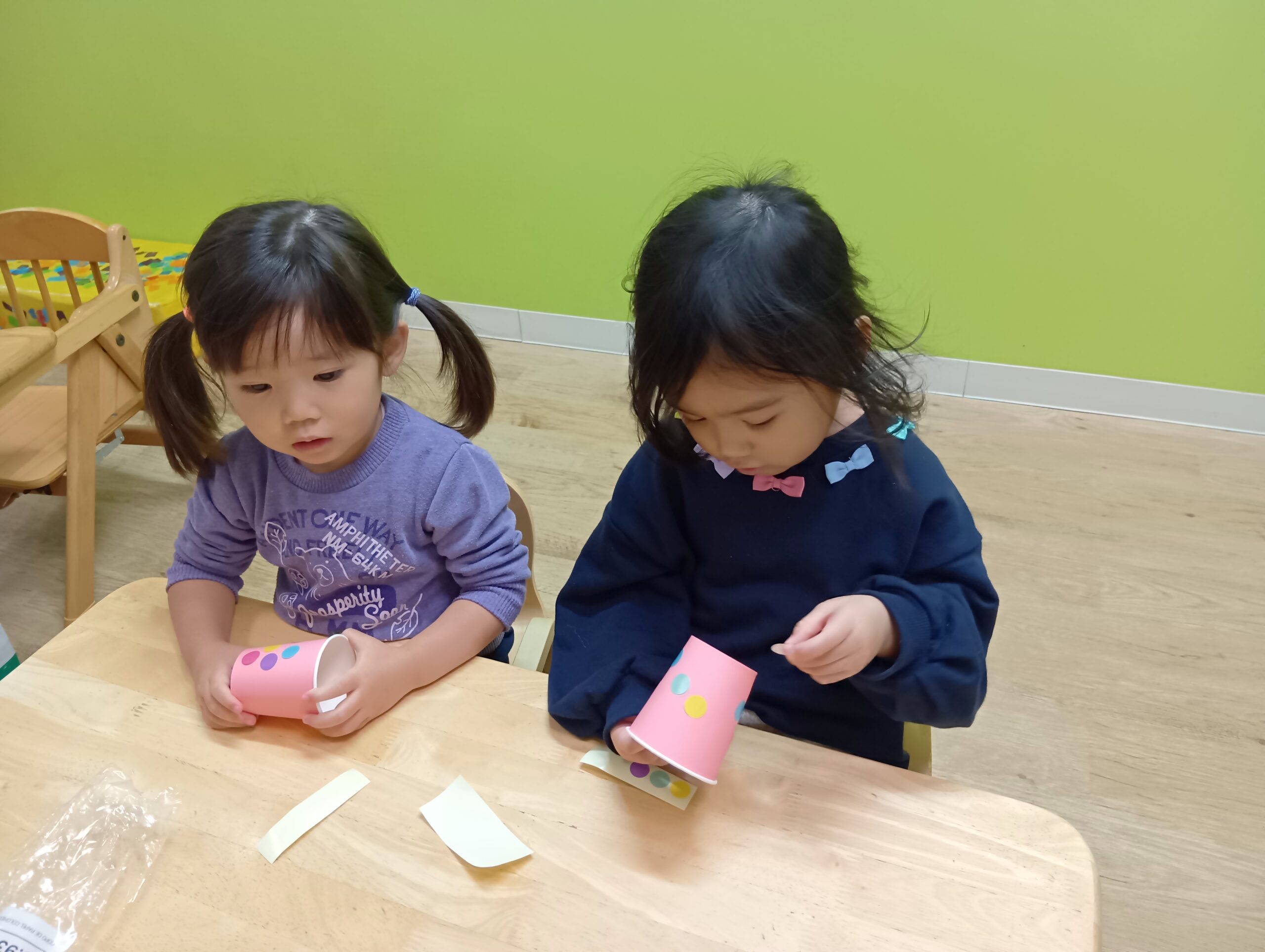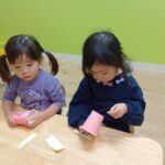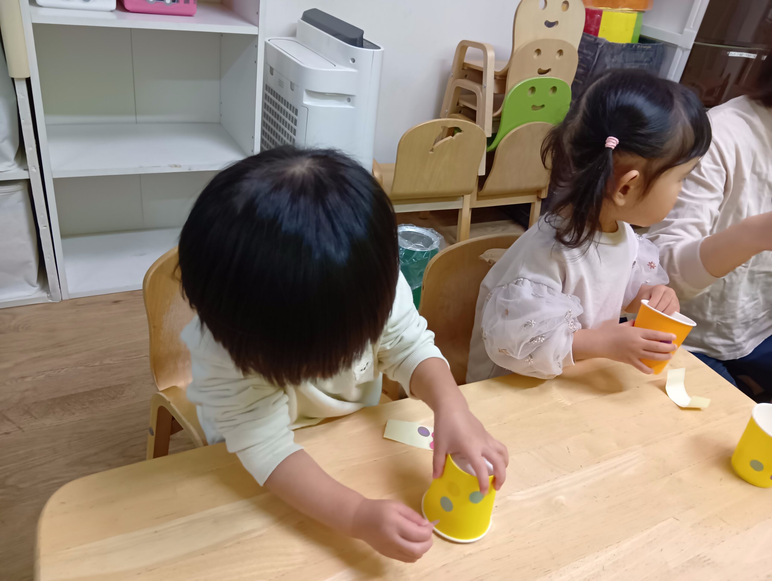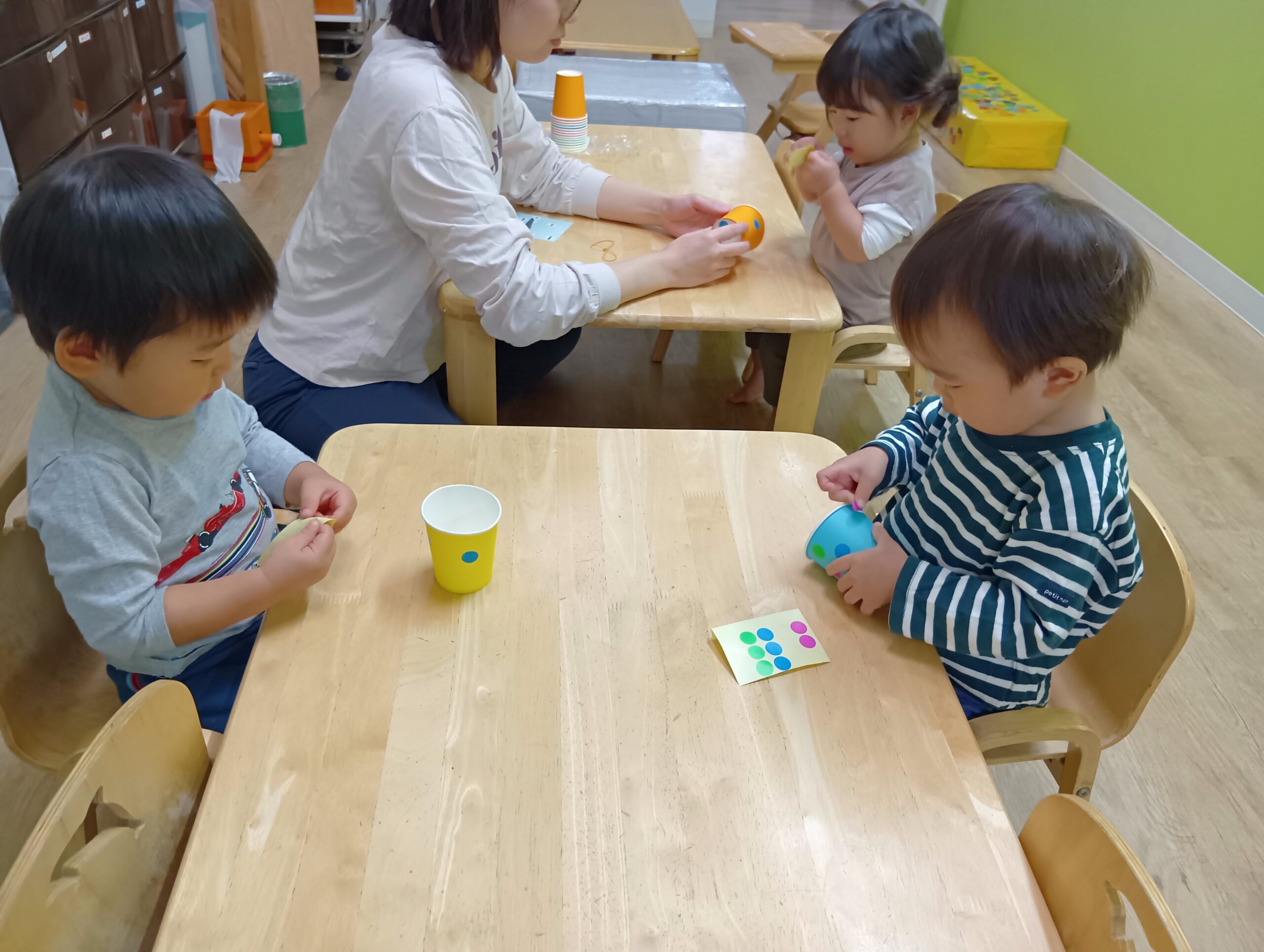 自分たちで好きな色の紙コップを選んで、シールを貼りました!