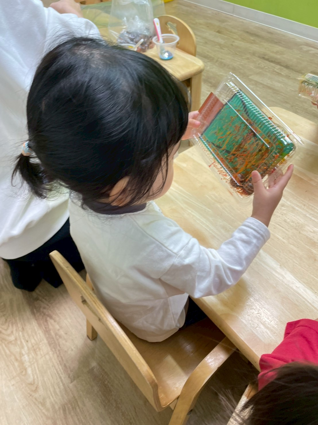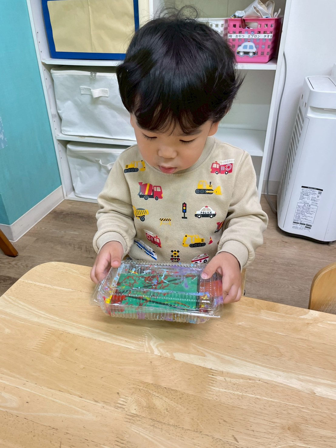 透明の入れ物にツリーの画用紙と色を付けたどんぐりを入れてフリフリ!