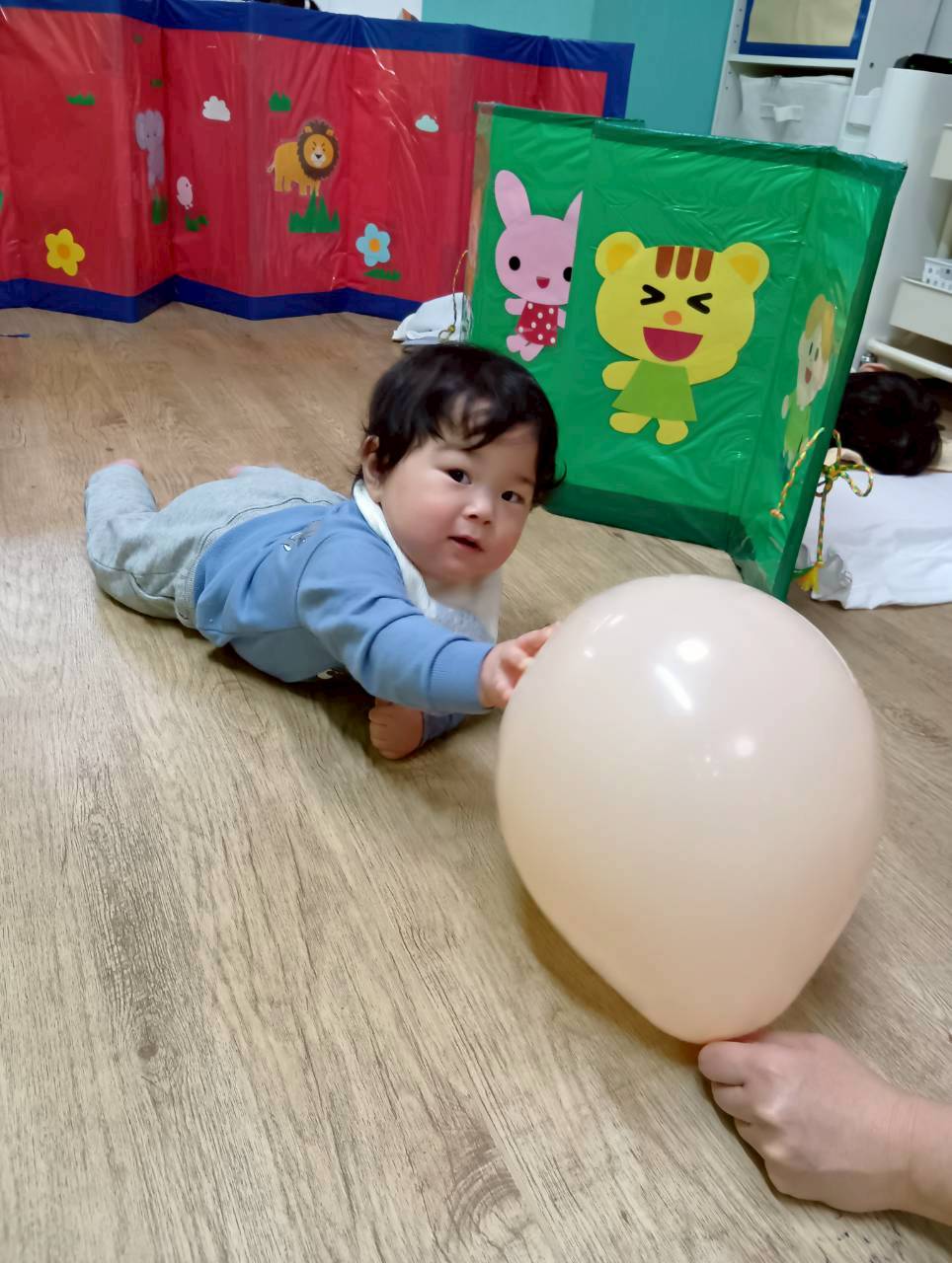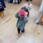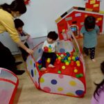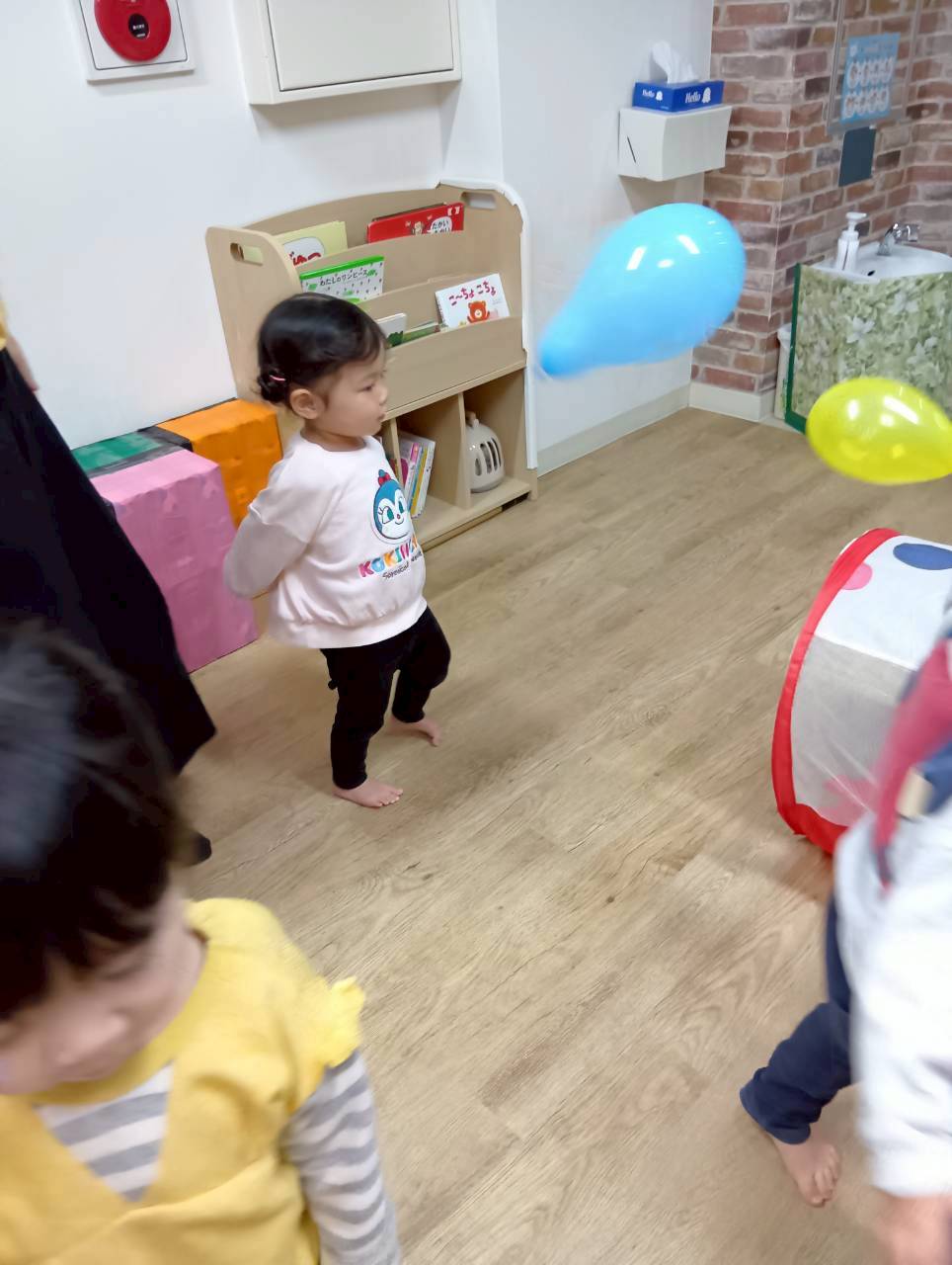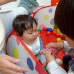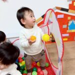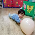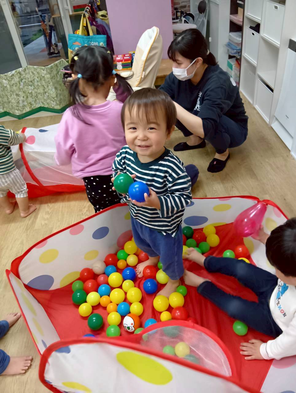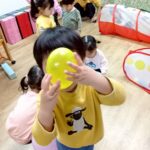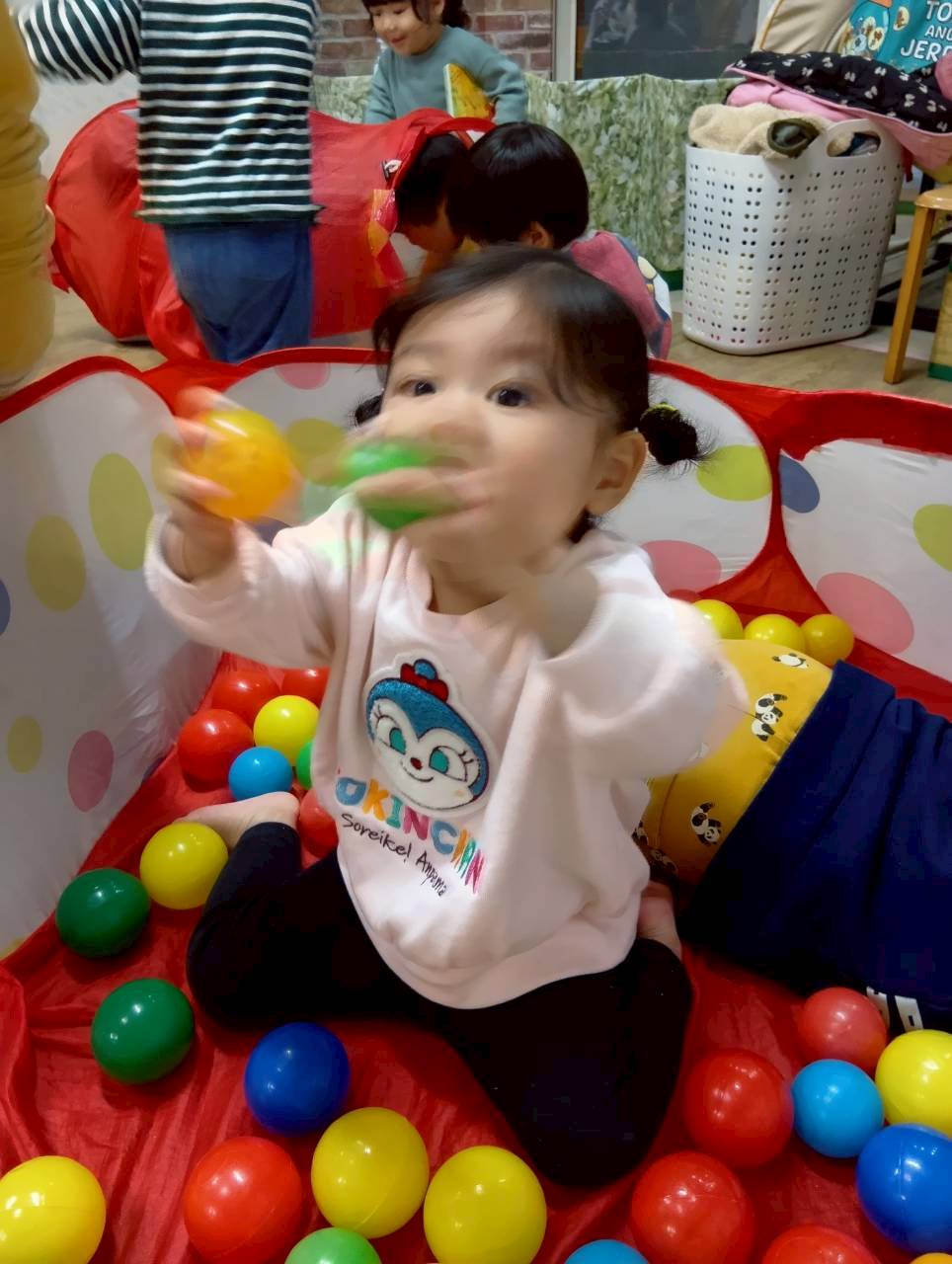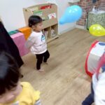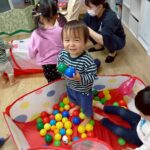 ボールを少し高めのカゴにひたすら入れたり、風船を飛ばしてふわふわと落ちてくる様子をじっと見たりとっても楽しそうでした♩