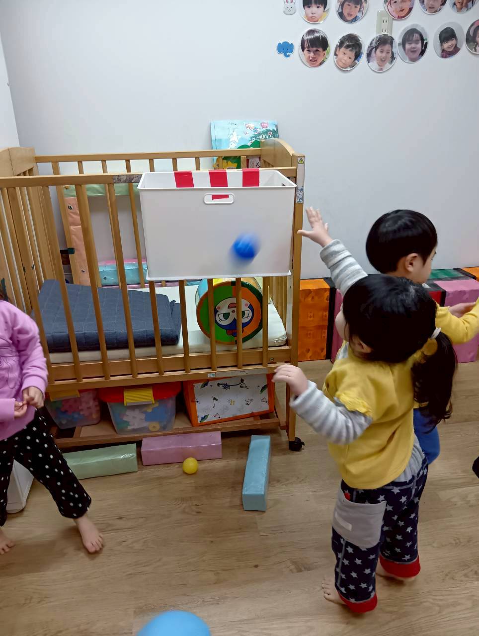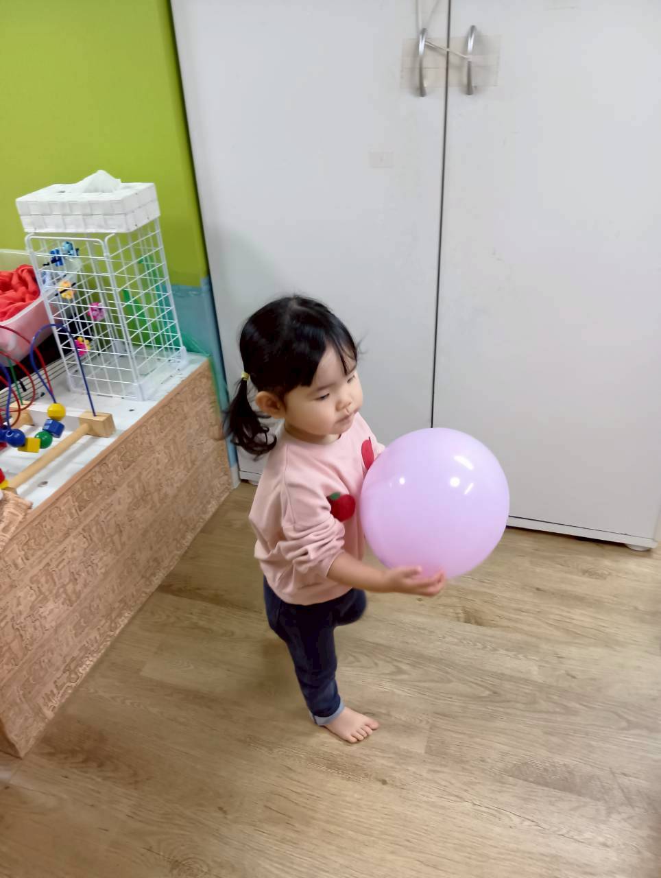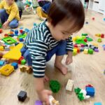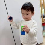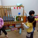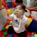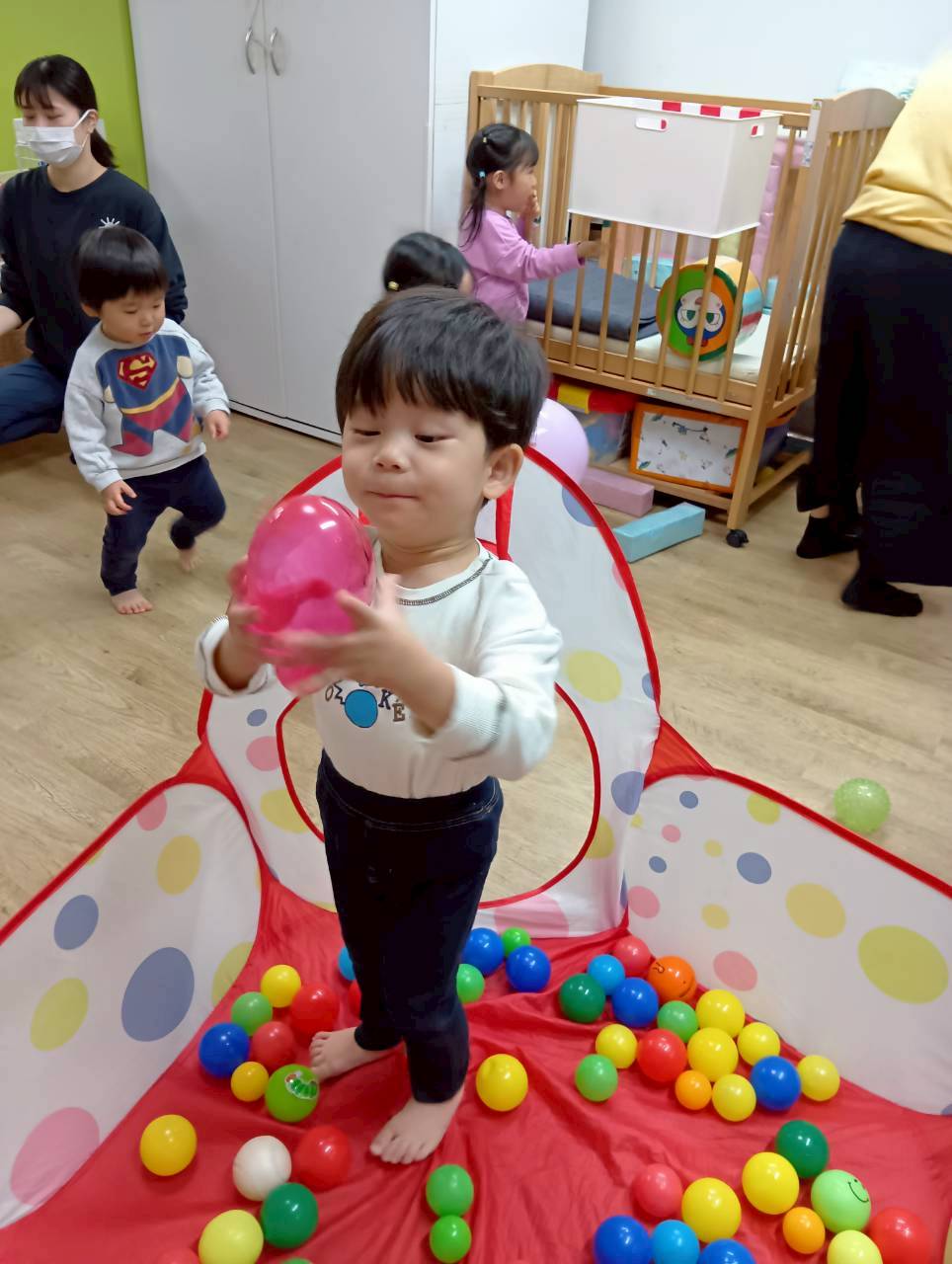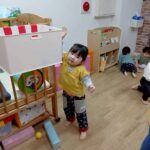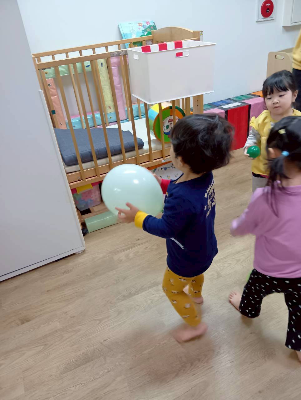 ボールを少し高めのカゴにひたすら入れたり、風船を飛ばしてふわふわと落ちてくる様子をじっと見たりとっても楽しそうでした♩