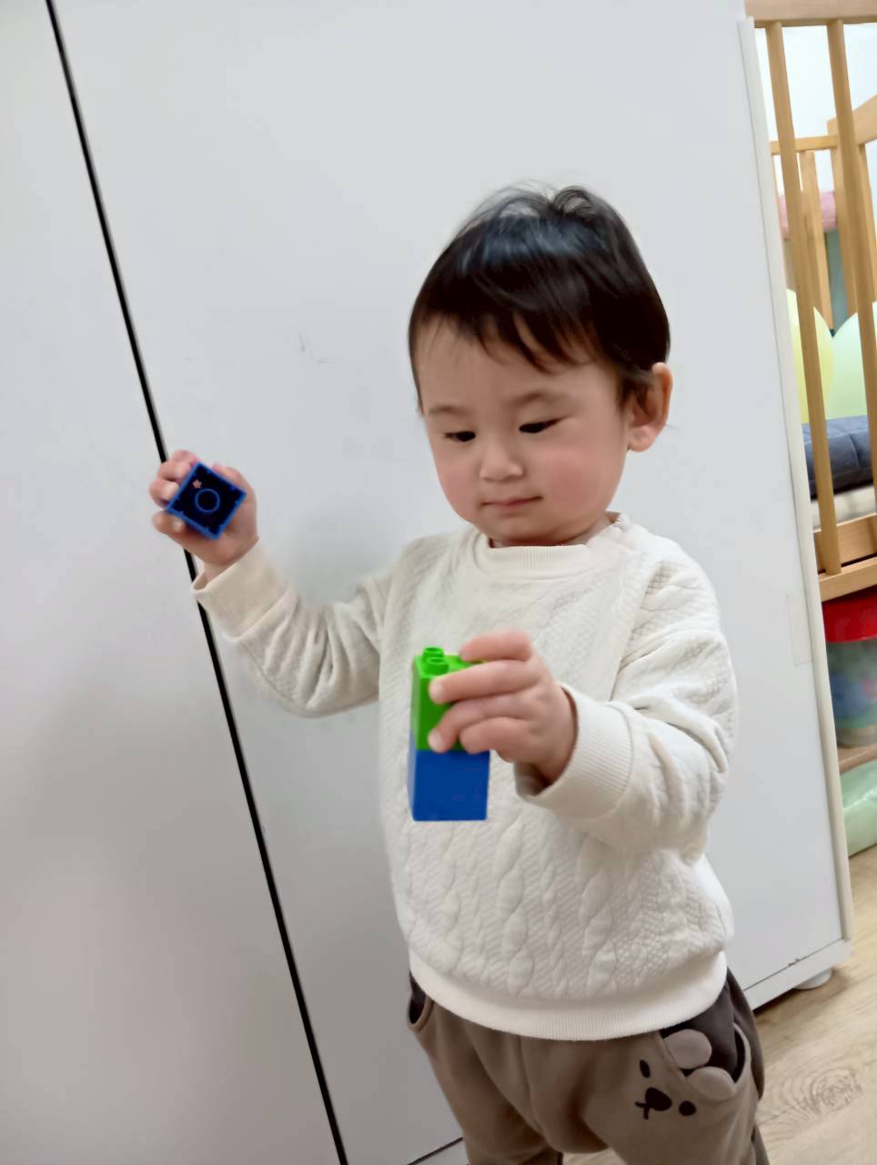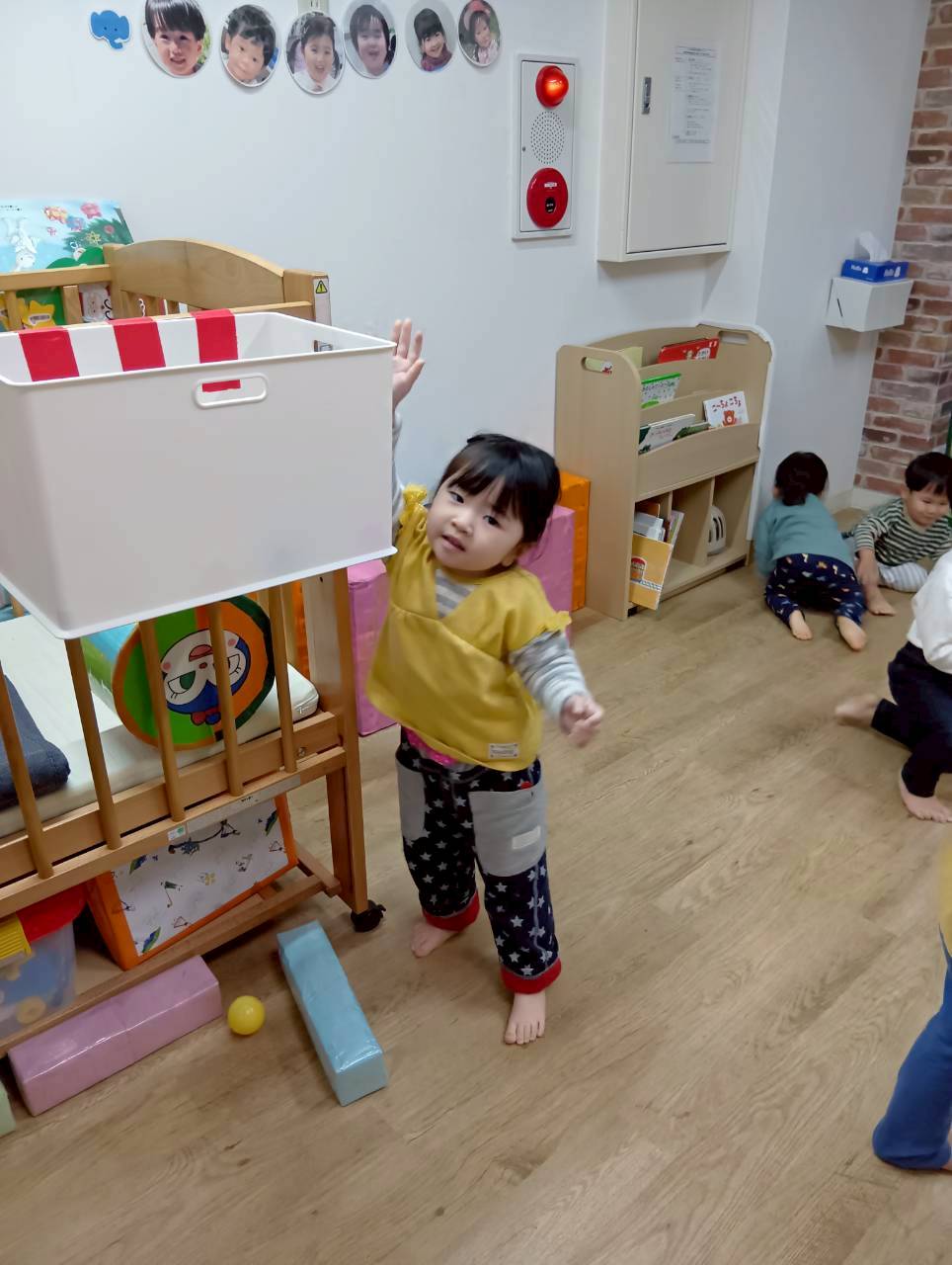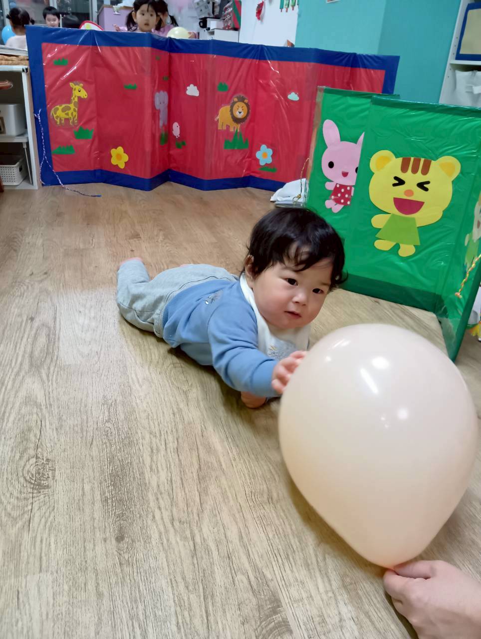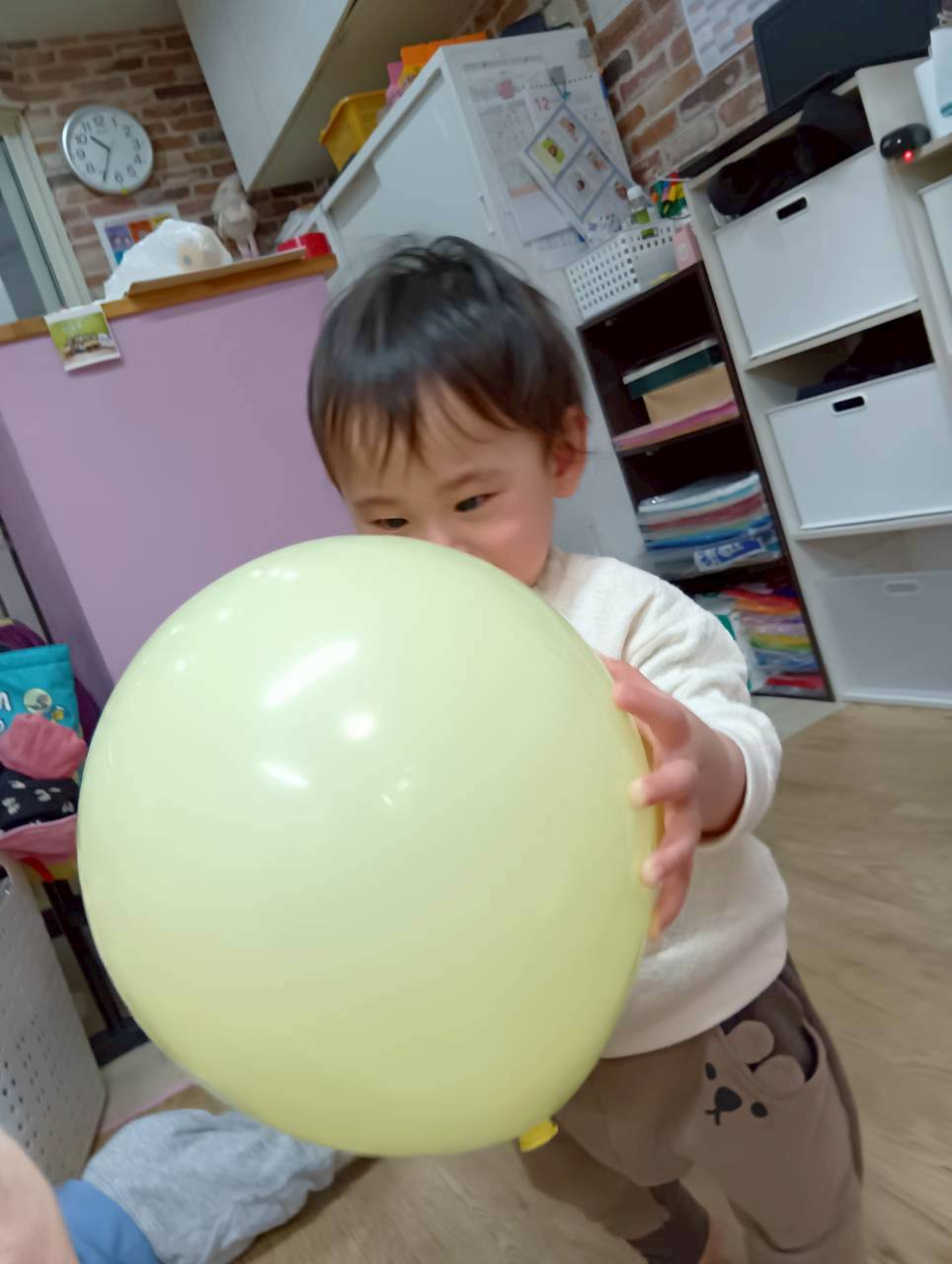ボールを少し高めのカゴにひたすら入れたり、風船を飛ばしてふわふわと落ちてくる様子をじっと見たりとっても楽しそうでした♩