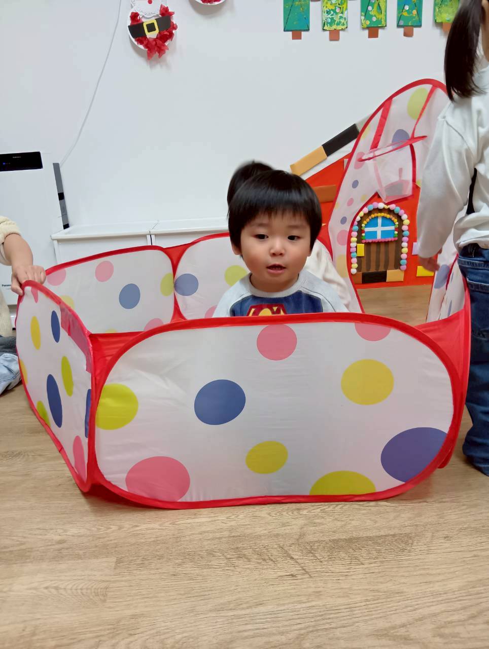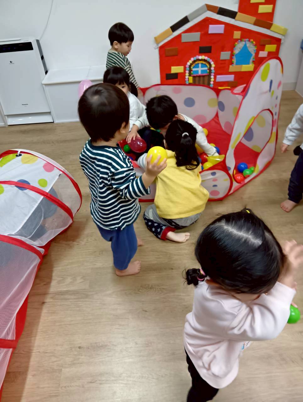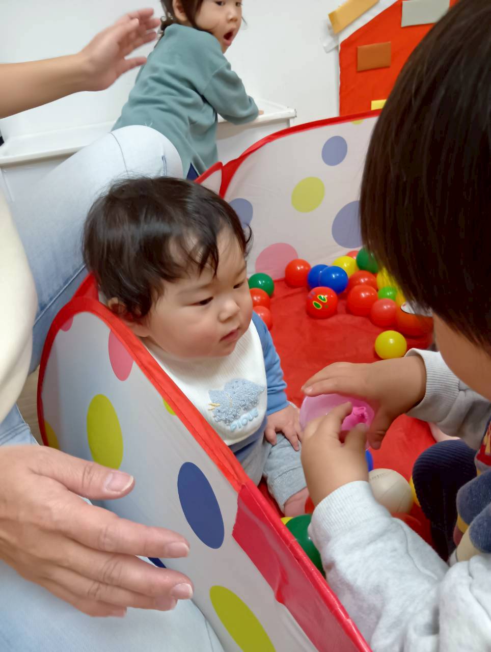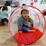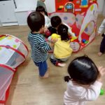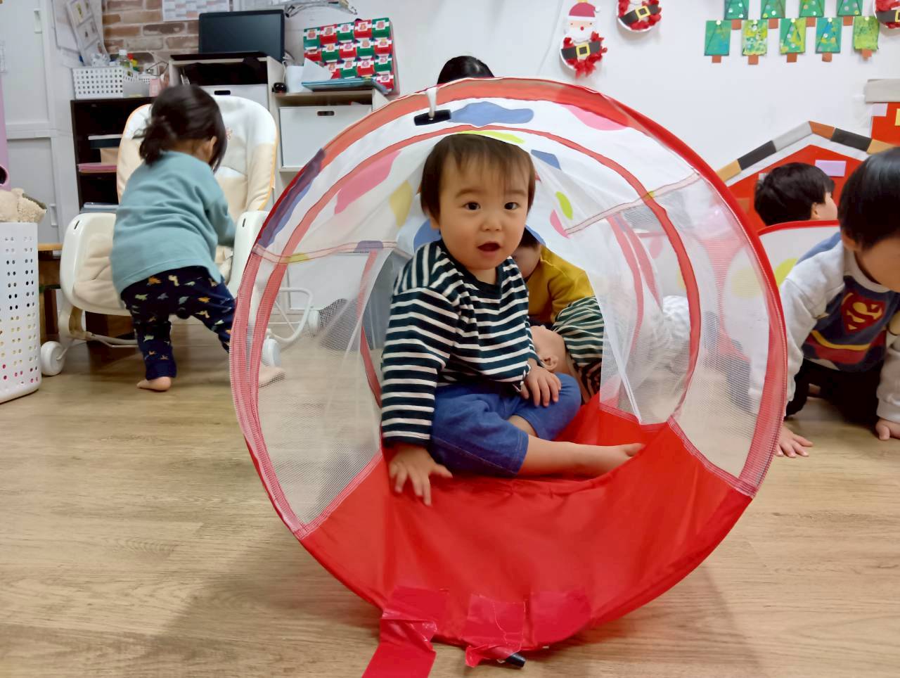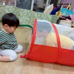 ボールプールと一緒にトンネルも出すと、順番にくぐってみたり、お友達とぎゅうぎゅうになってトンネルの中に入ってみたりと、いろいろな楽しみ方をしていましたよ😄