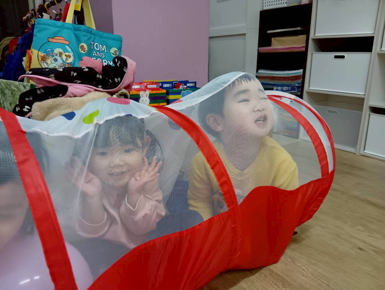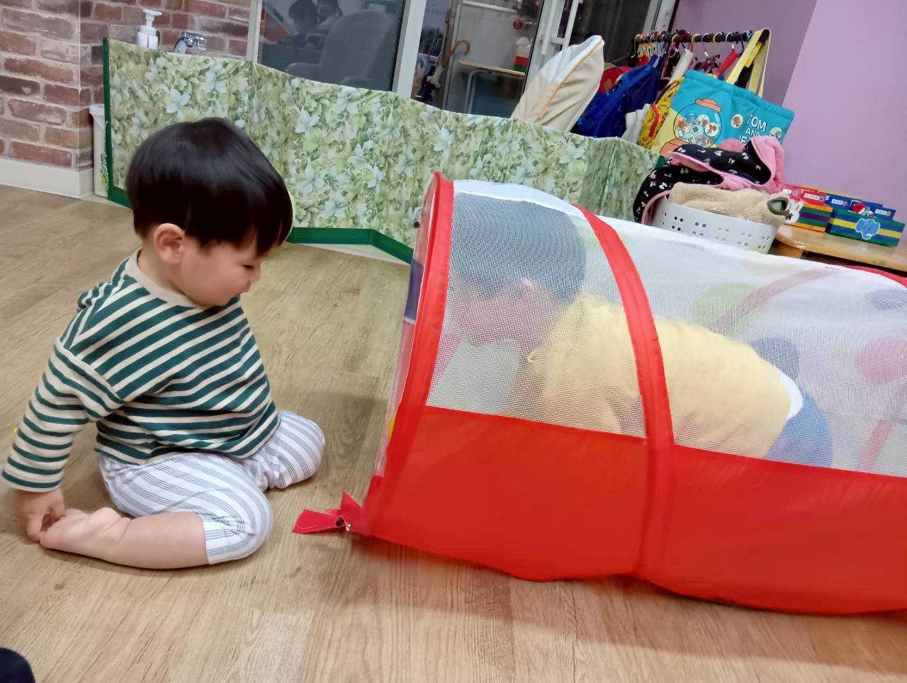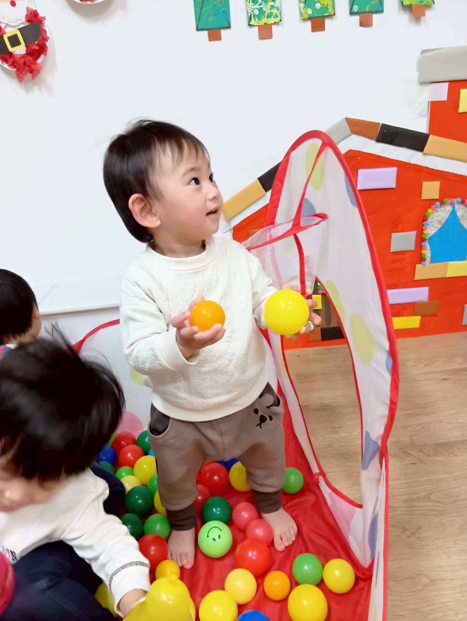 ボールプールと一緒にトンネルも出すと、順番にくぐってみたり、お友達とぎゅうぎゅうになってトンネルの中に入ってみたりと、いろいろな楽しみ方をしていましたよ😄