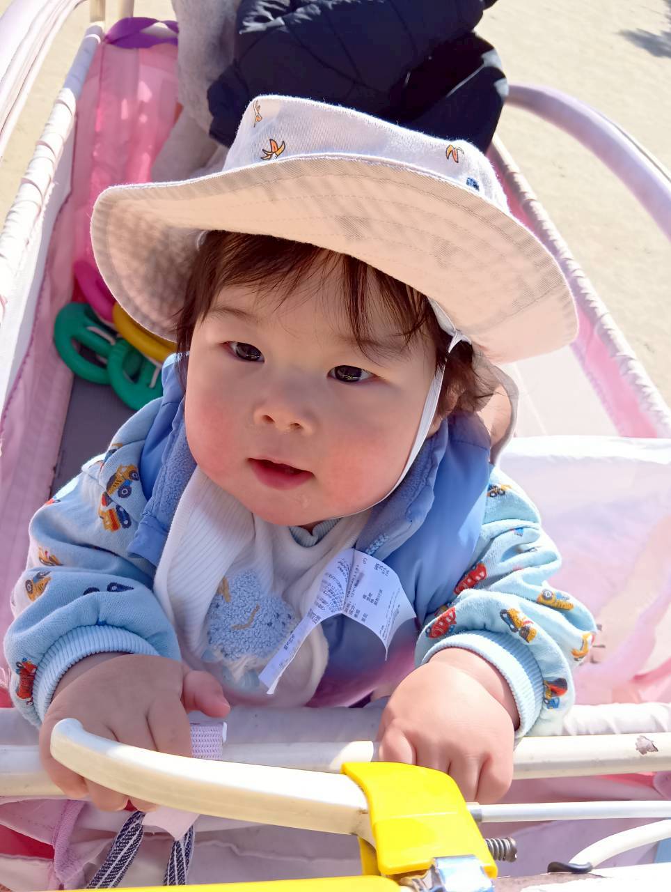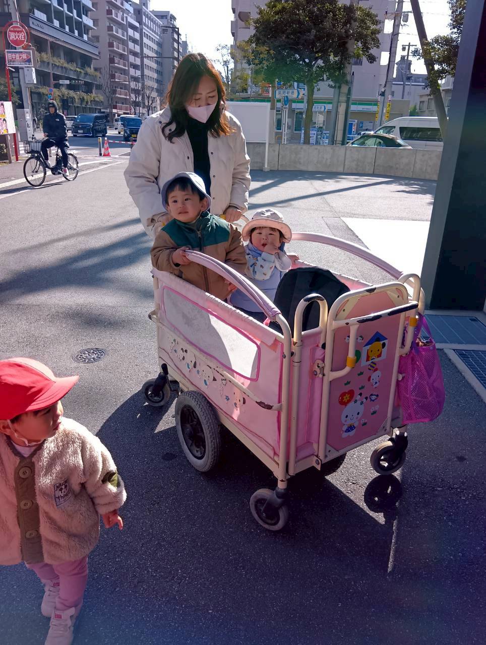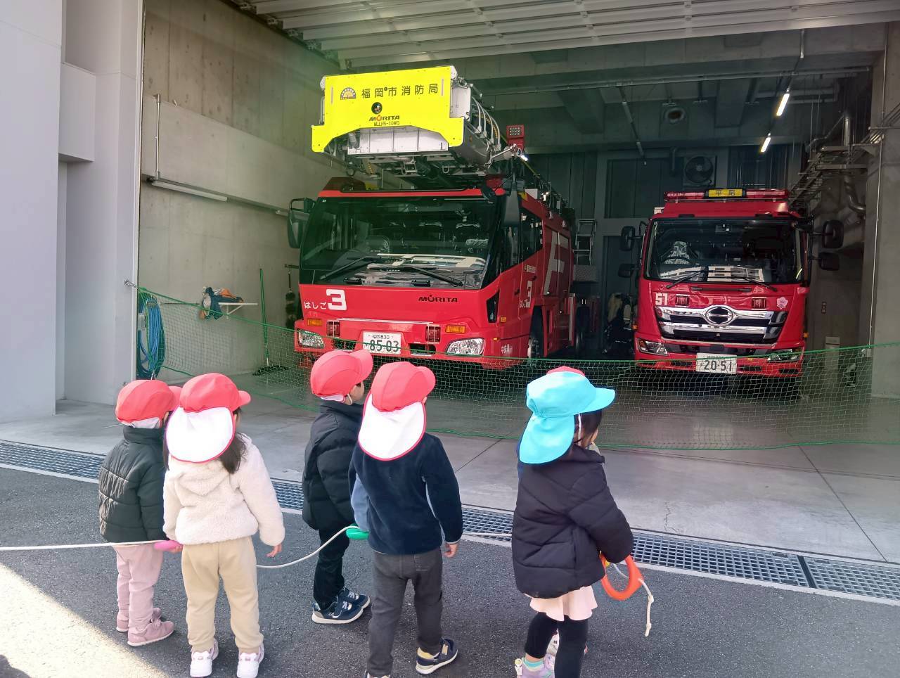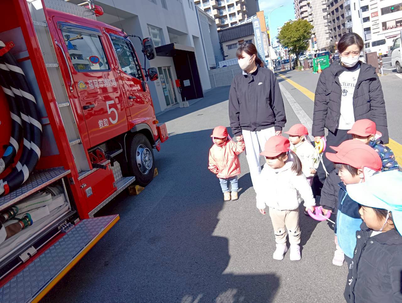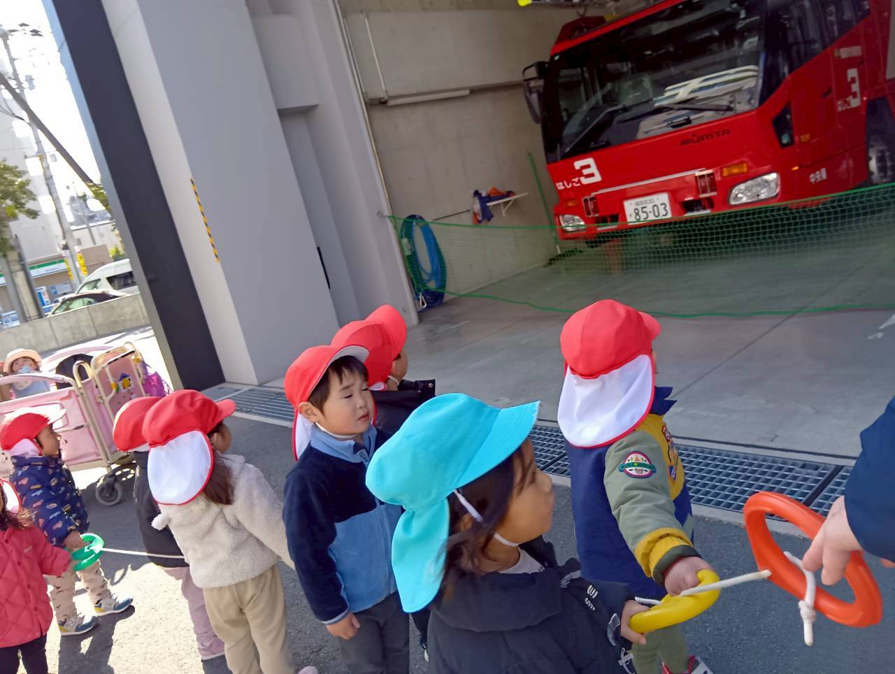 大きなはしご消防車が止まっていて、「大きいねぇ」と見上げたり、指をさしながら興味津々で見たりしていましたよ🚒
