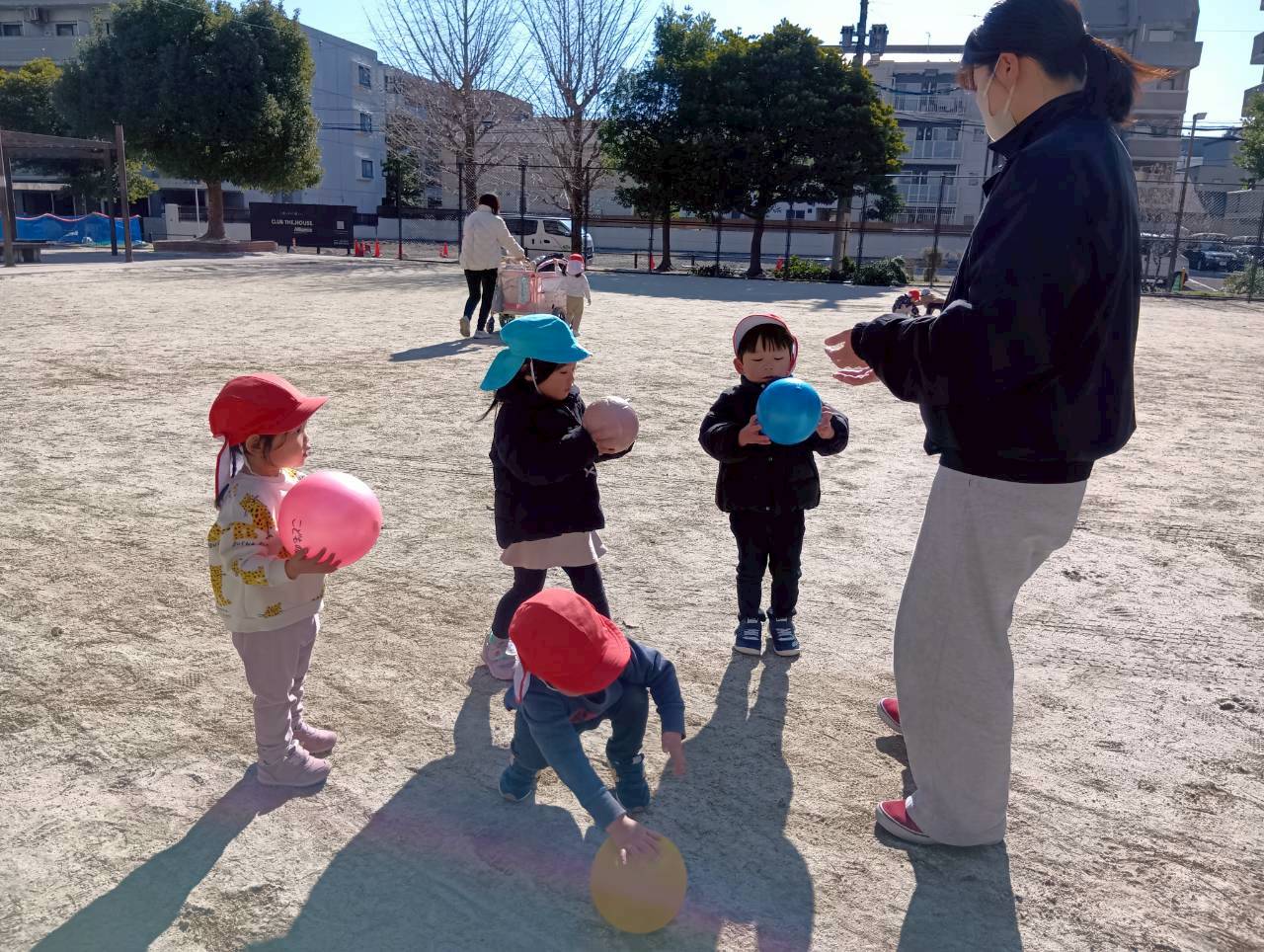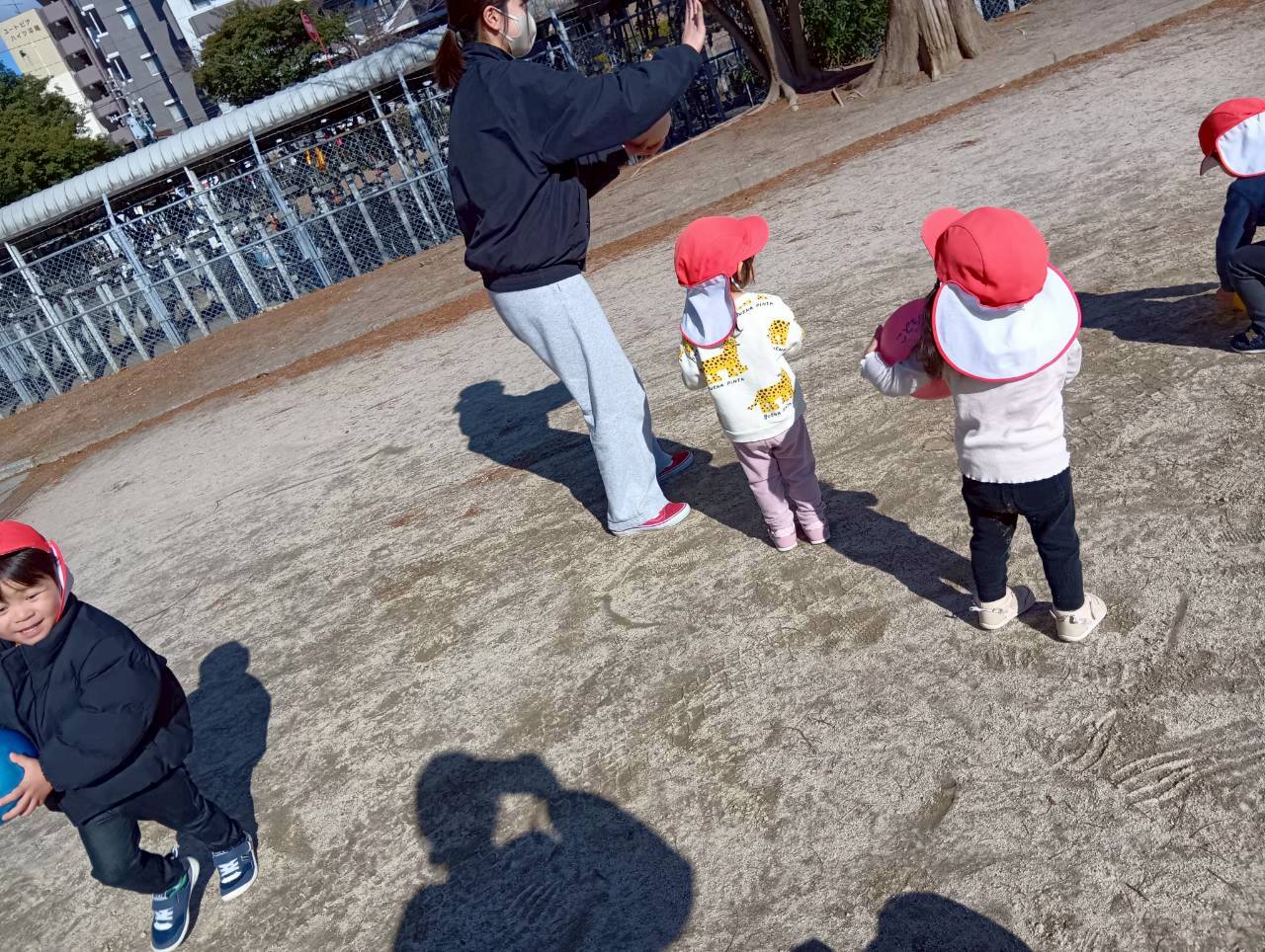 お友達と手をつないで並んで公園内を歩いた後、先生と追いかけっこをしたり、ボールで遊んだりしました🏃