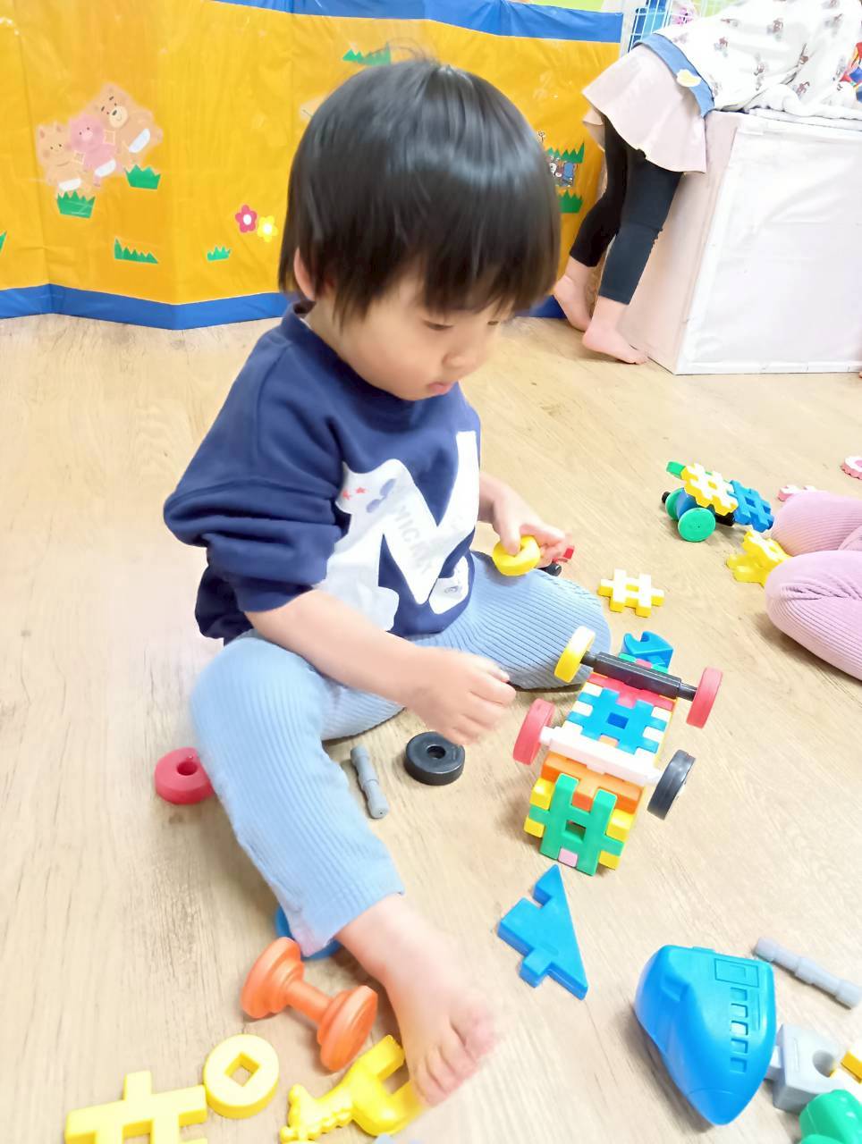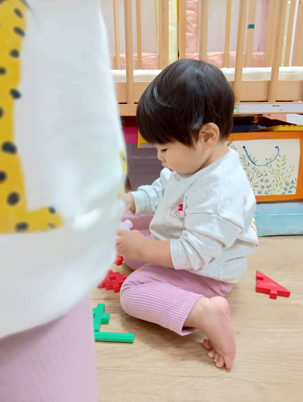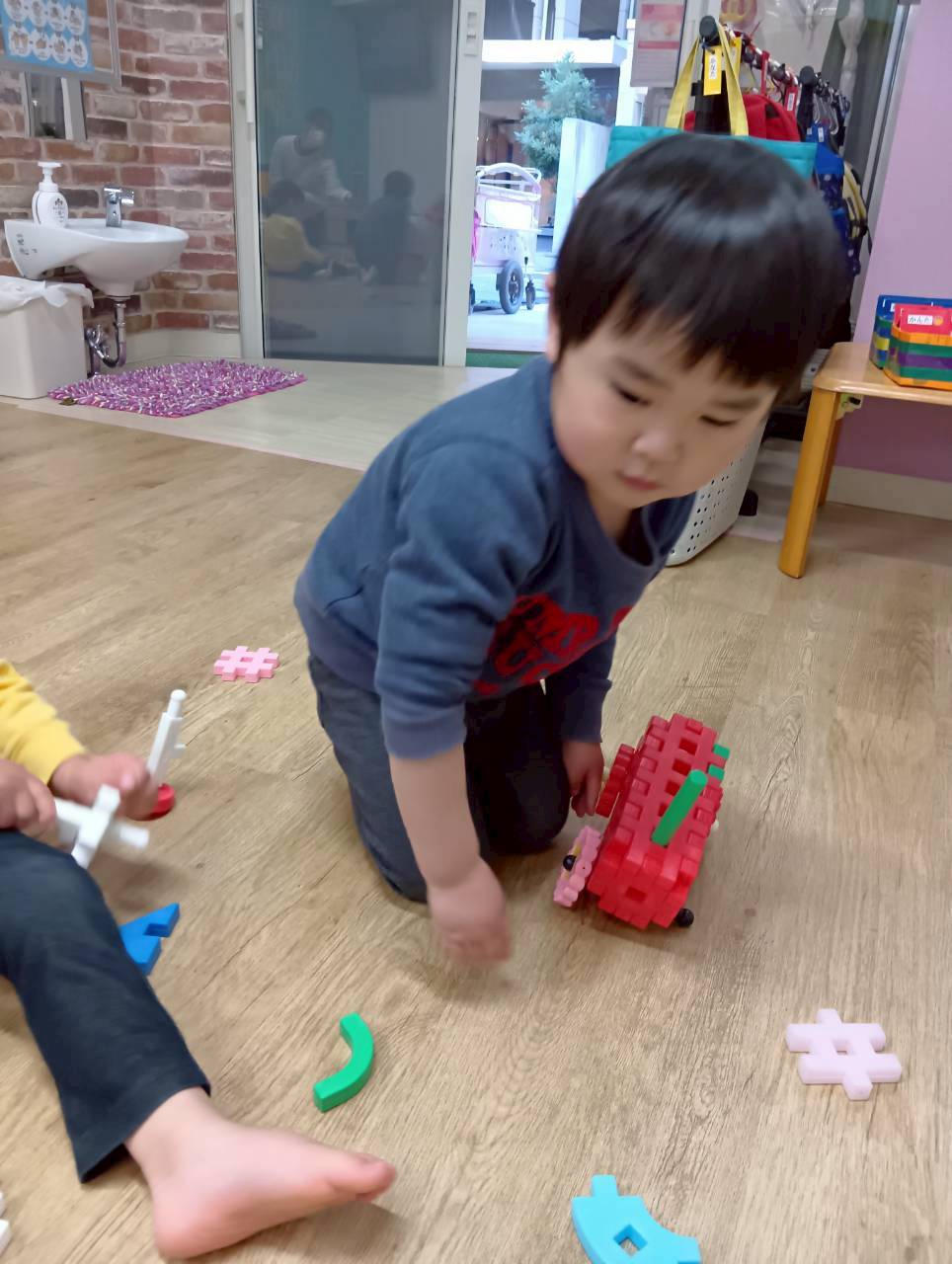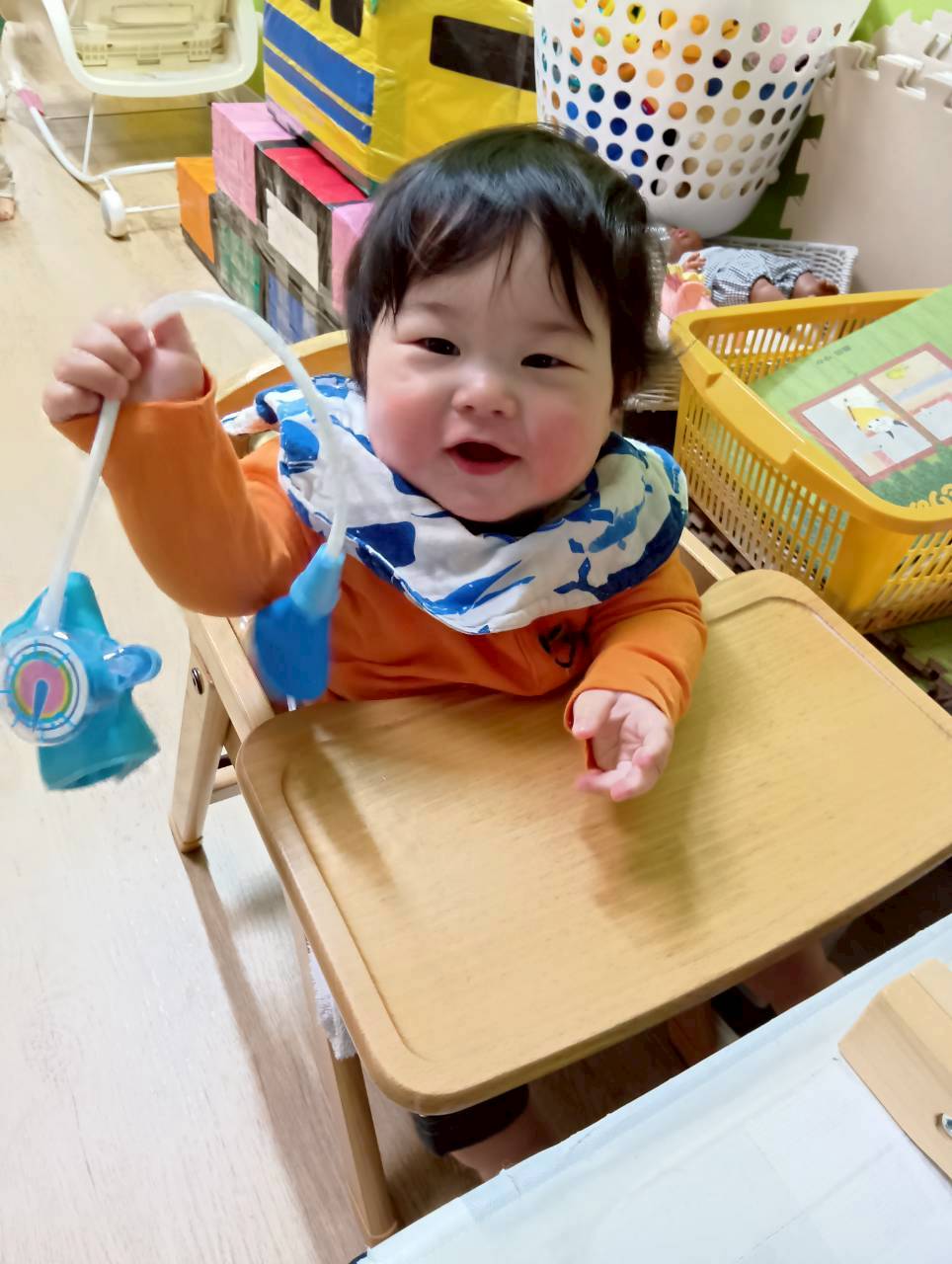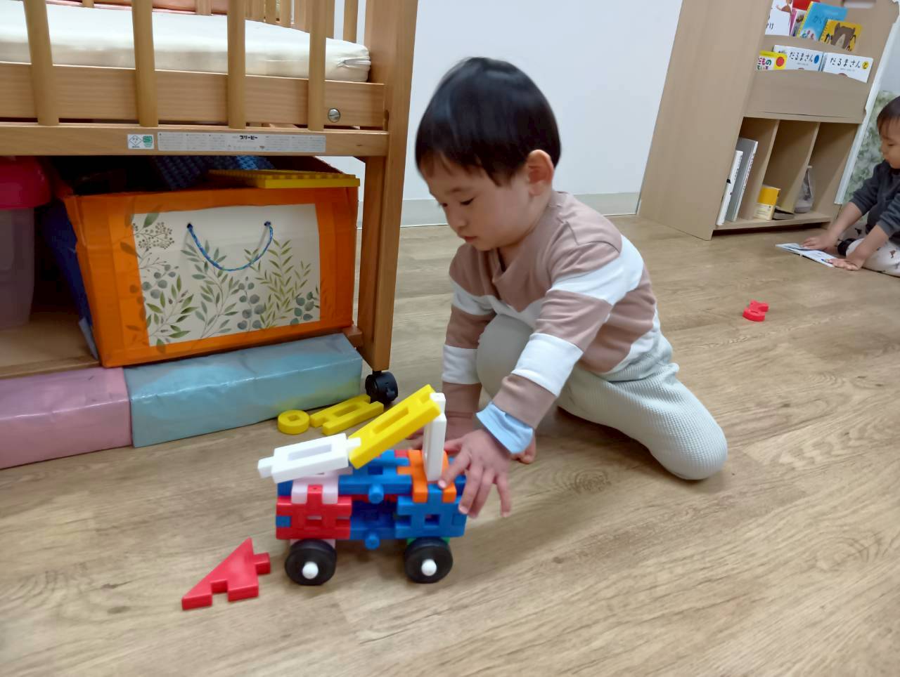 お部屋に戻ってからも少し遊び、給食の準備ができたことを知らせると早く食べたくて大喜びで片づけ始めていましたよ🧸