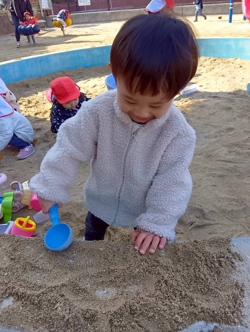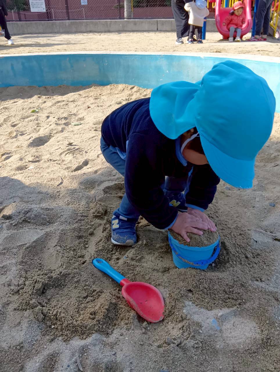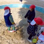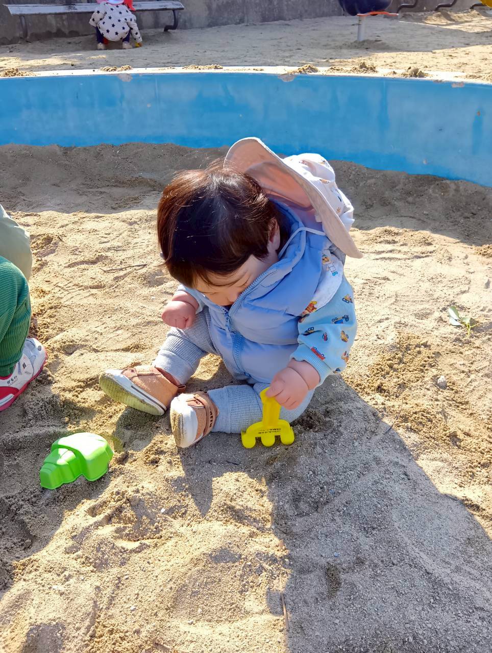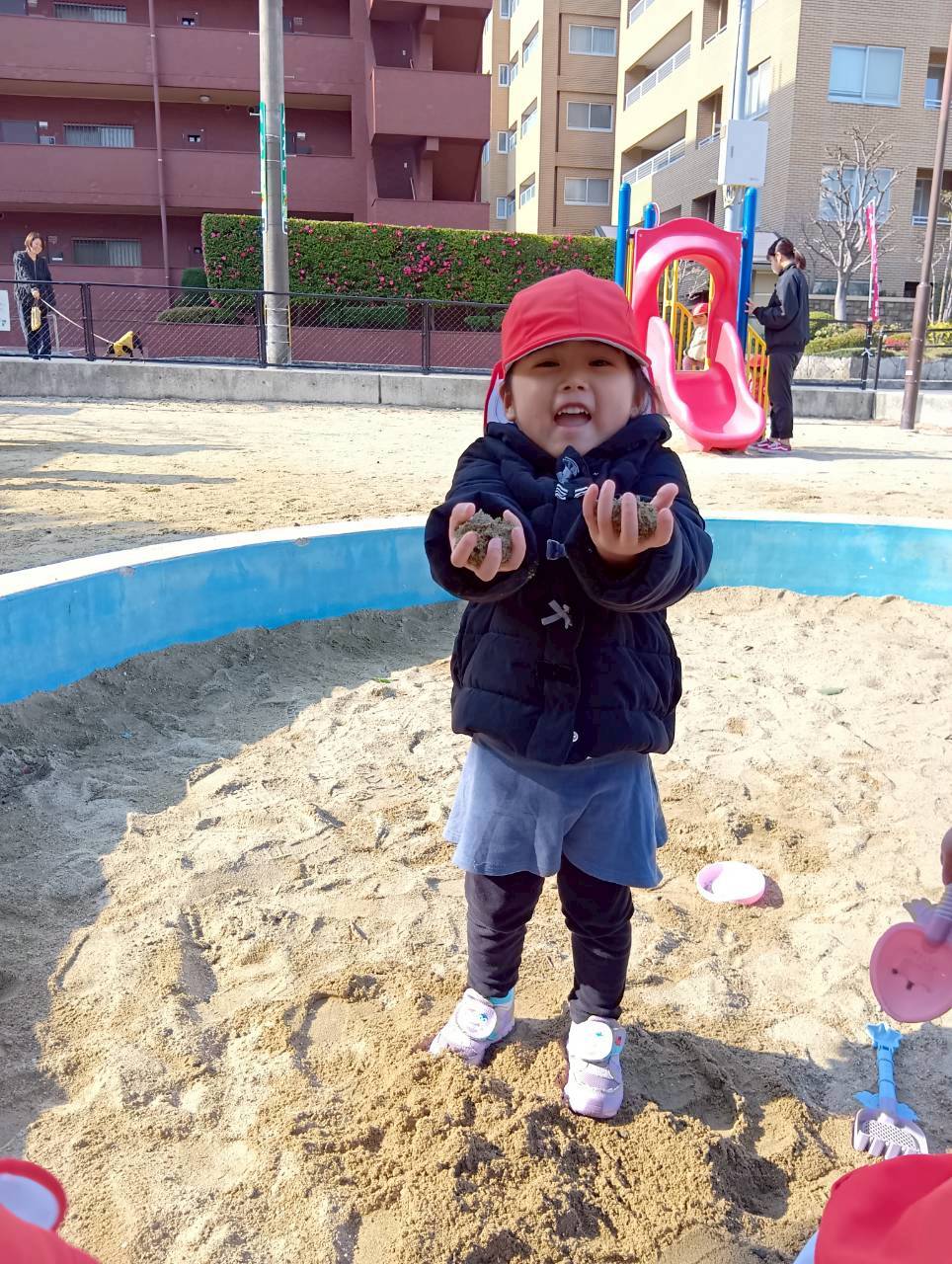 お砂場ではお友達と協力して高い山を作ったり、カップにお砂を入れて「アイスクリーム!」と食べさせに来てくれたり🍦