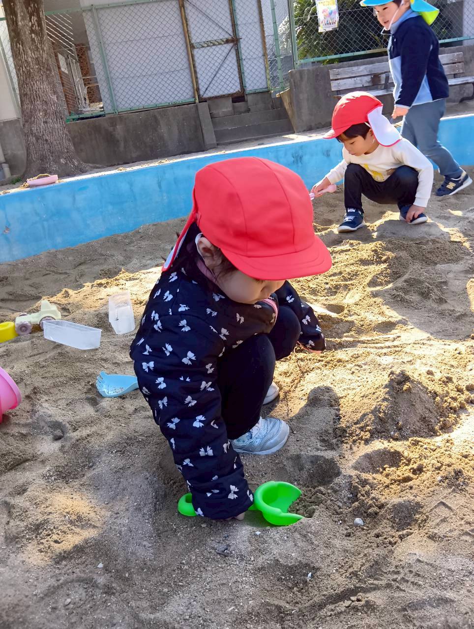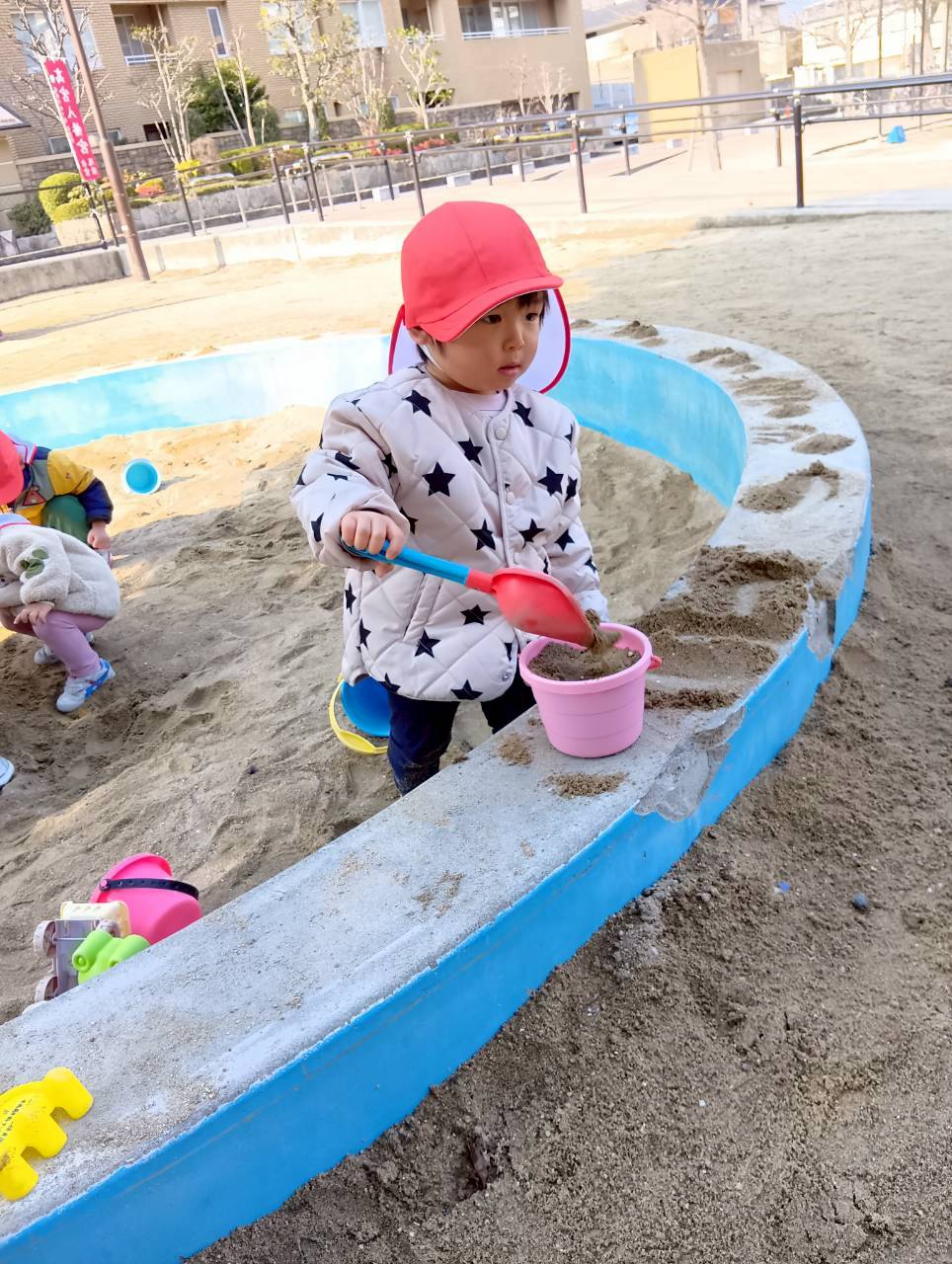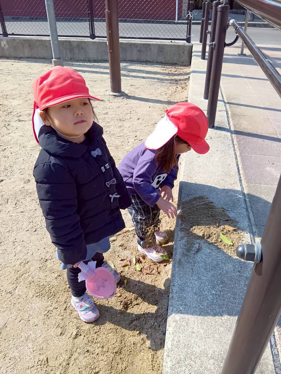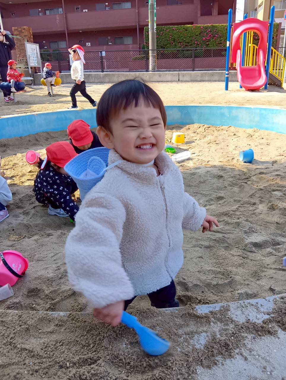 お砂場ではお友達と協力して高い山を作ったり、カップにお砂を入れて「アイスクリーム!」と食べさせに来てくれたり🍦
