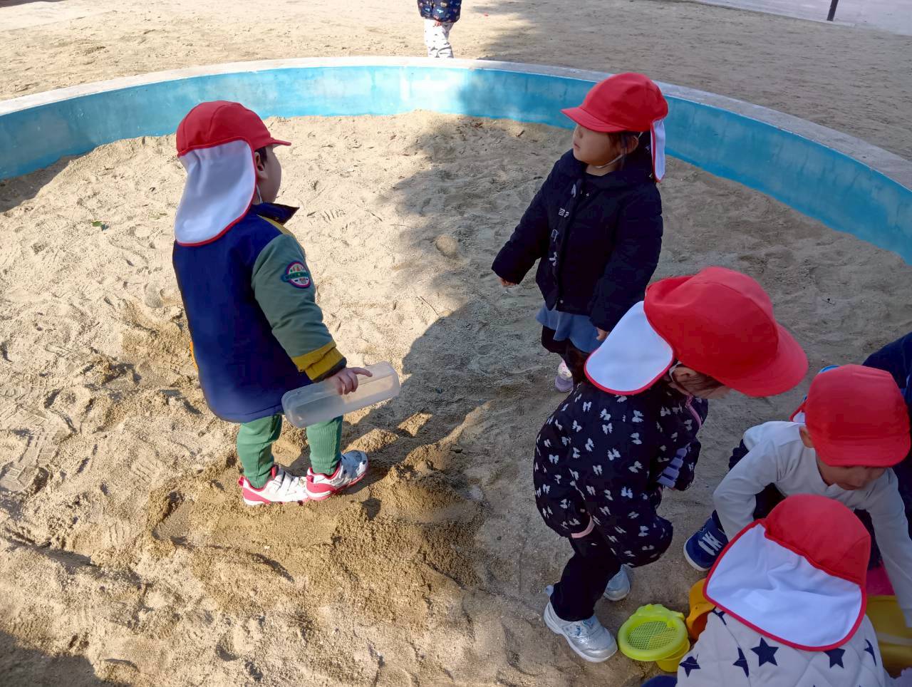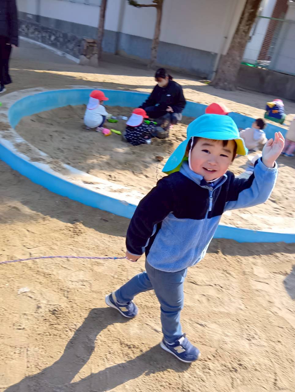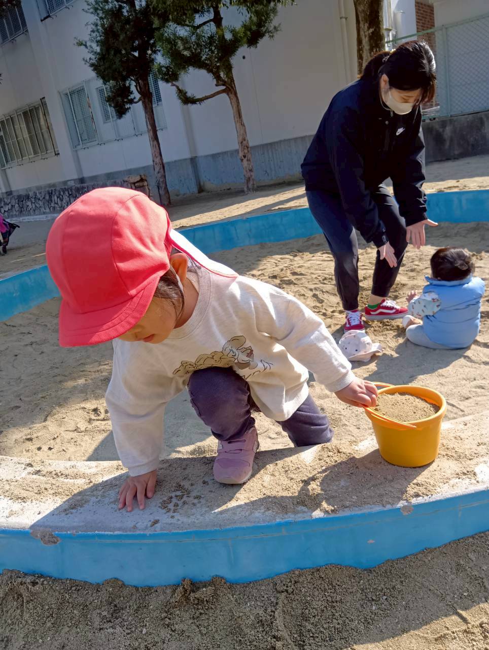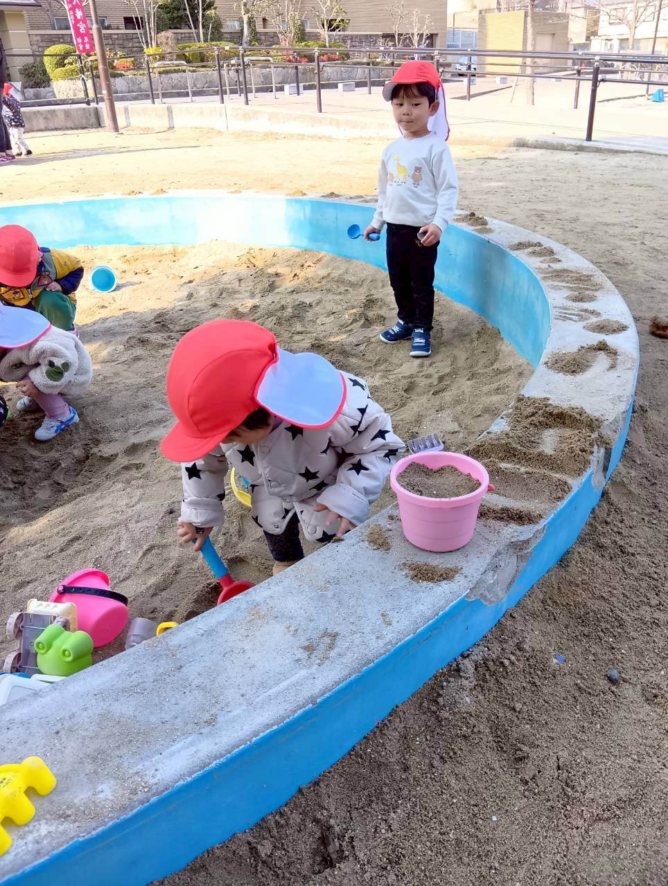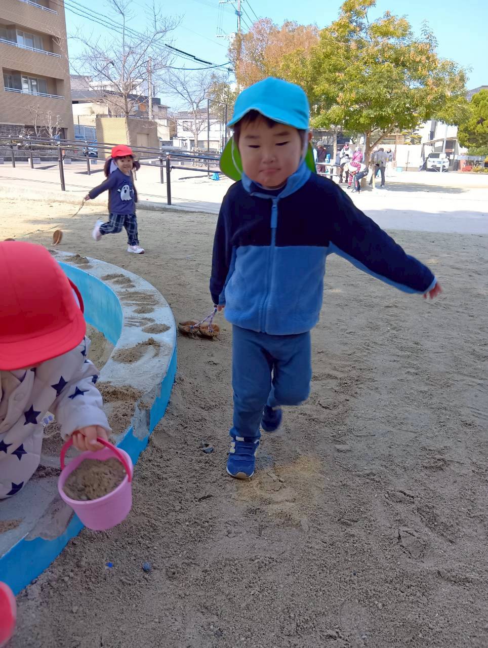 お砂場ではお友達と協力して高い山を作ったり、カップにお砂を入れて「アイスクリーム!」と食べさせに来てくれたり🍦