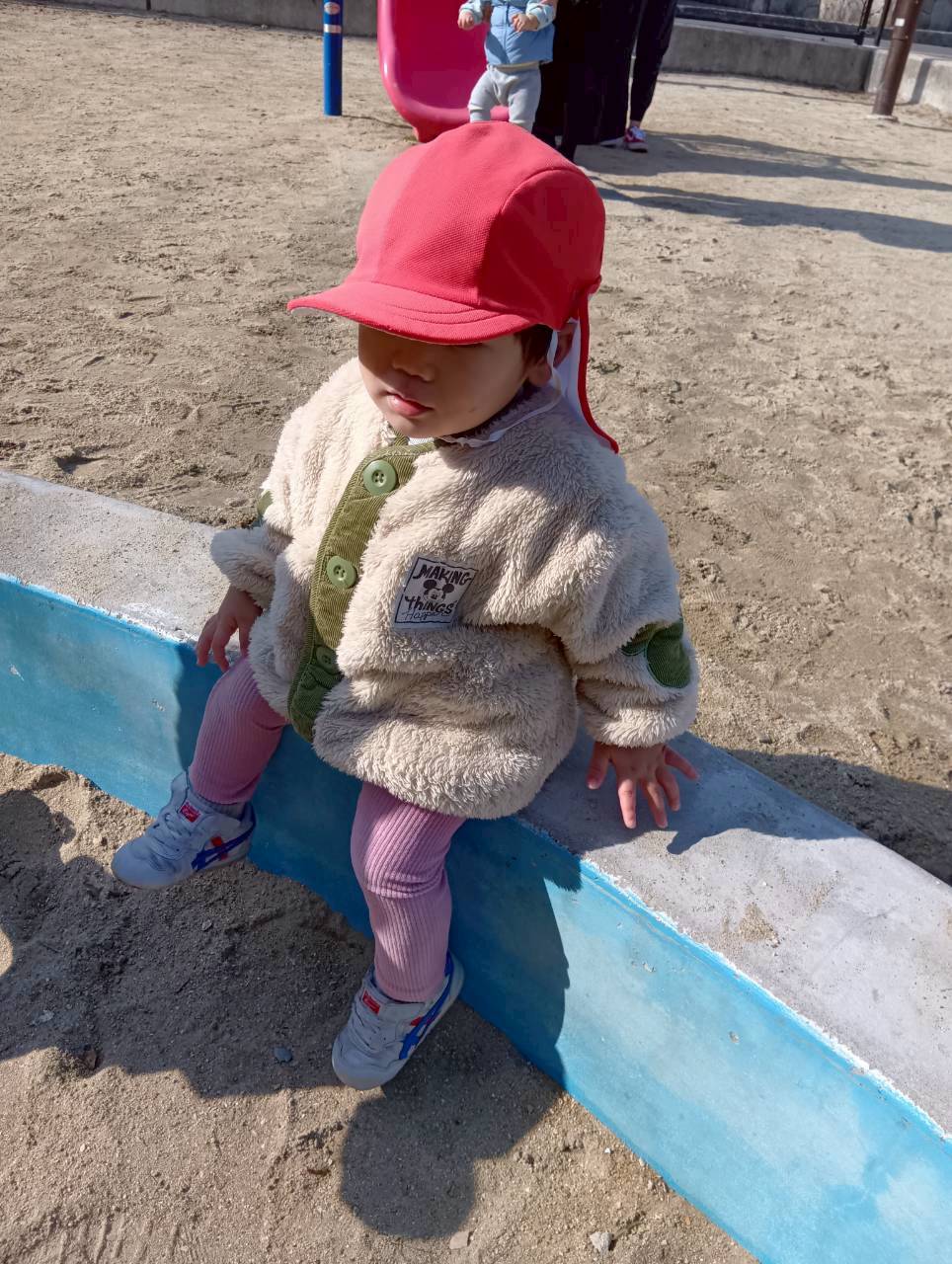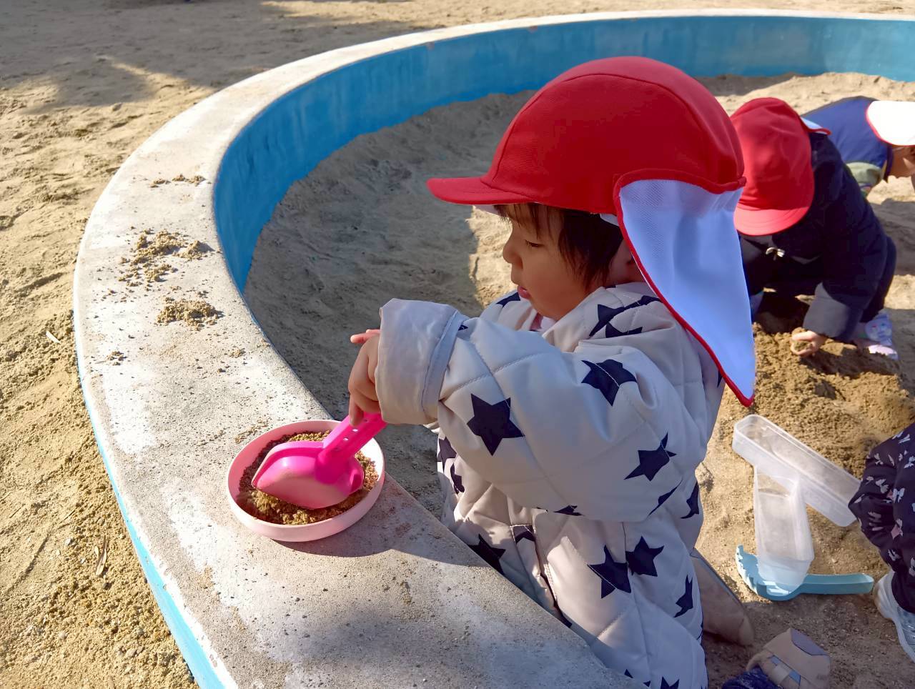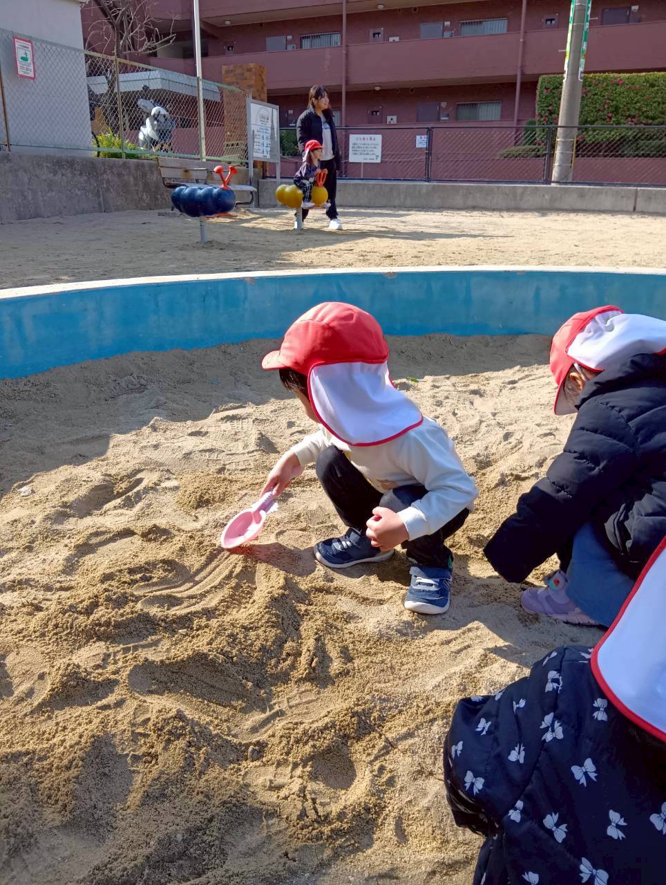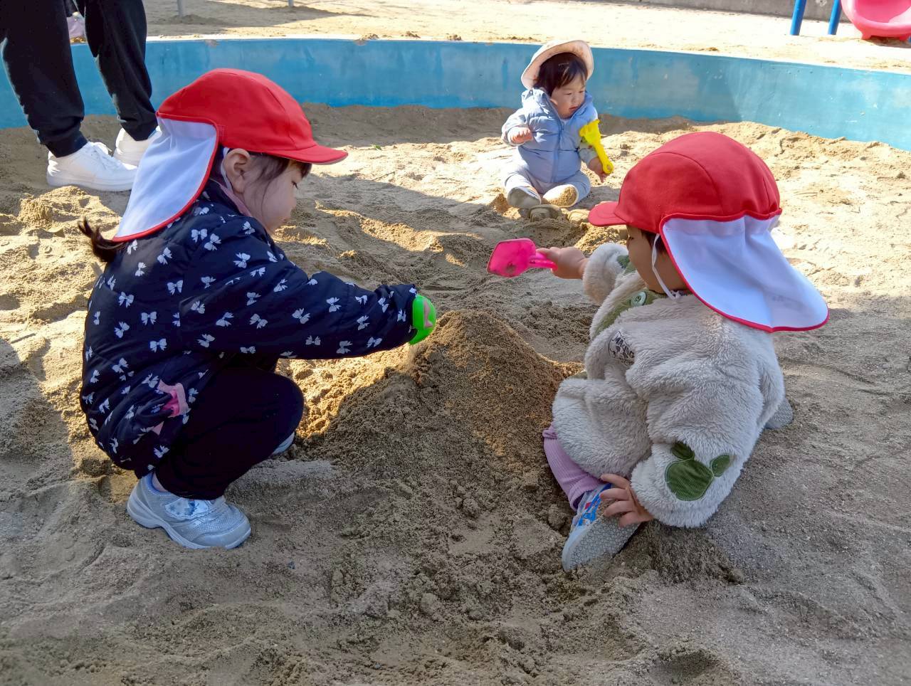 お砂場ではお友達と協力して高い山を作ったり、カップにお砂を入れて「アイスクリーム!」と食べさせに来てくれたり🍦