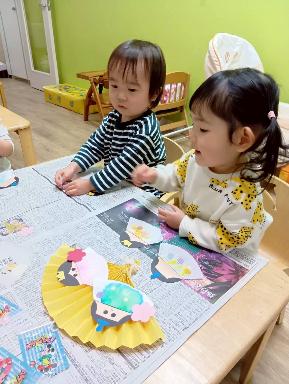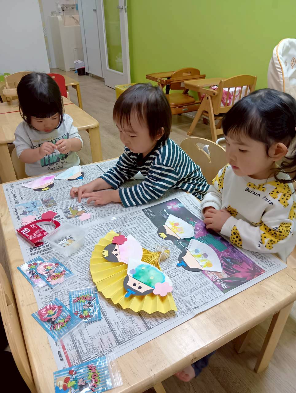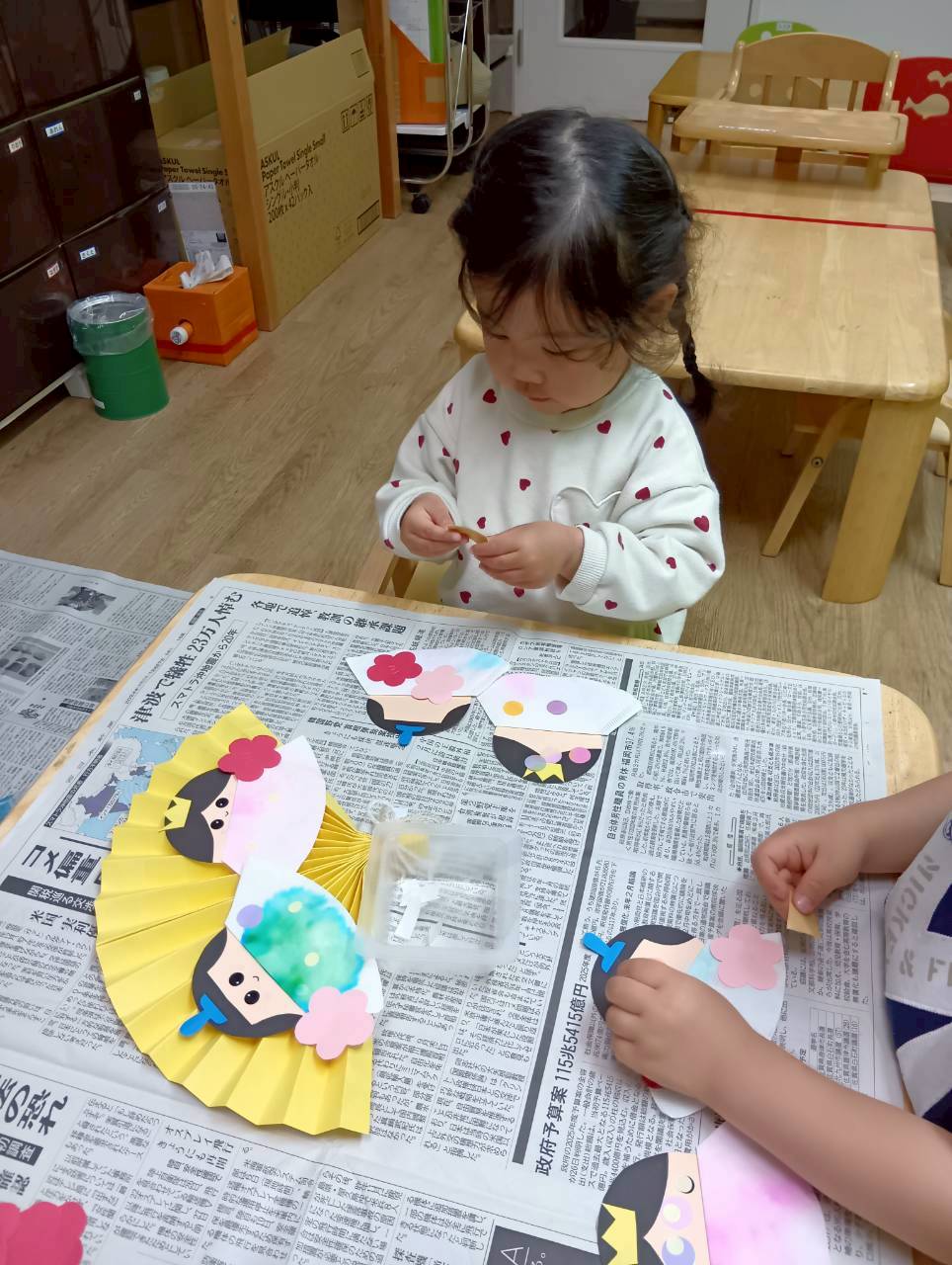 製作では、前ににじみ絵で色をつけていたお雛様の着物にシールやお花を貼りました🌸