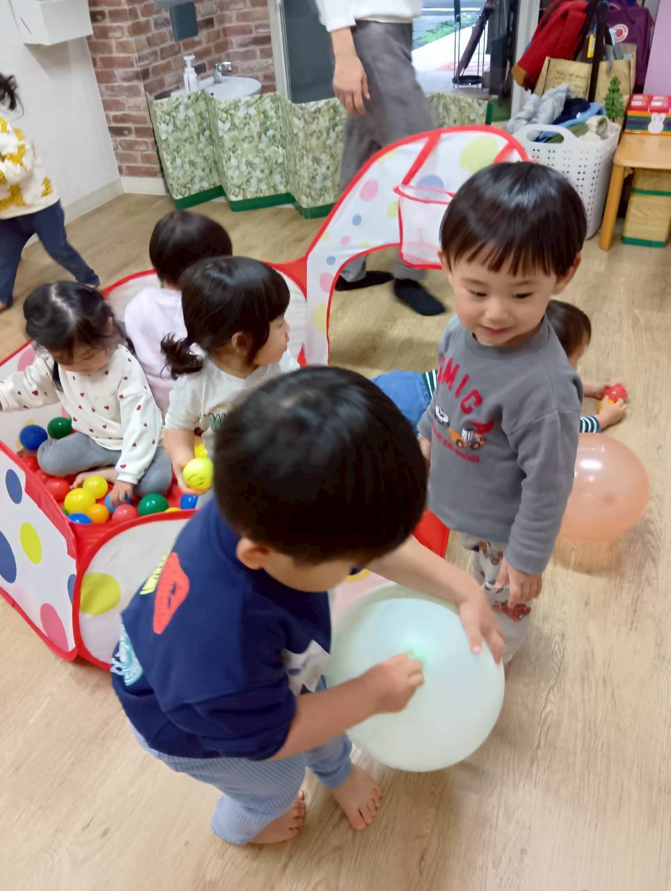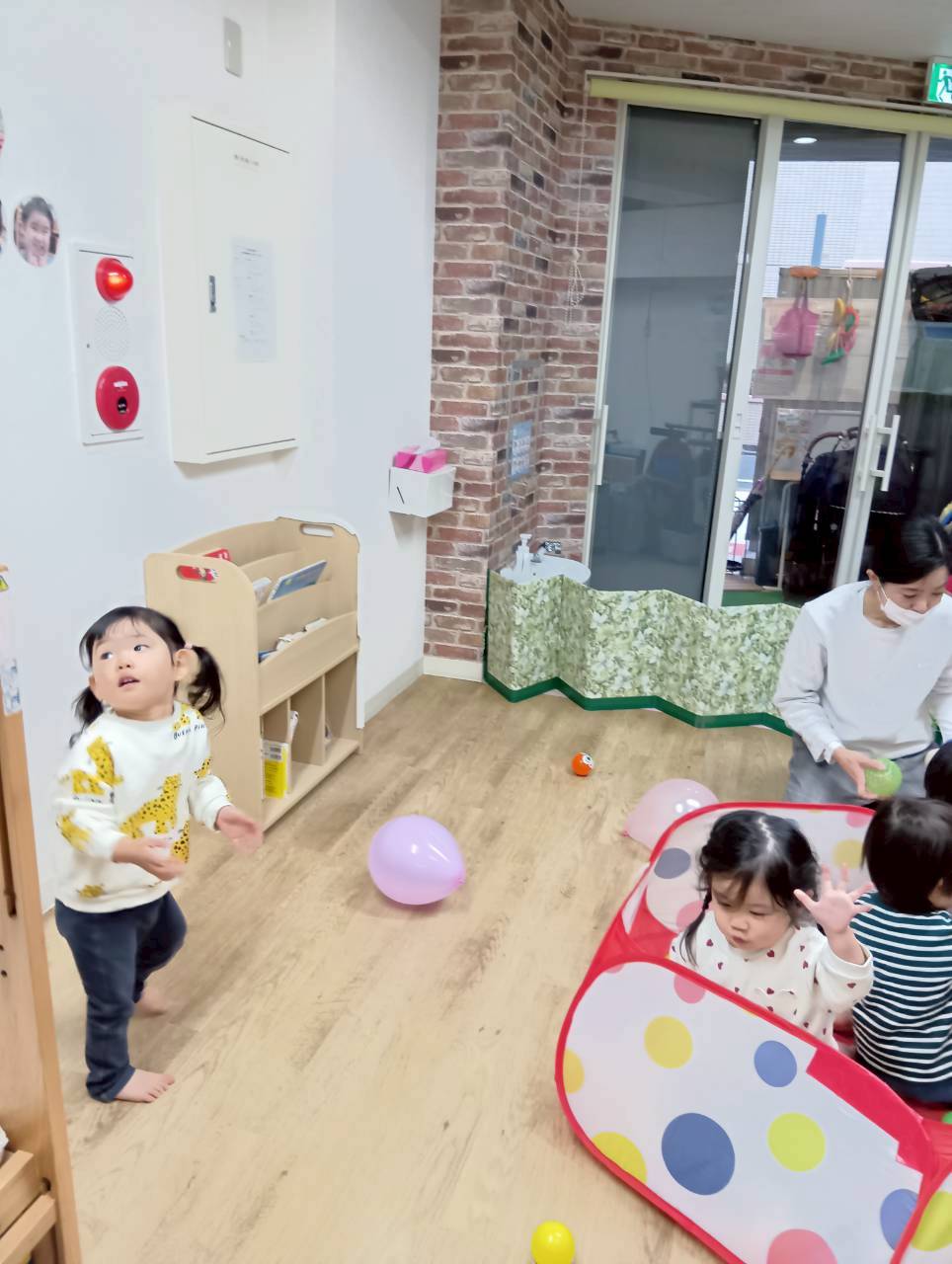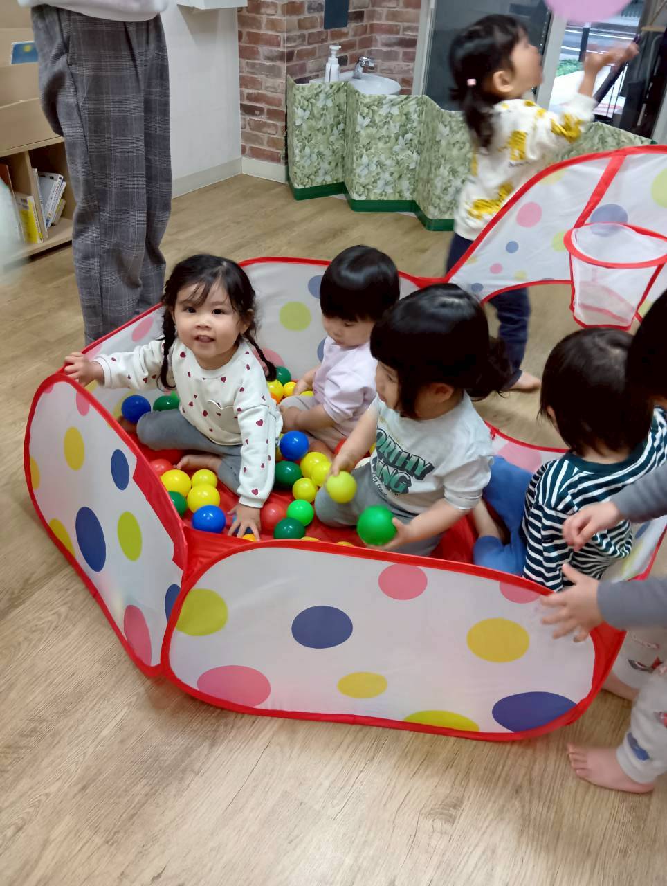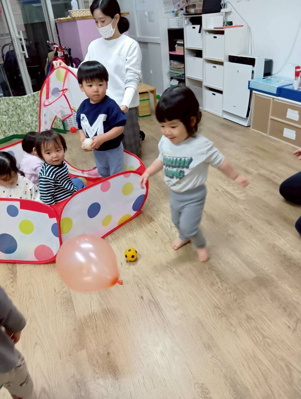 ボール遊びでは先生に上からボールを落としてもらったり、的に向けて投げたりとっても楽しそうでしたよ😊