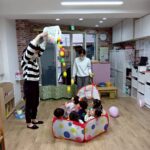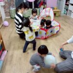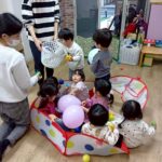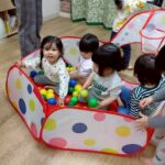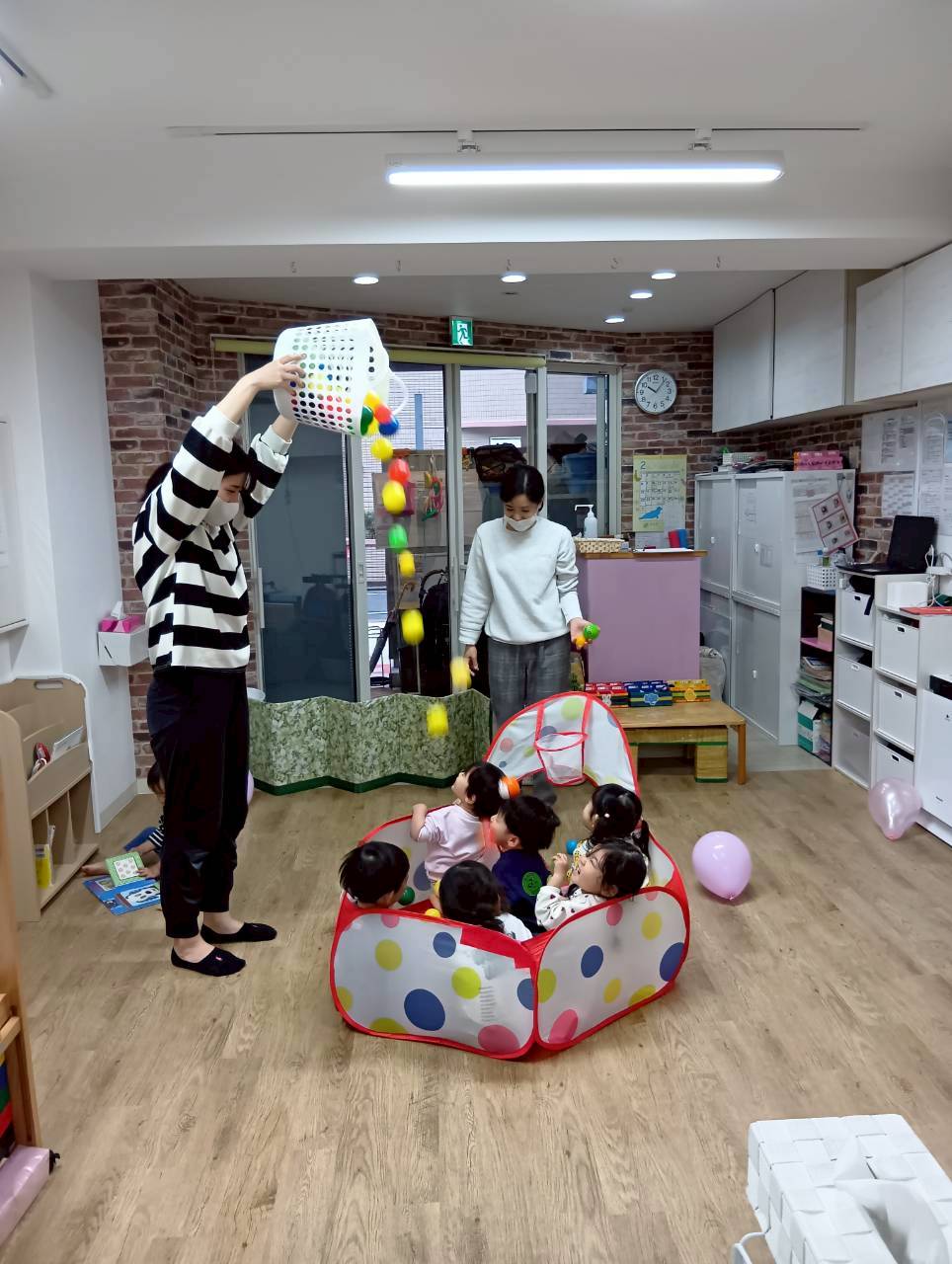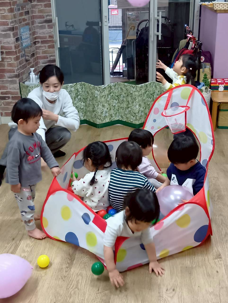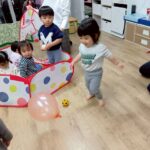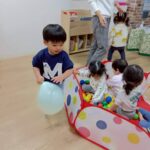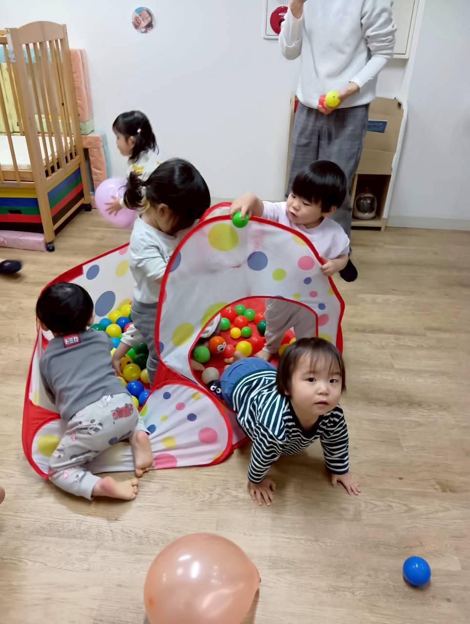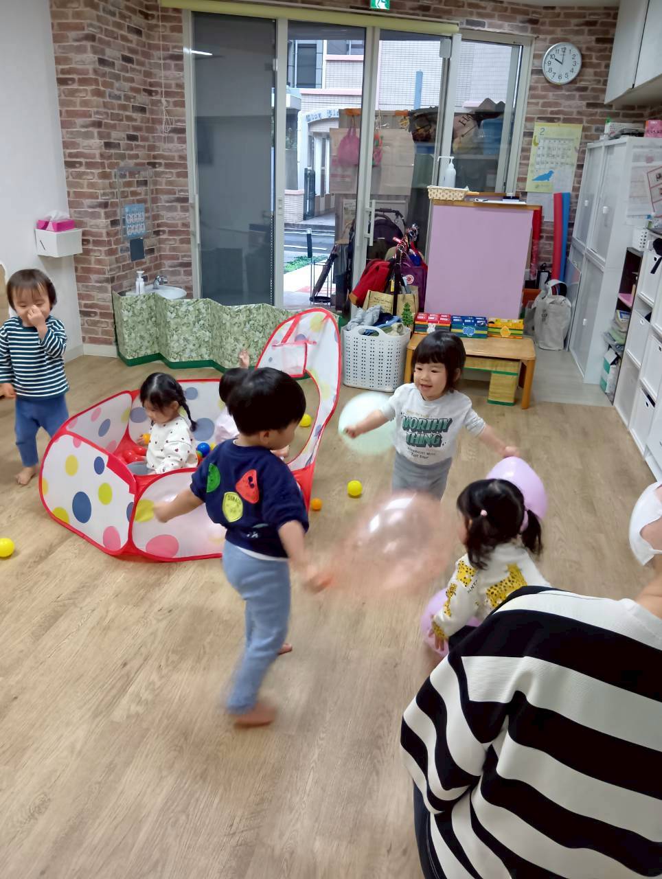 ボール遊びでは先生に上からボールを落としてもらったり、的に向けて投げたりとっても楽しそうでしたよ😊