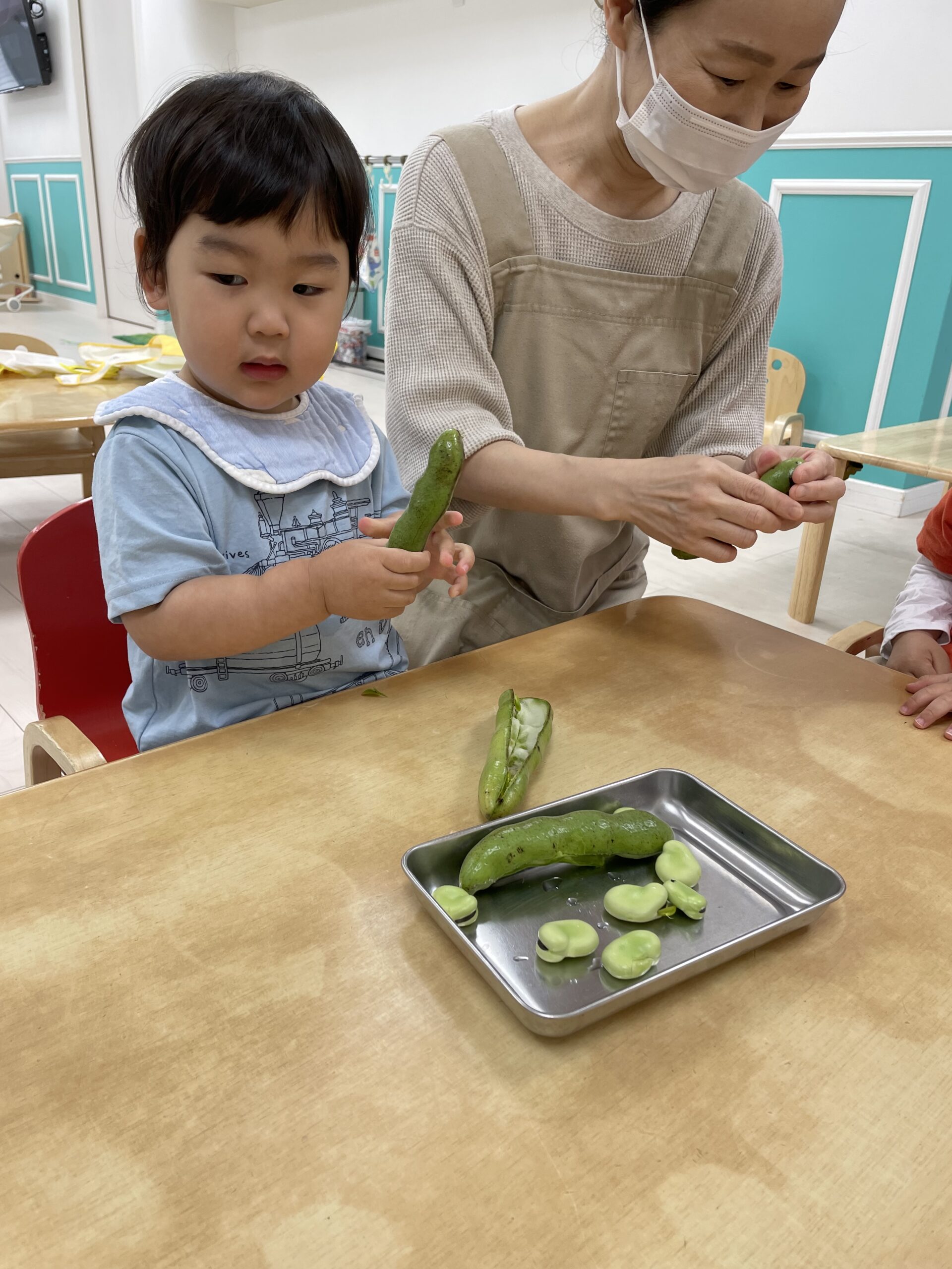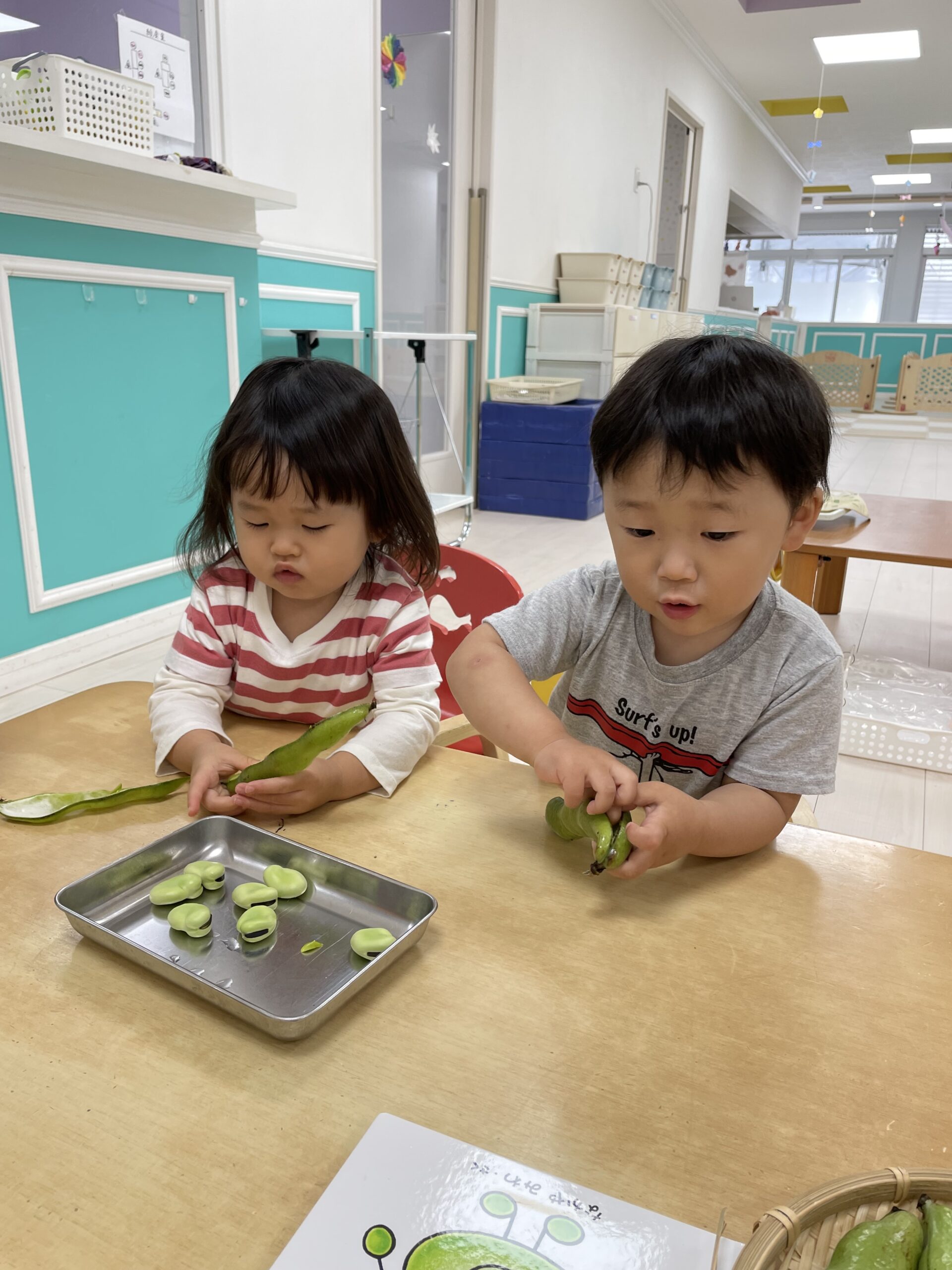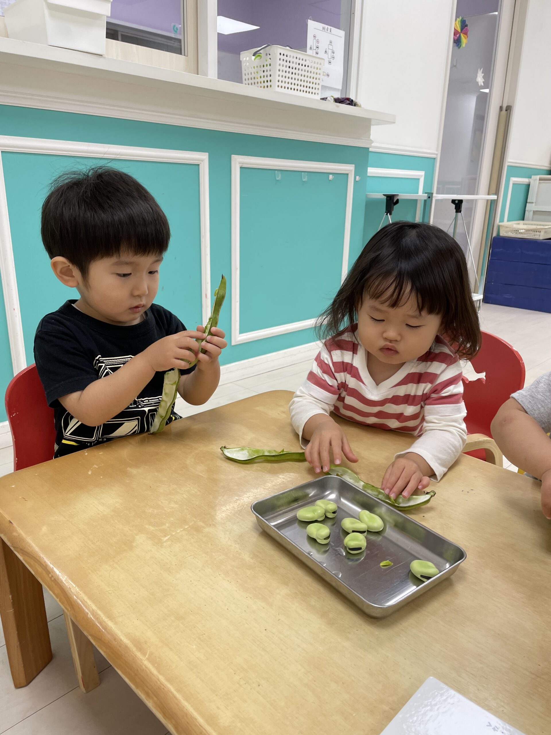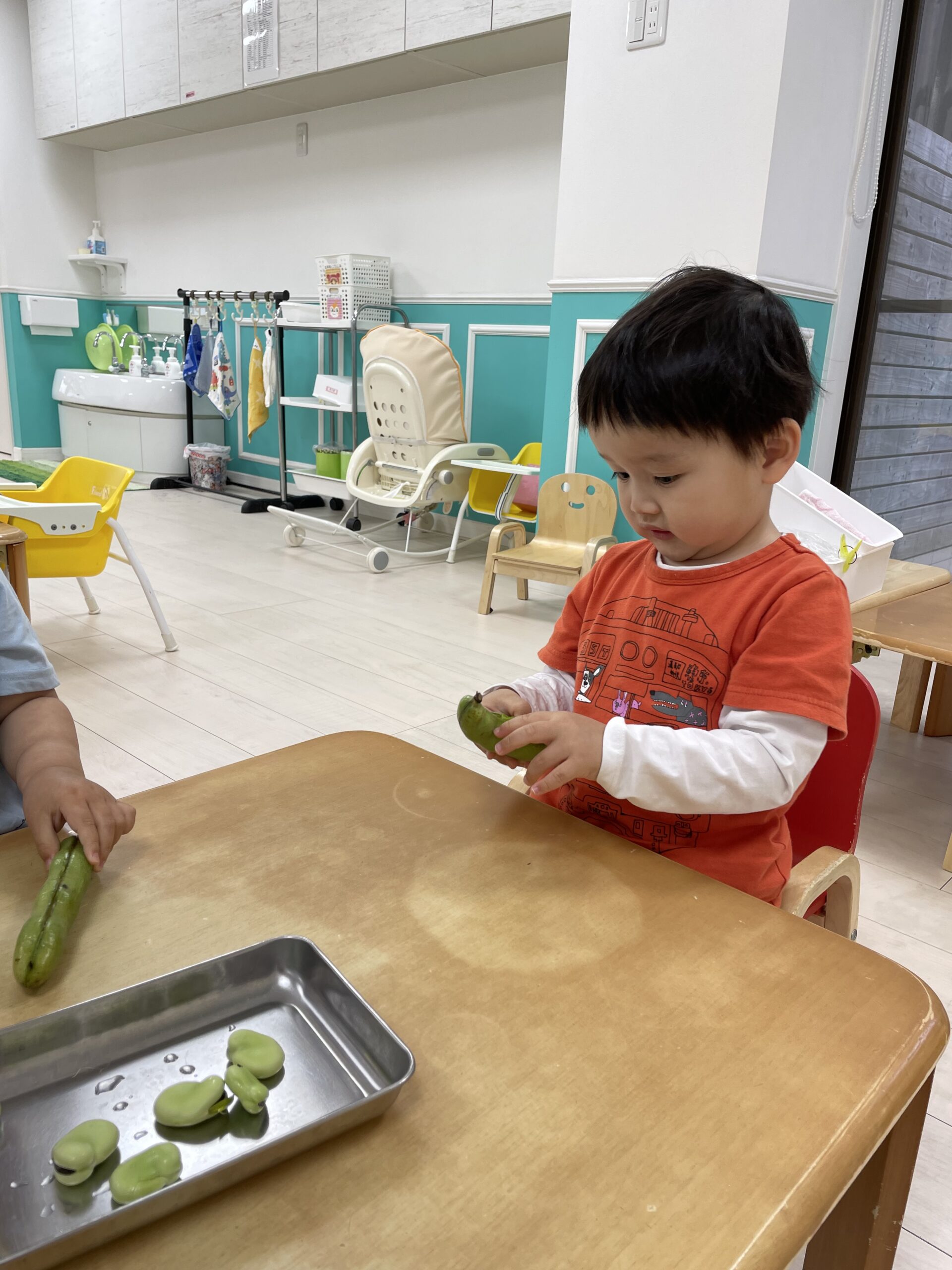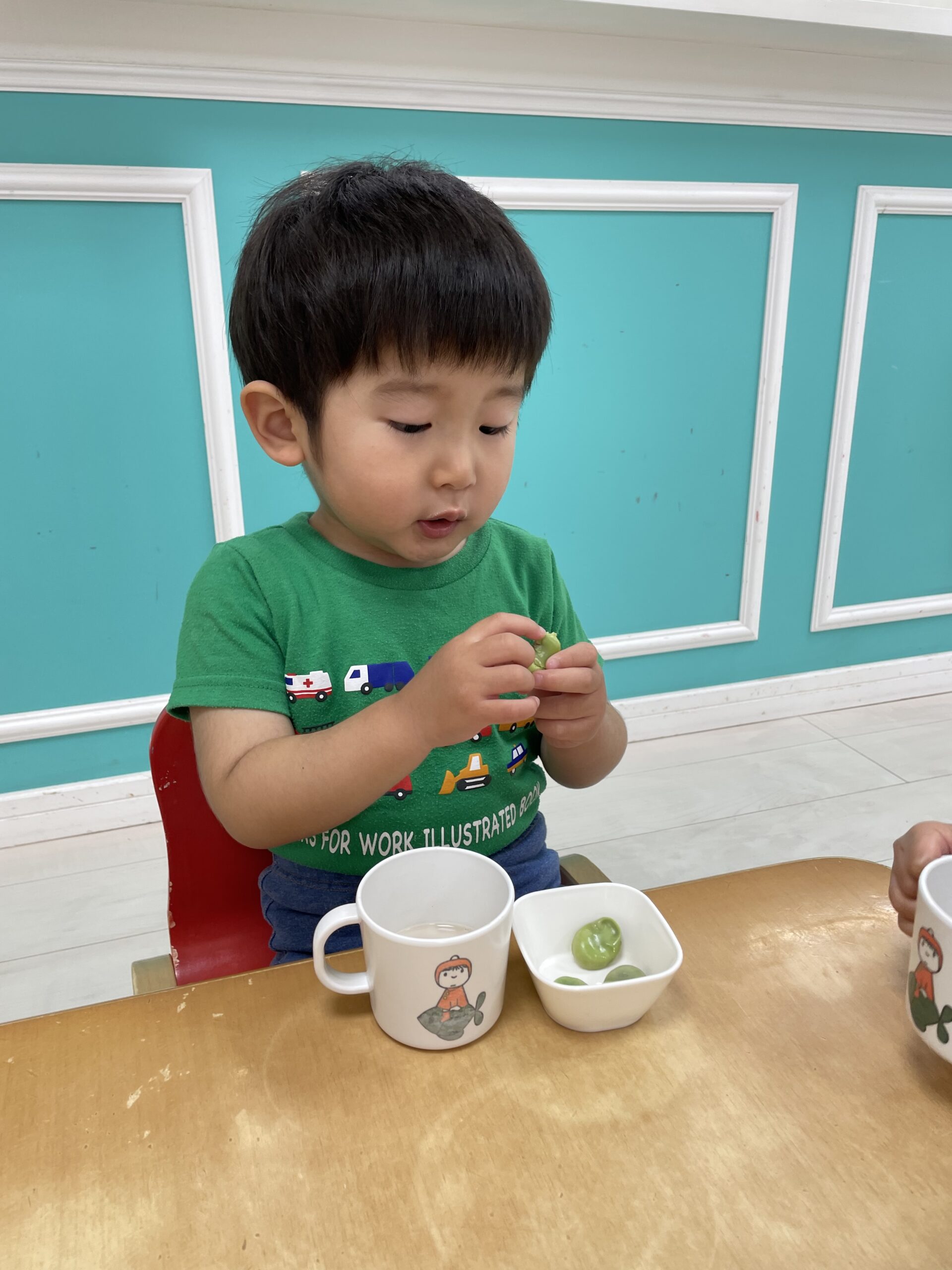 朝のおやつの前に、そら豆の皮むきを2歳児さんが行いました☺️
