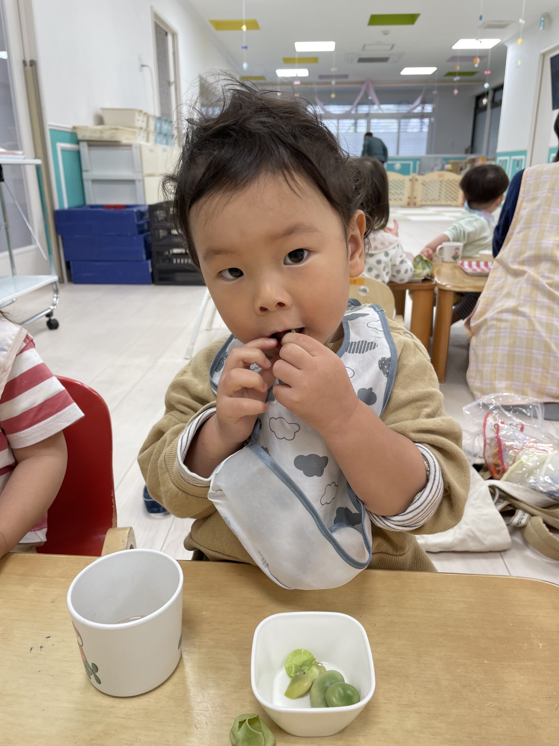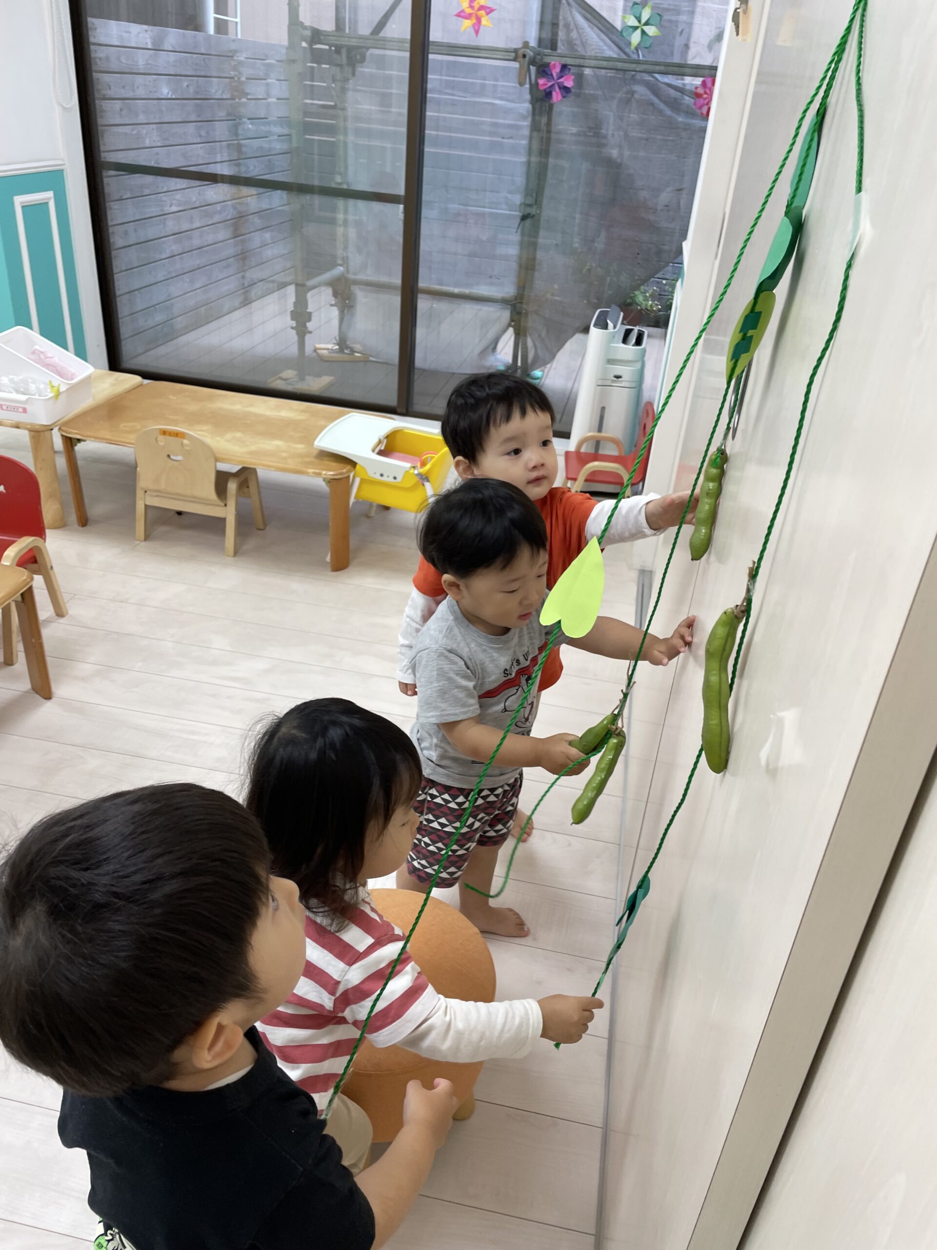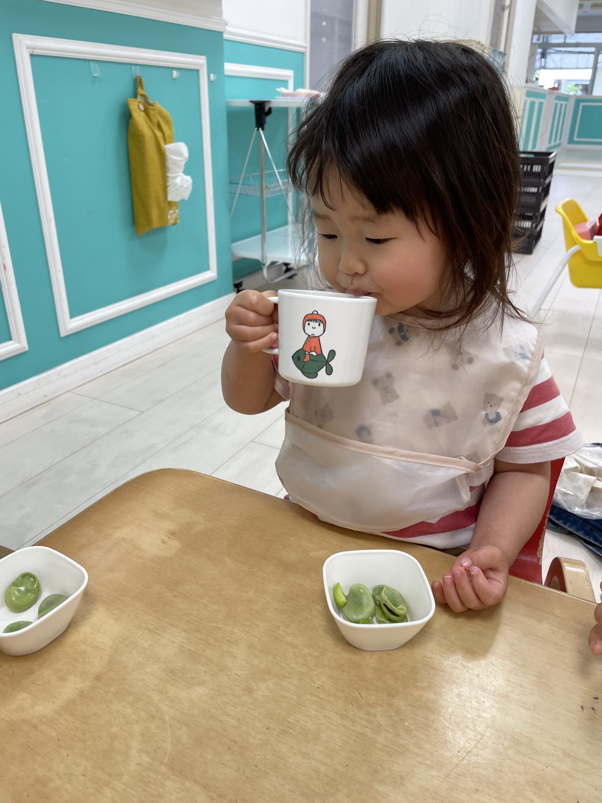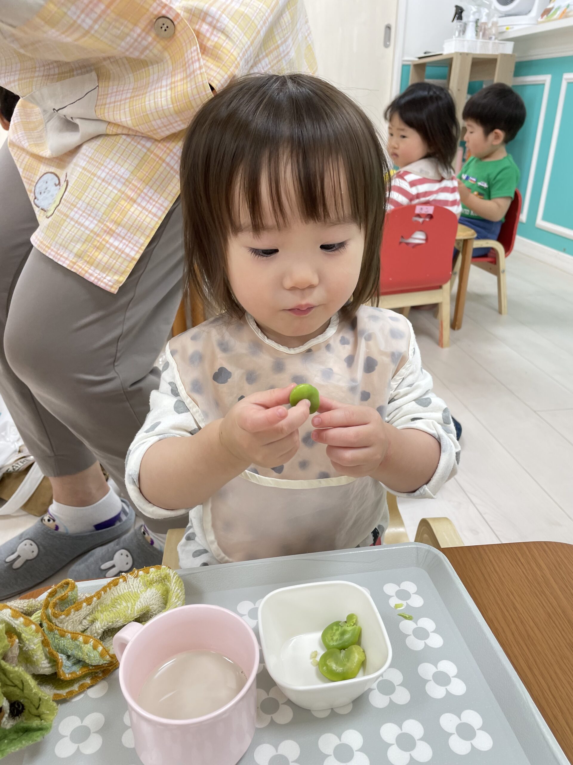 朝のおやつの前に、そら豆の皮むきを2歳児さんが行いました☺️