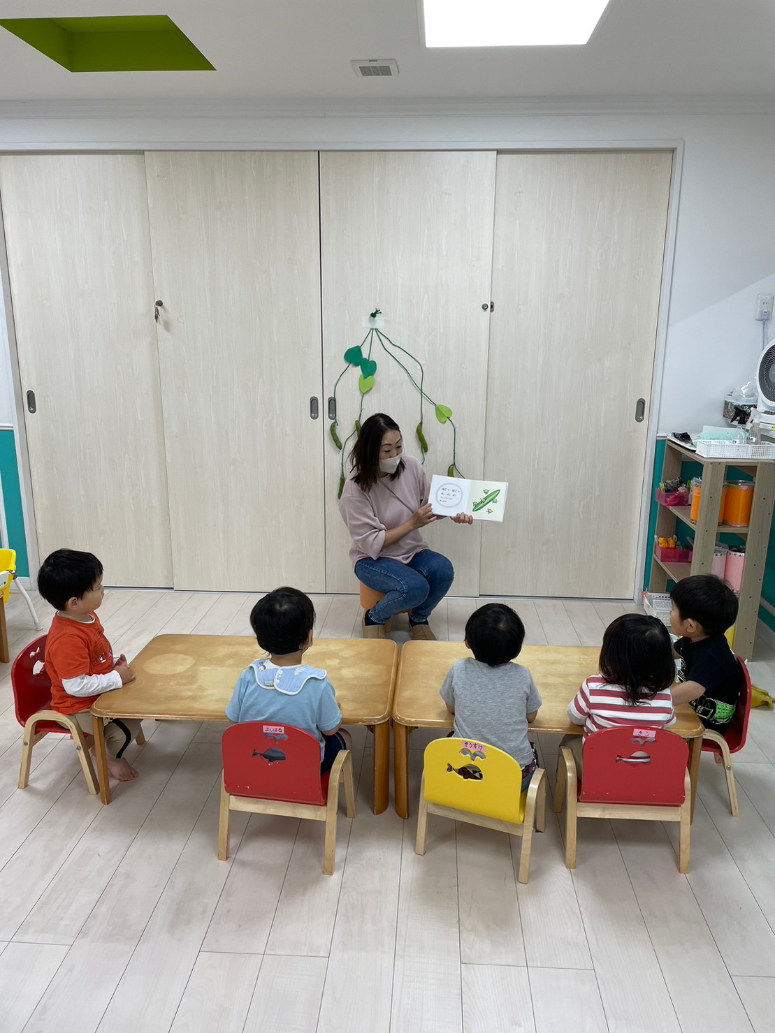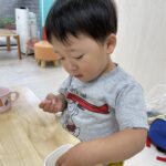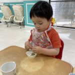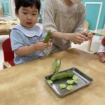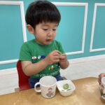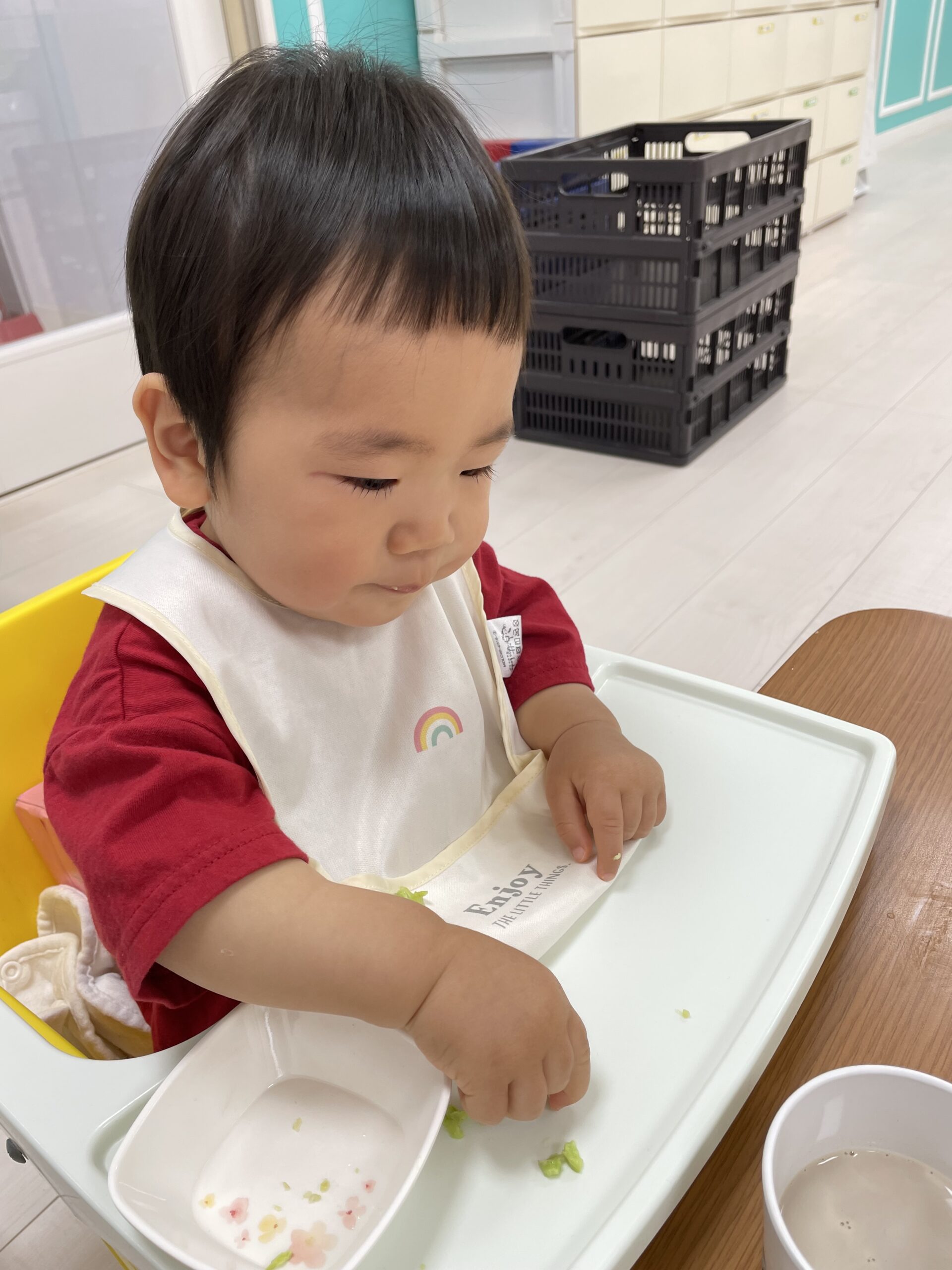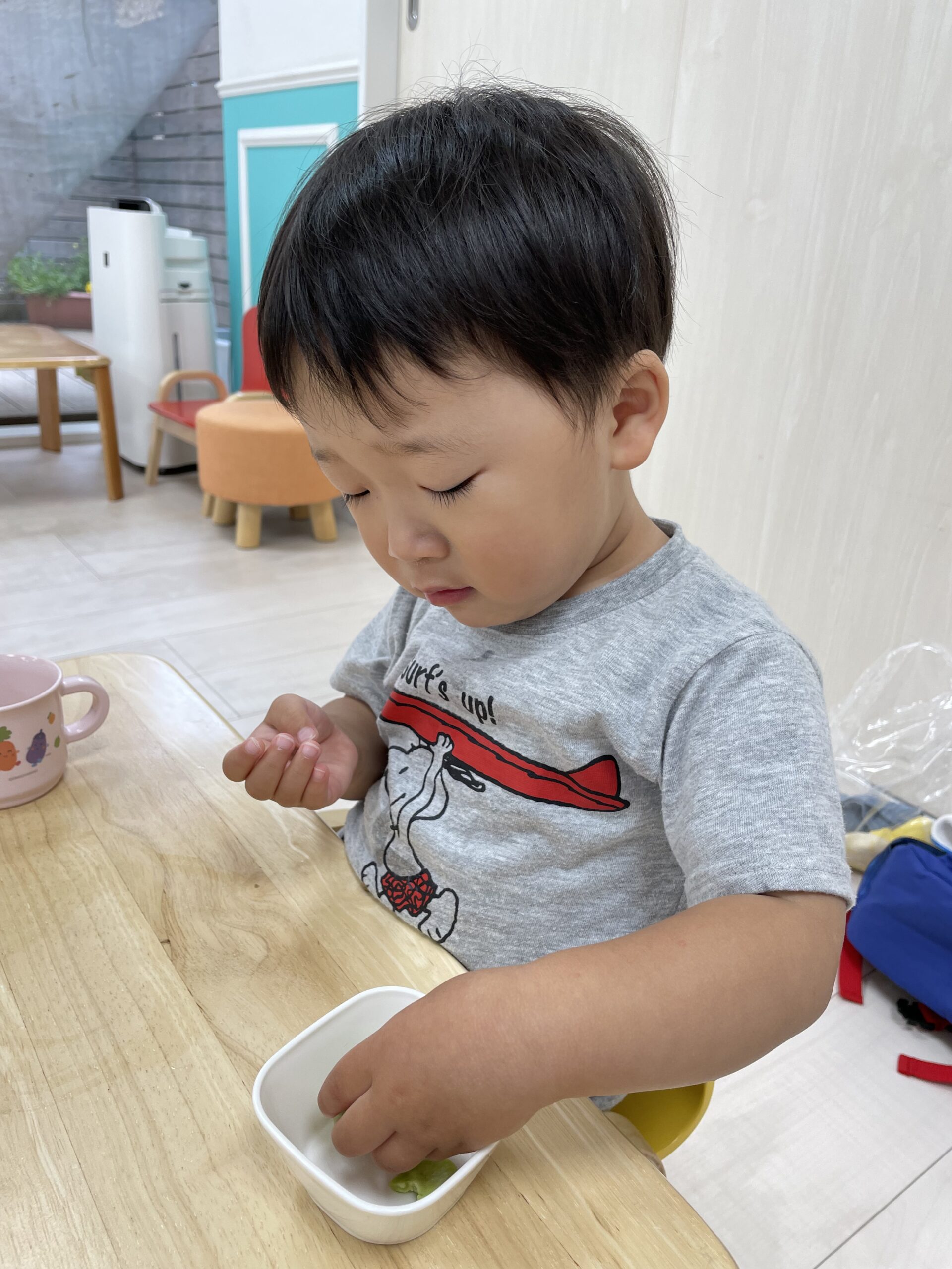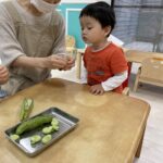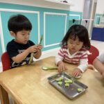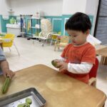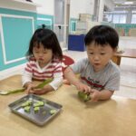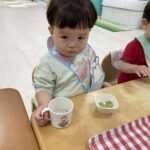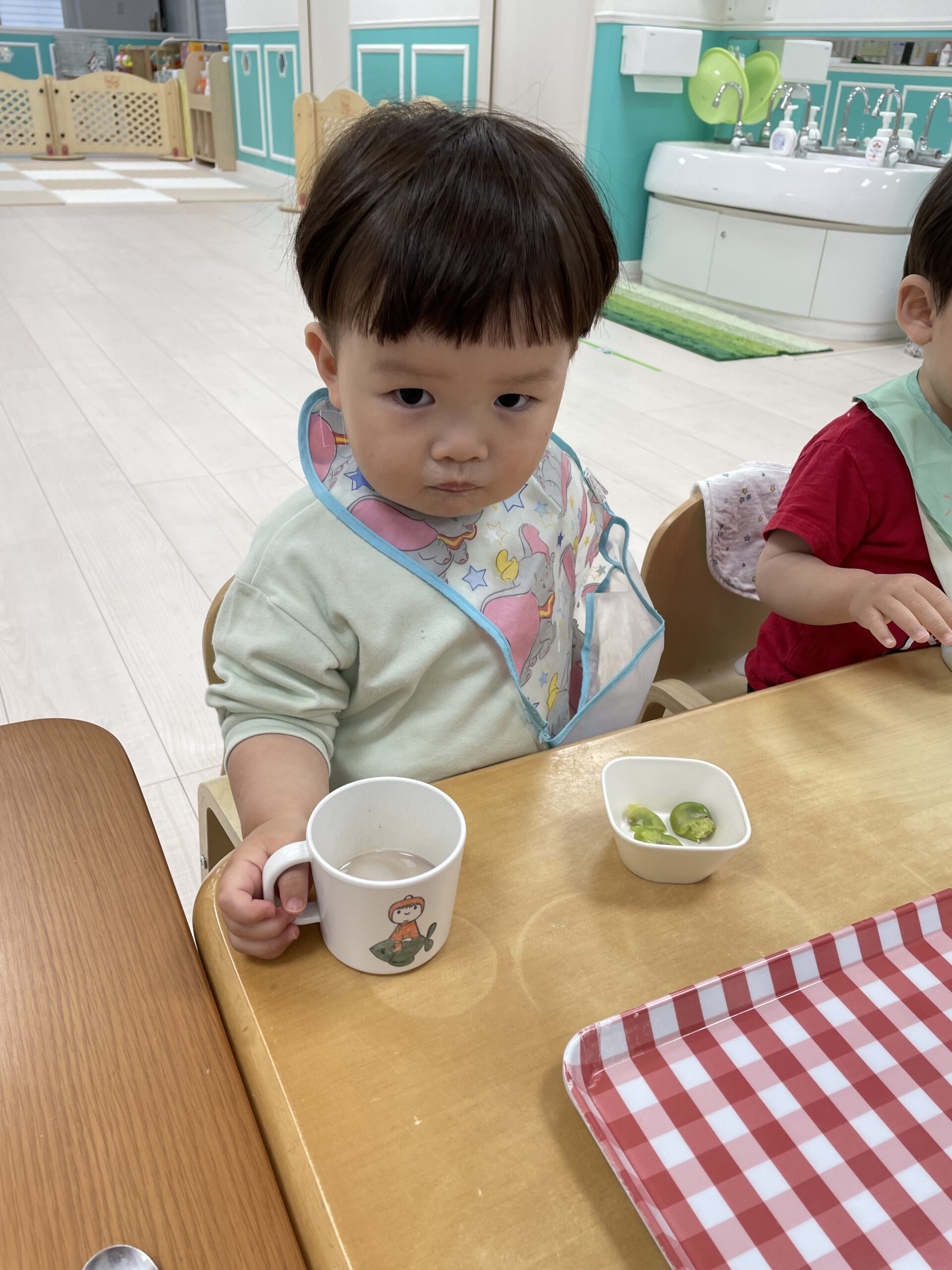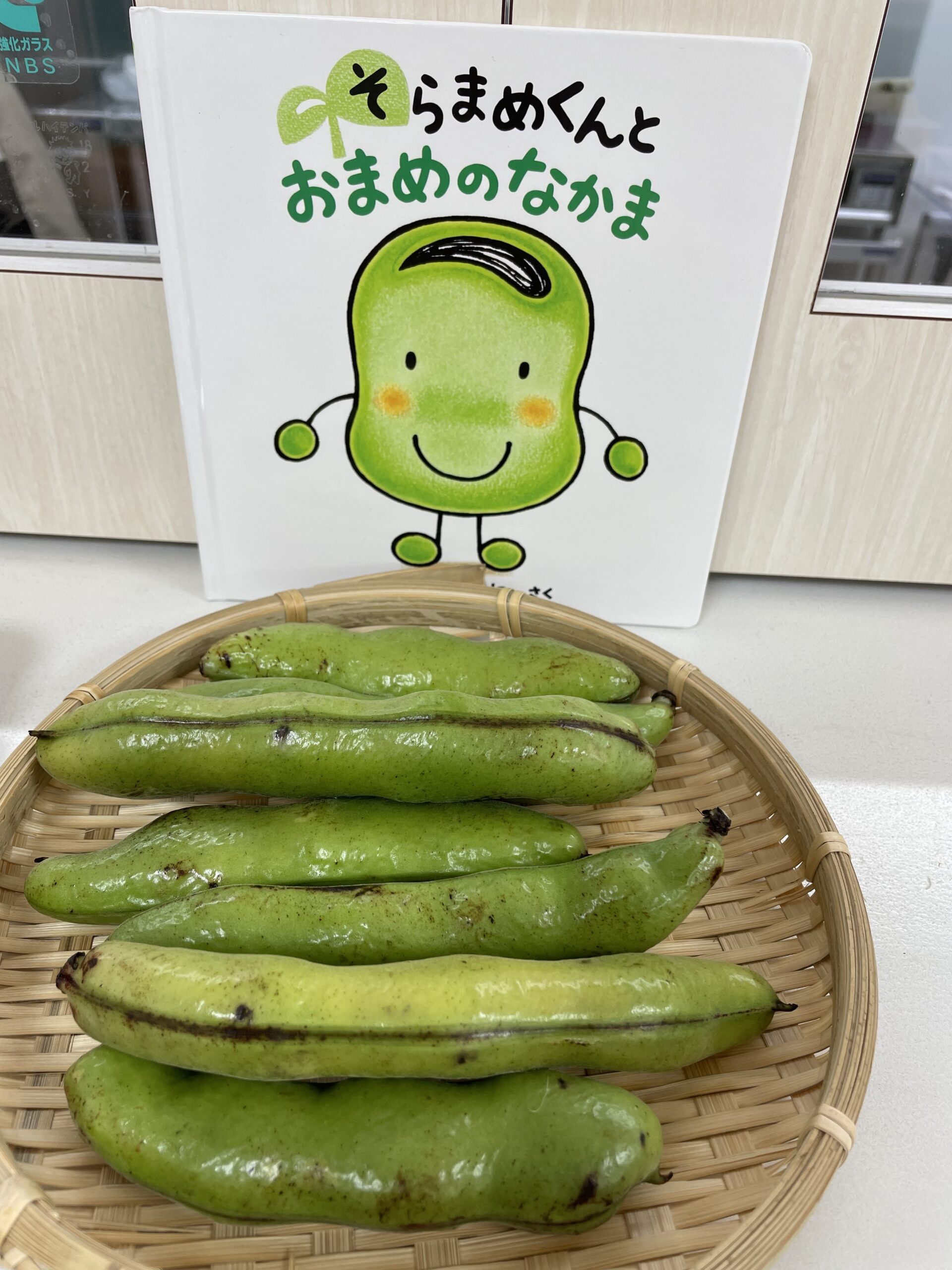 朝のおやつの前に、そら豆の皮むきを2歳児さんが行いました☺️