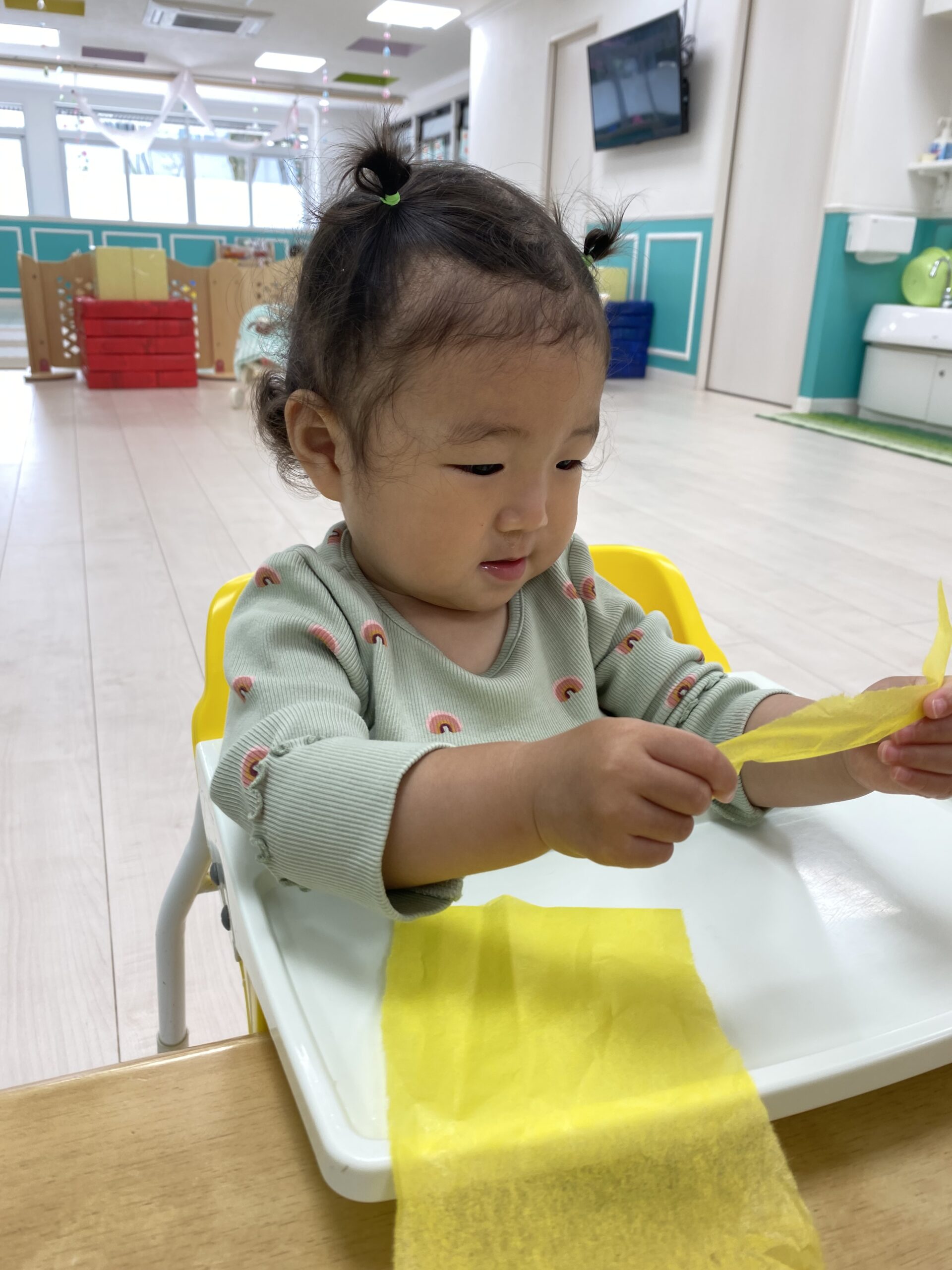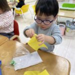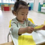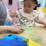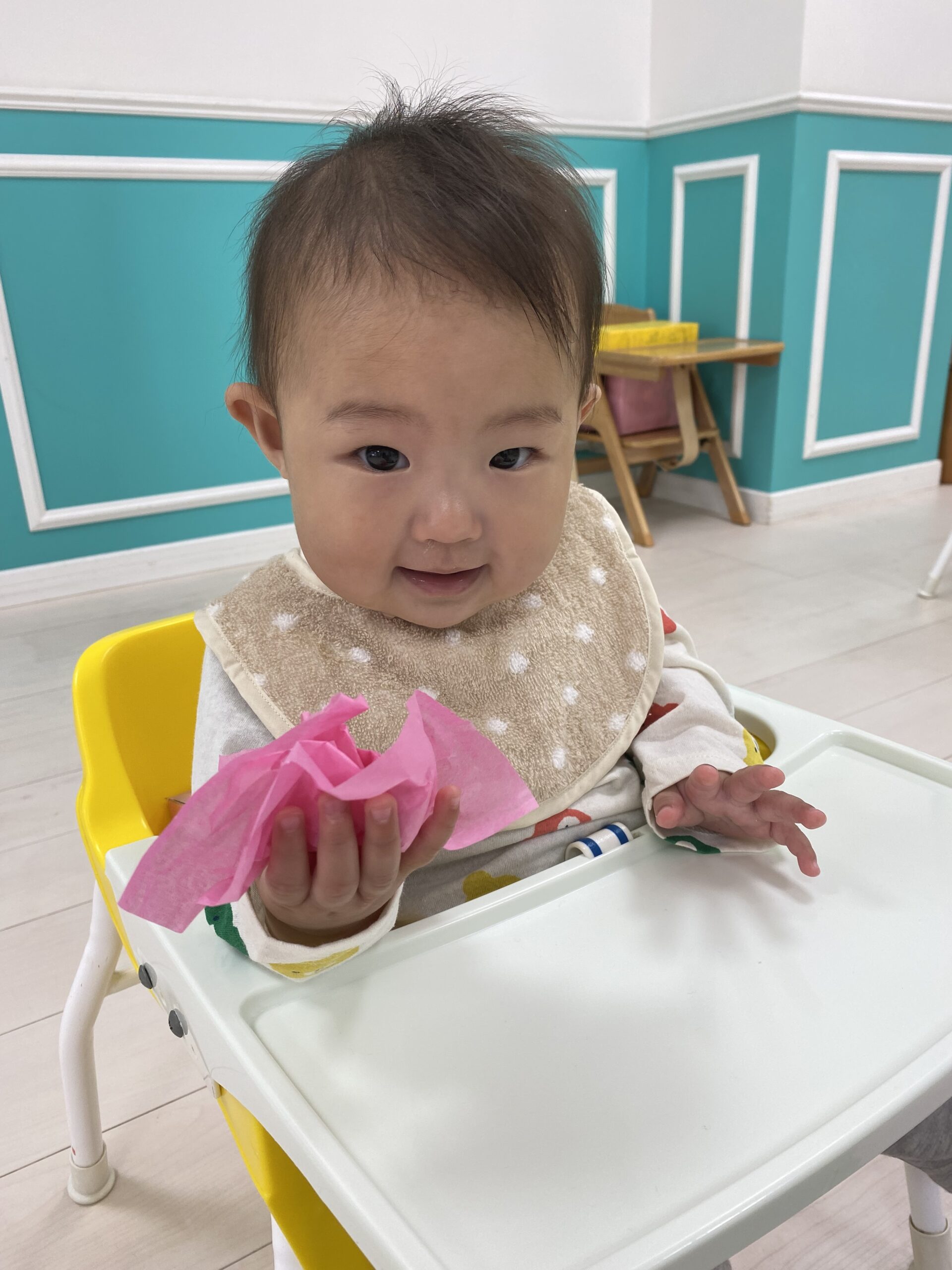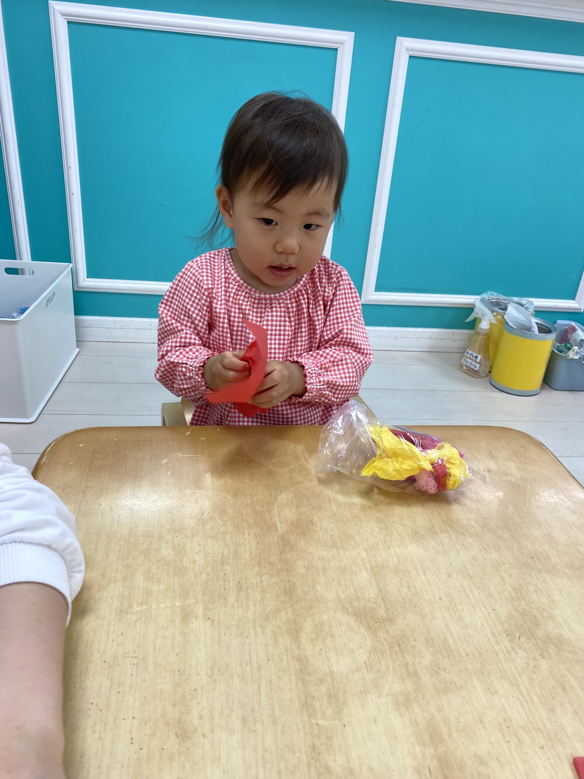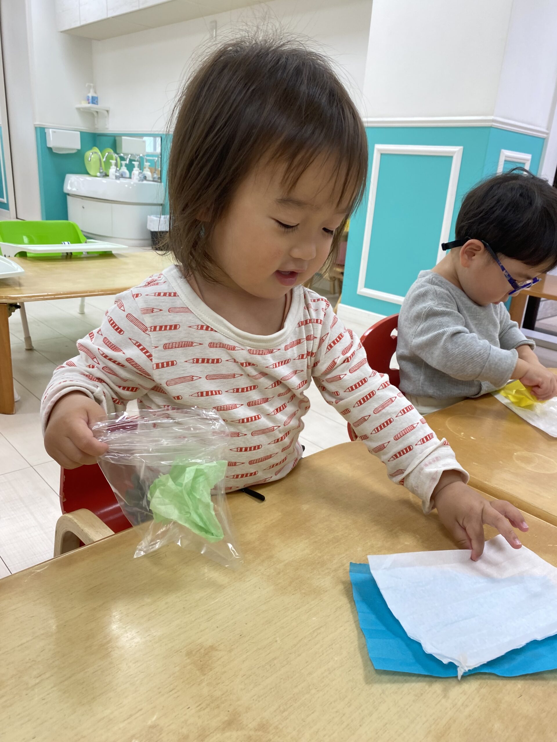 初めてのお花紙を不思議そうに見つめて、