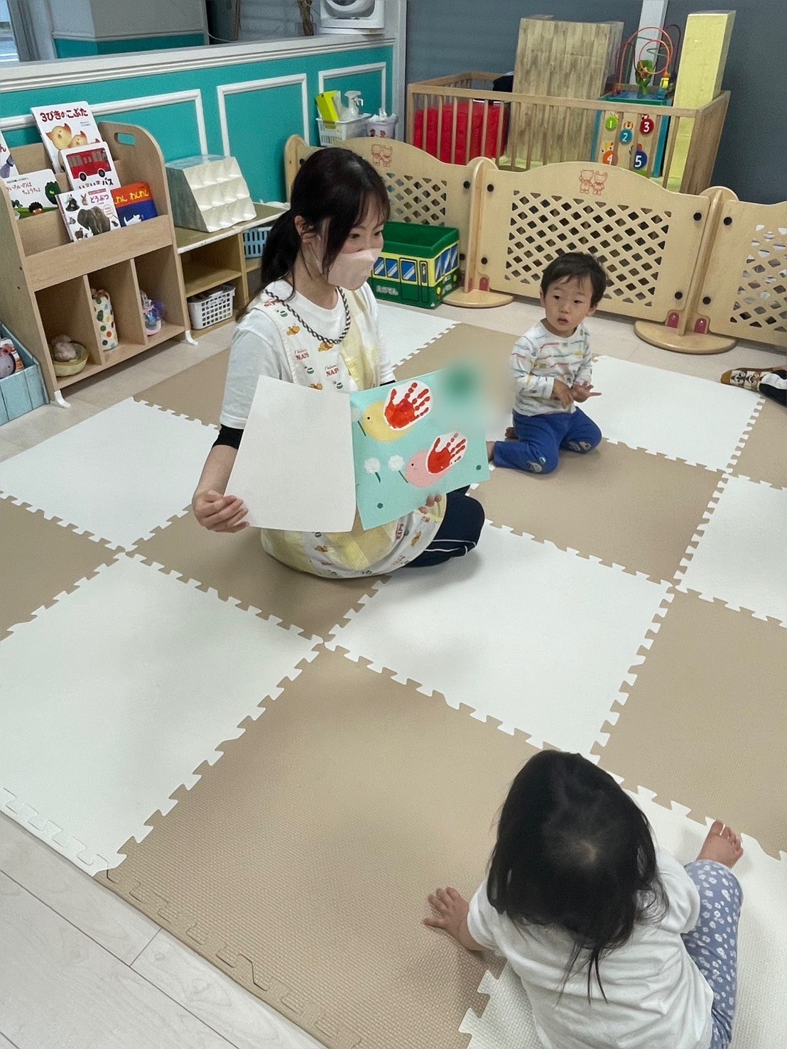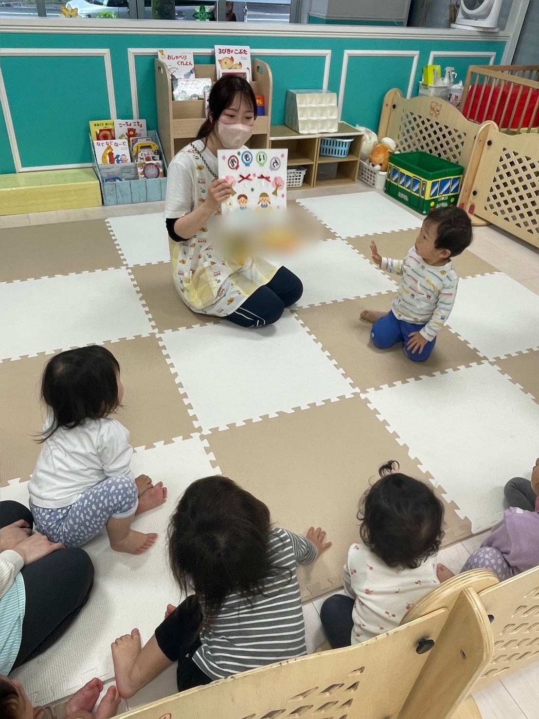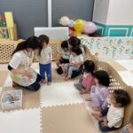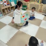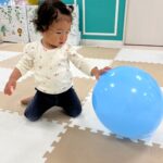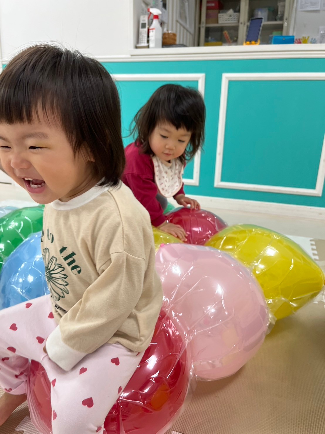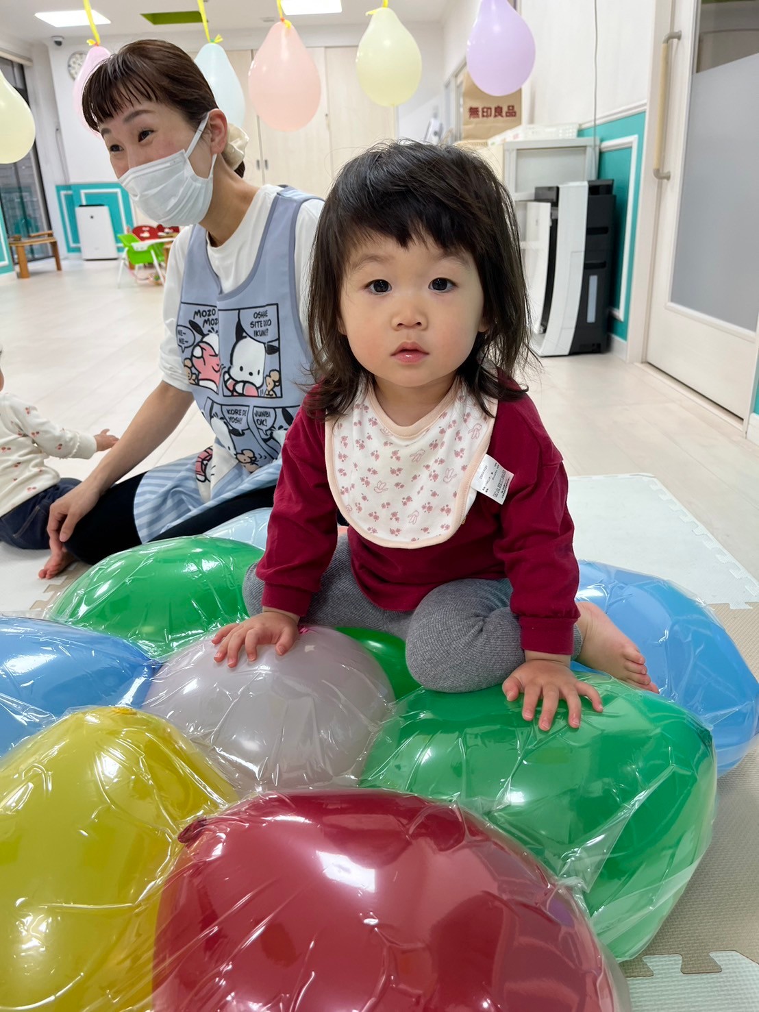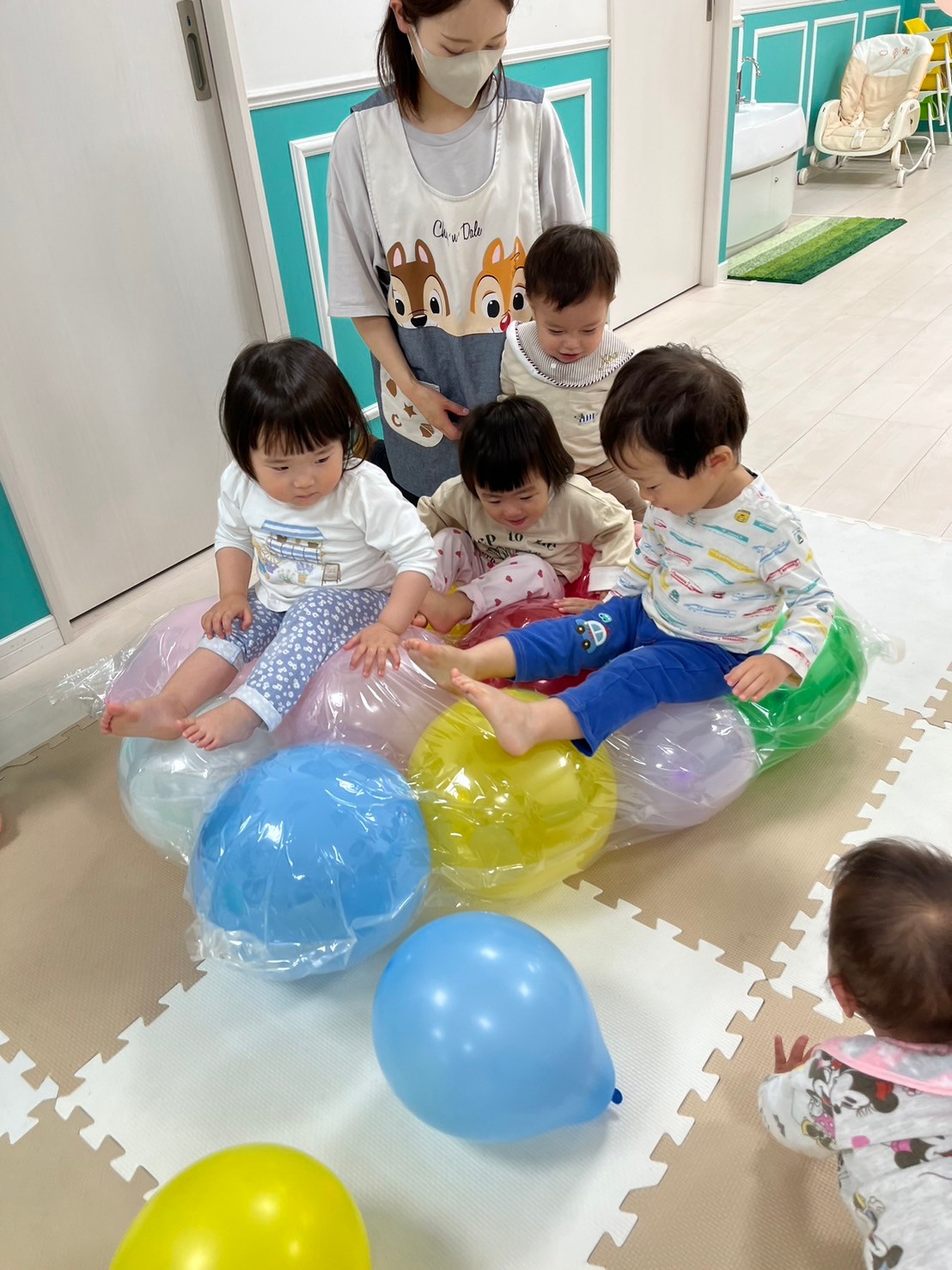 お友だちと一緒に座って風船の感触を楽しんだり、風船の布団をたたいてボンボンという音を楽しんだりしていましたよ💗
