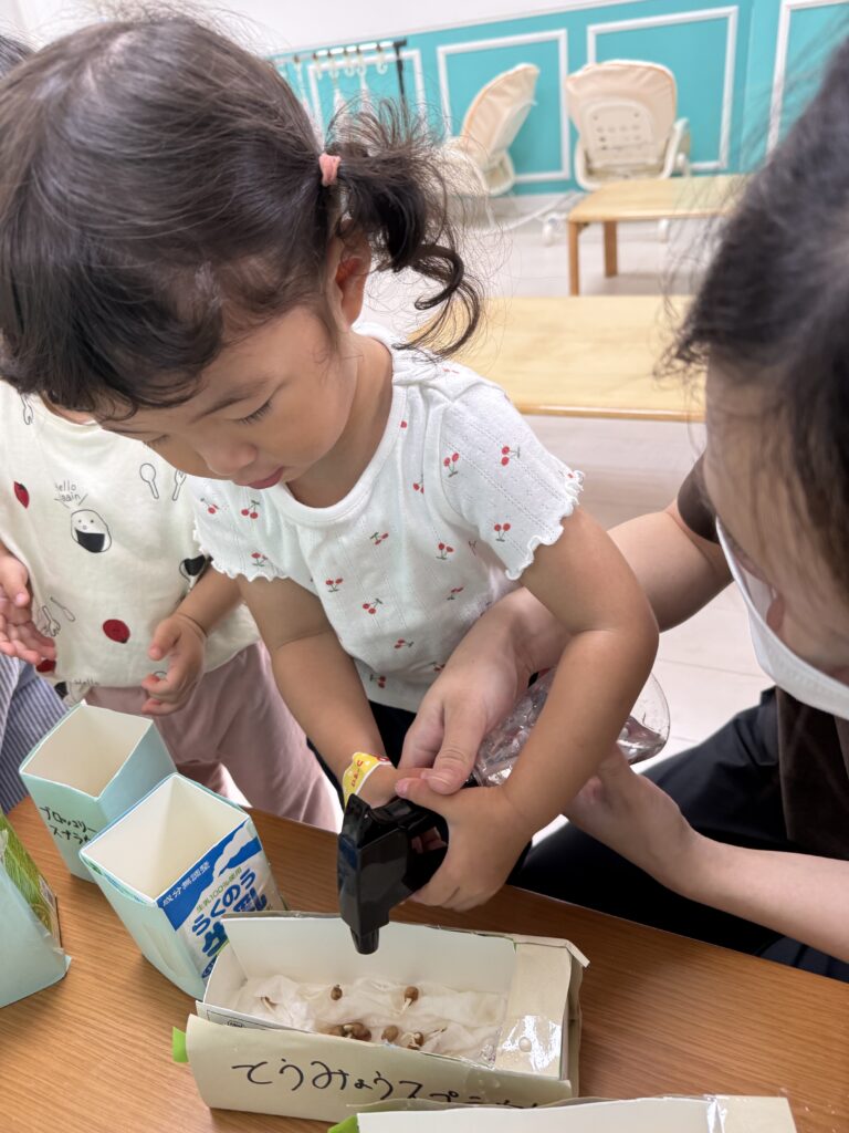 給食の先生や保育士と一緒に霧吹きをしましたよ♡「おおきくなーれ♪おおきくなーれ♪」