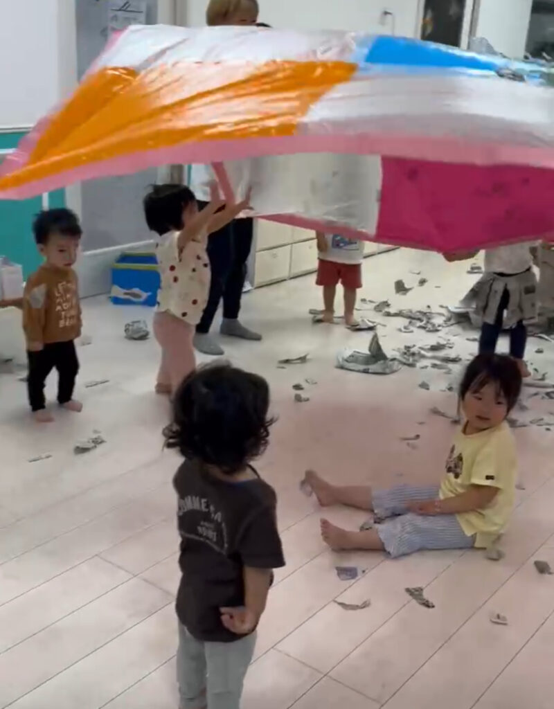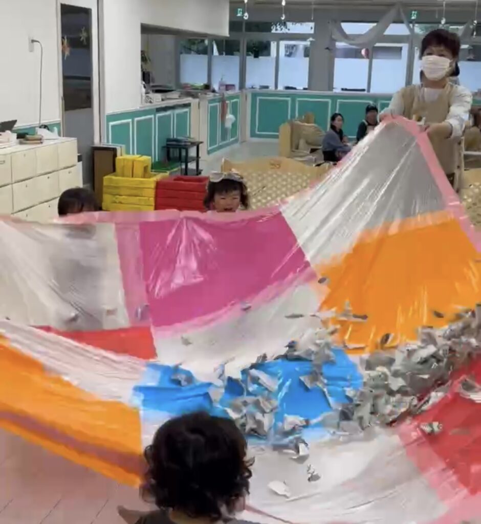 最後はパラバルーンで新聞紙を飛ばしたり、下に潜って心地よい風をたくさん浴びましたよ♡「キャーキャー」盛り上がりました🤭🗞