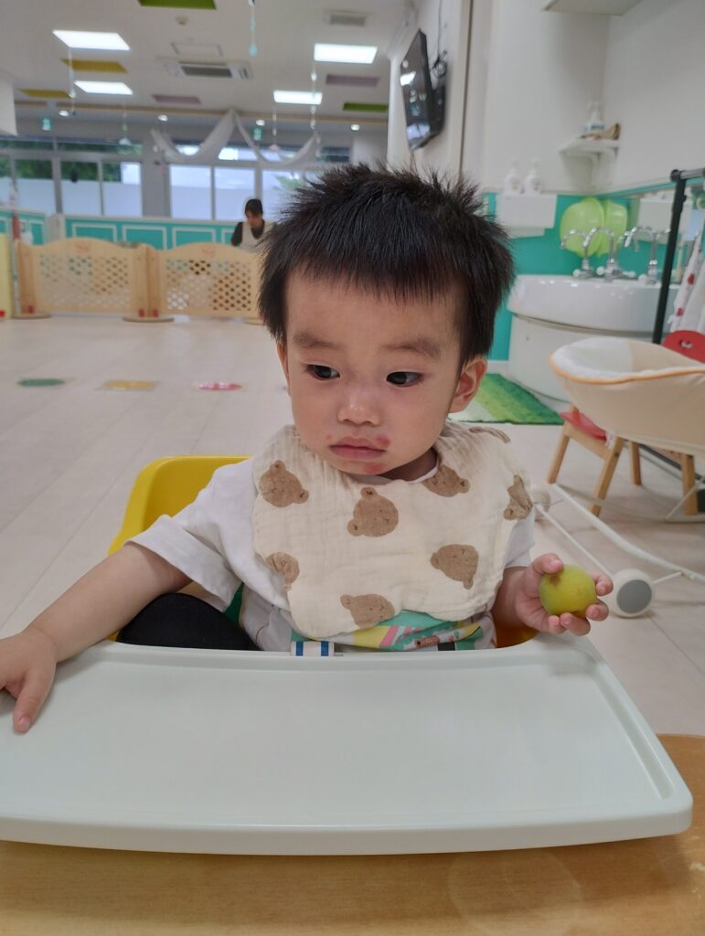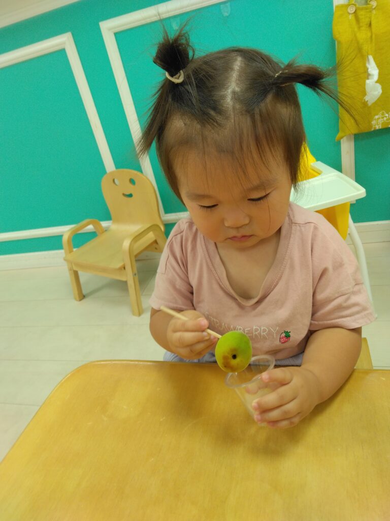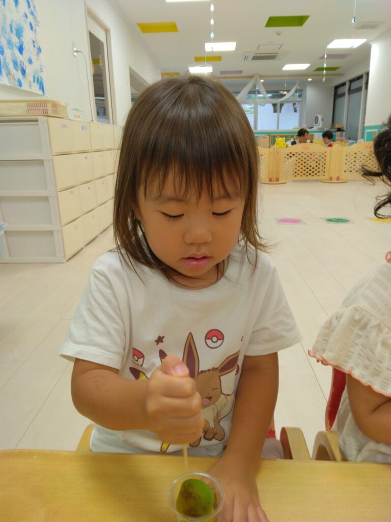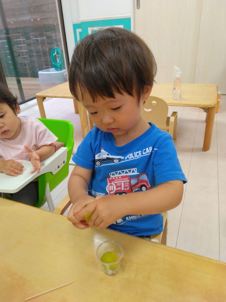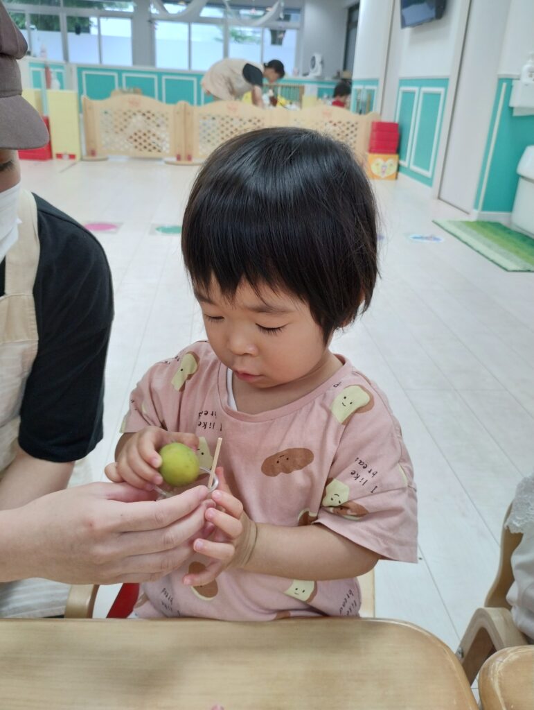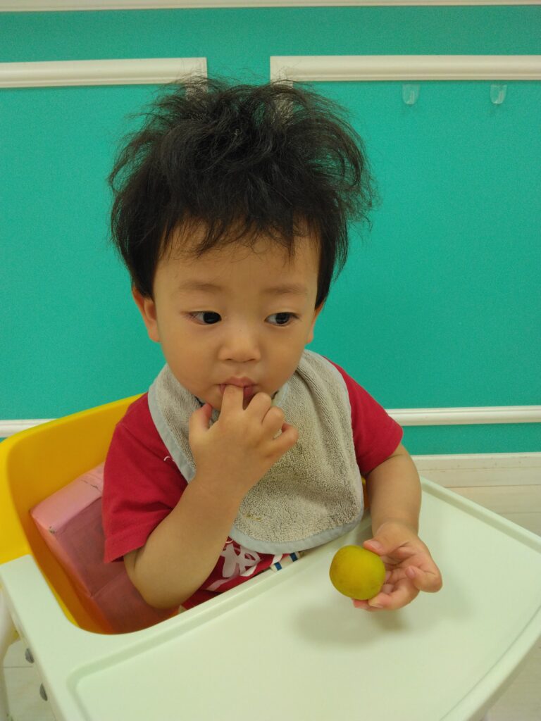 小さなお友達は、梅を転がしたり握ってみたり感触を楽しみましたよ♫