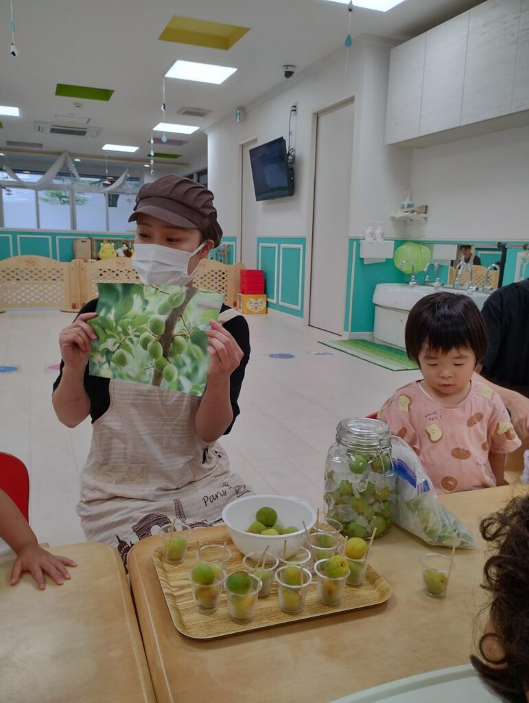 目の前に本物の梅が登場すると前のめりになって興味津々の子どもたち。まずは給食の先生から梅のお話しがありました☺️