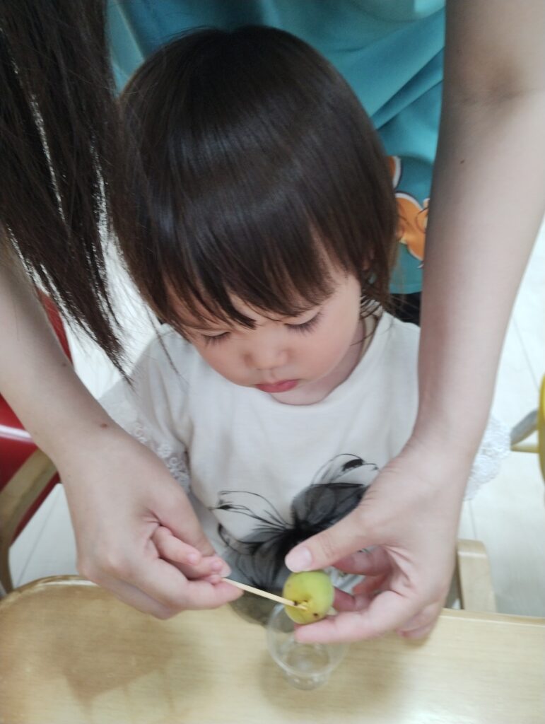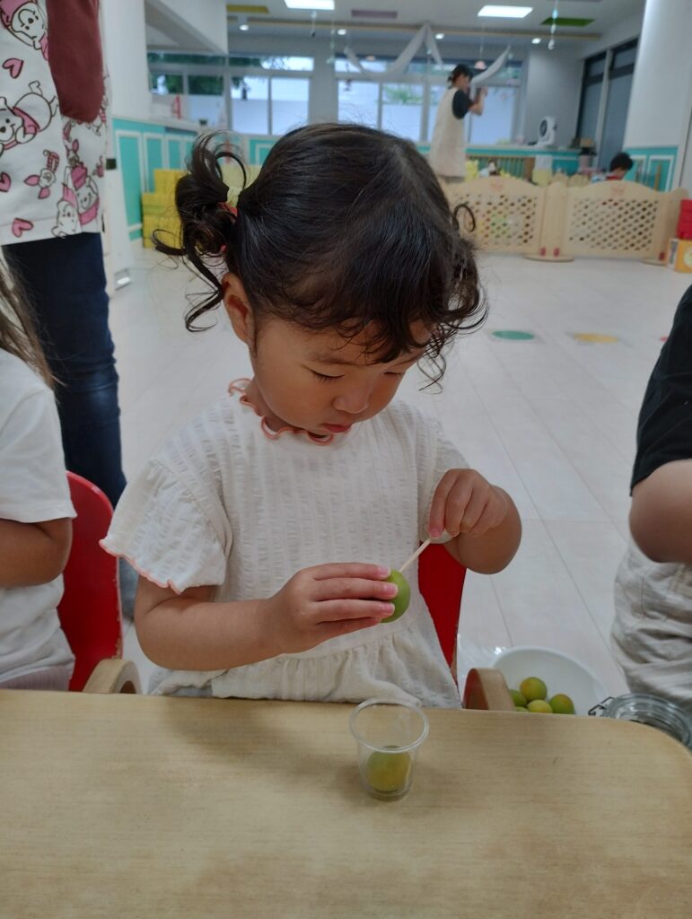 今日は食育で梅のシロップを作る前の、梅のヘタ取りと穴あけをしました!