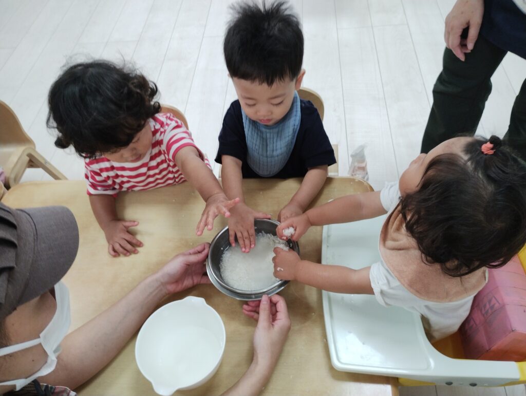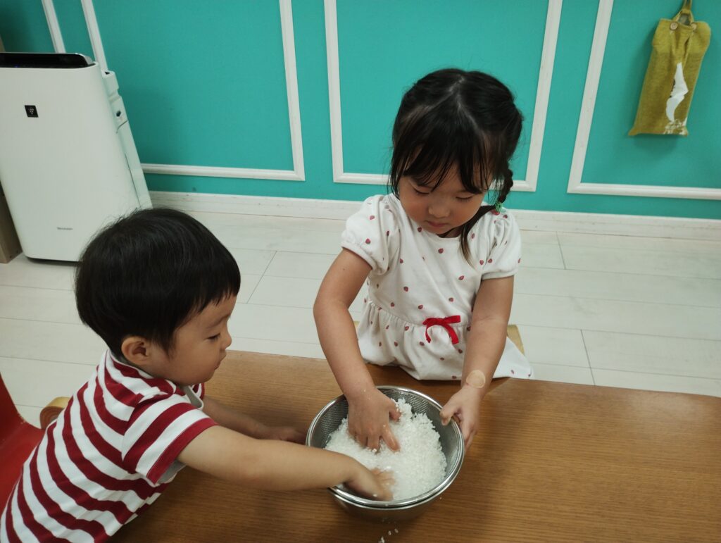 冷たい水とザラザラとしたお米の感触が気持ちよく、また面白かったようで念入りにたくさん研いでくれた子どもたちです 🎶