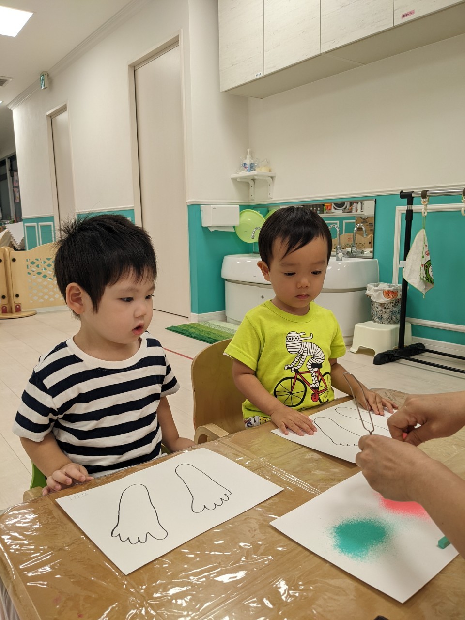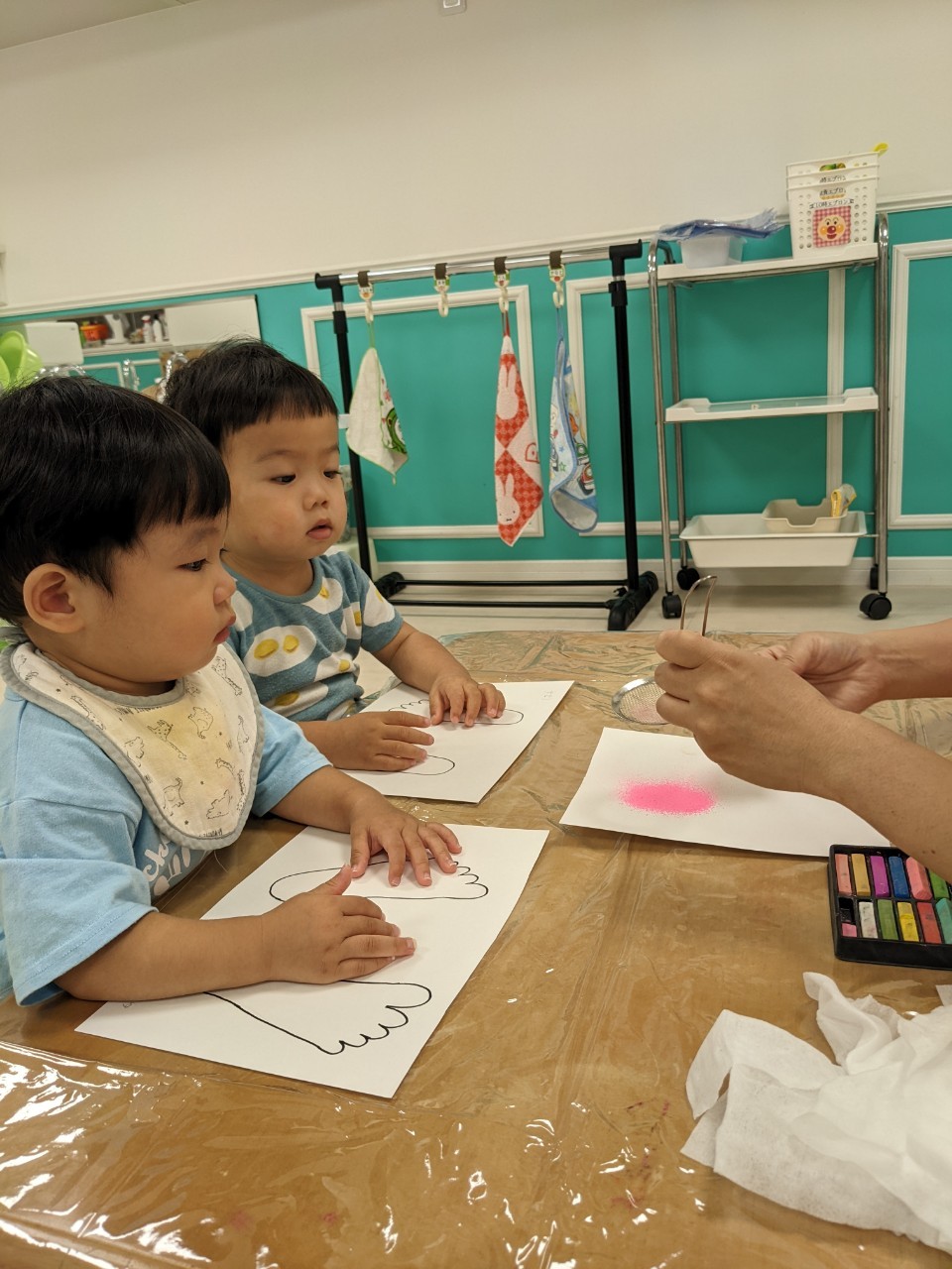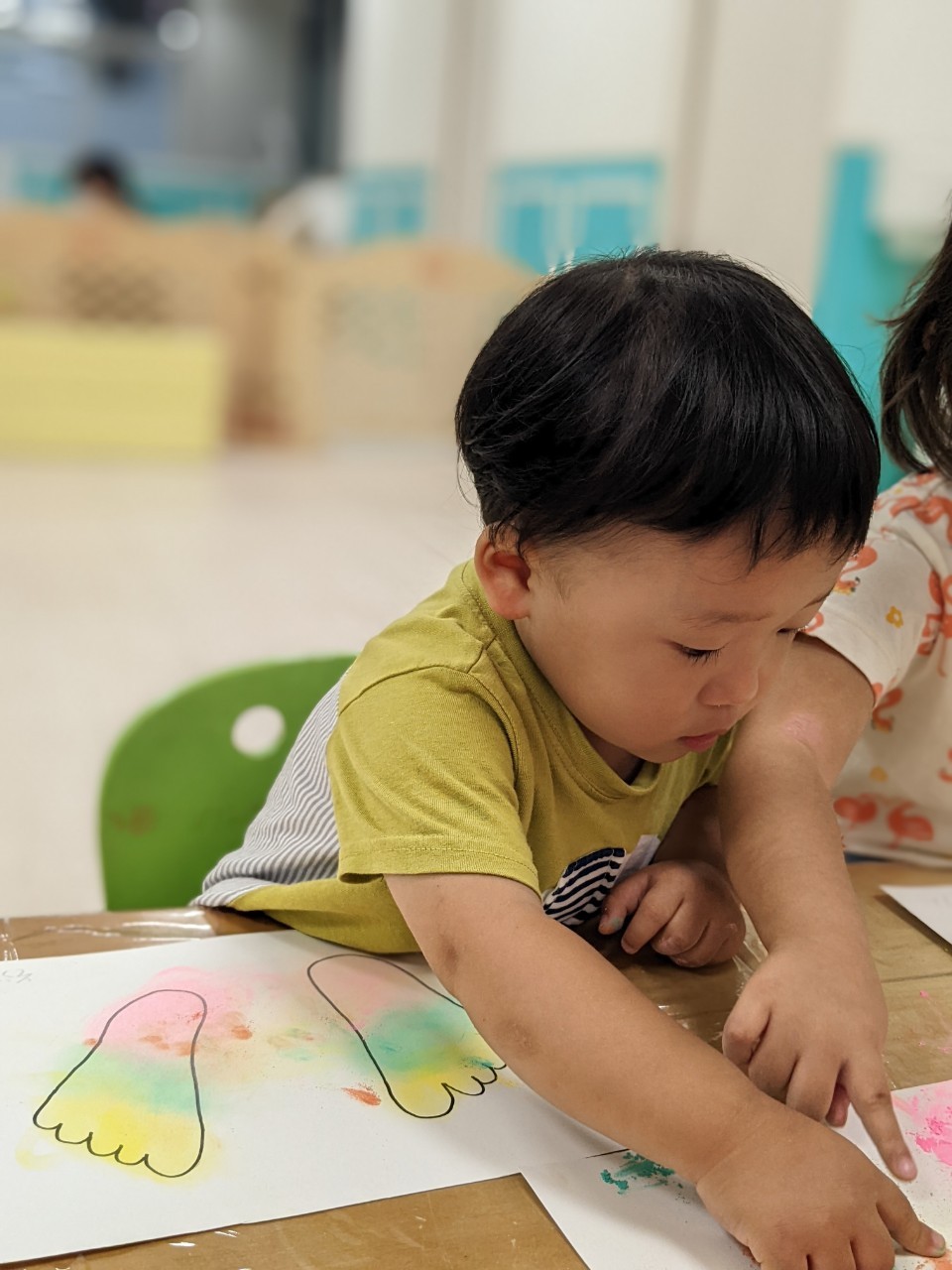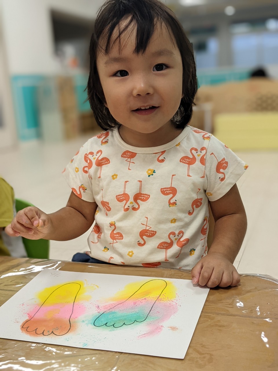 今日は、パステルアートをします!足型に色をつけていきますよ!!子ども達は興味を示していましたよ!サラサラ粉の感触……面白いです☺️