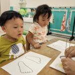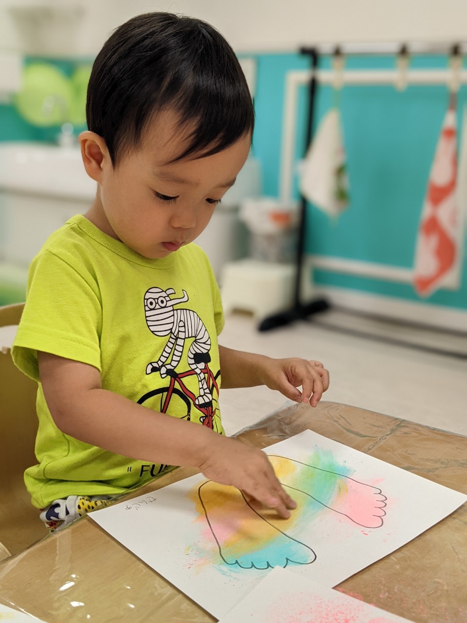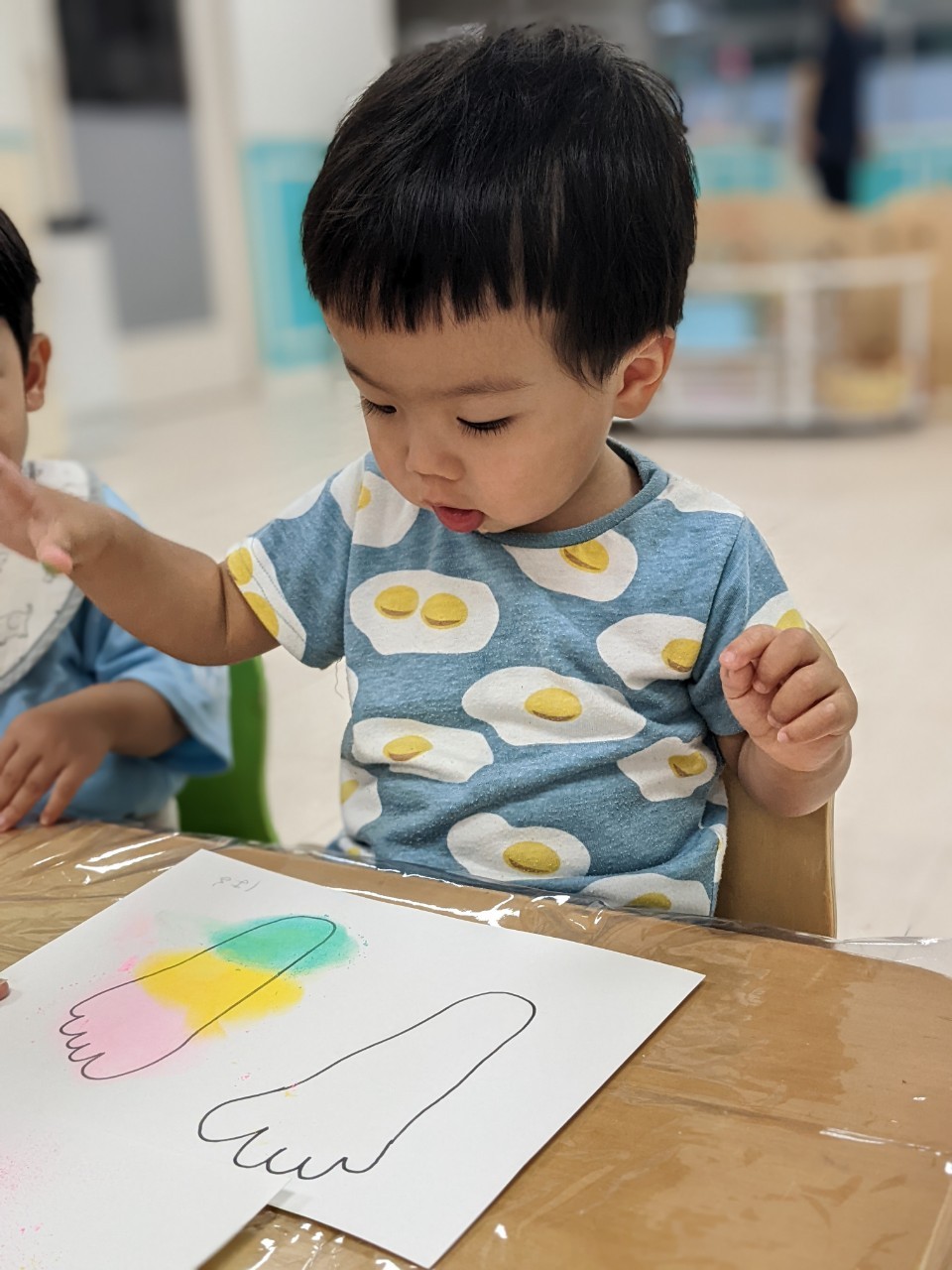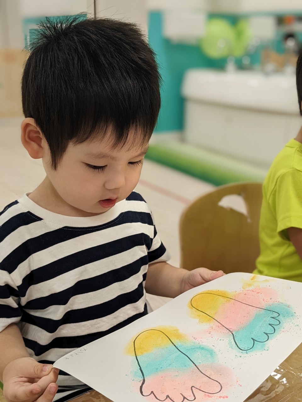今日は、パステルアートをします!足型に色をつけていきますよ!!子ども達は興味を示していましたよ!サラサラ粉の感触……面白いです☺️