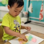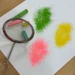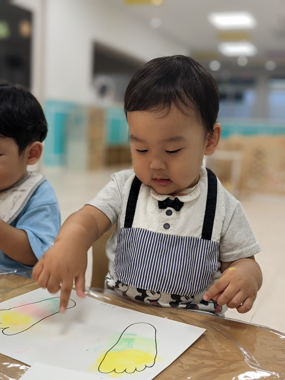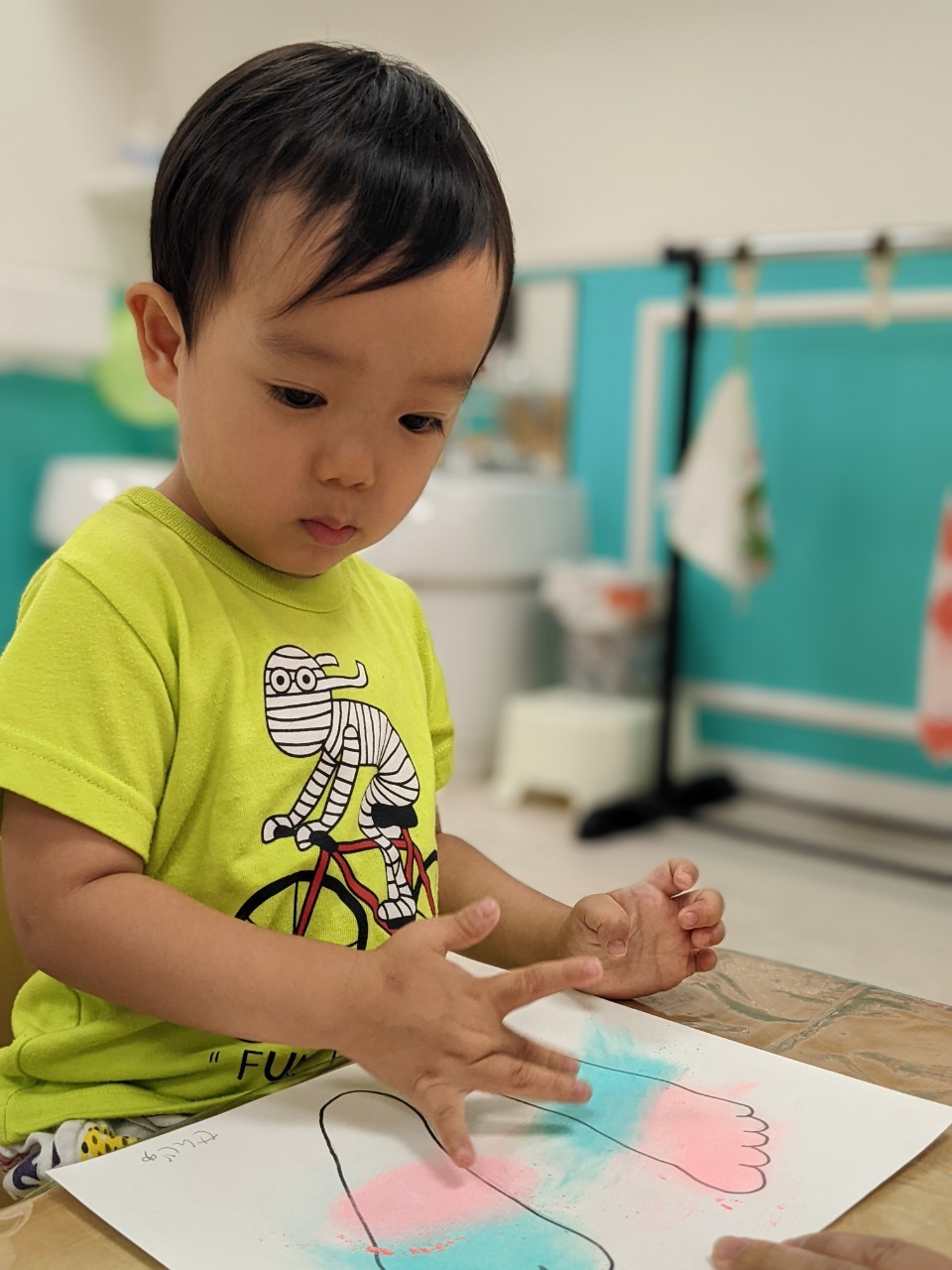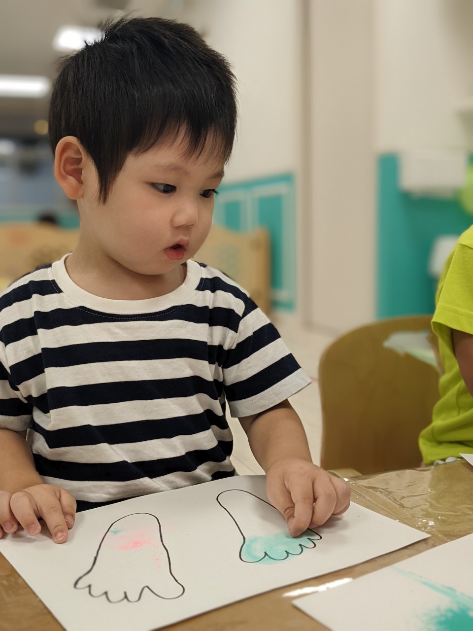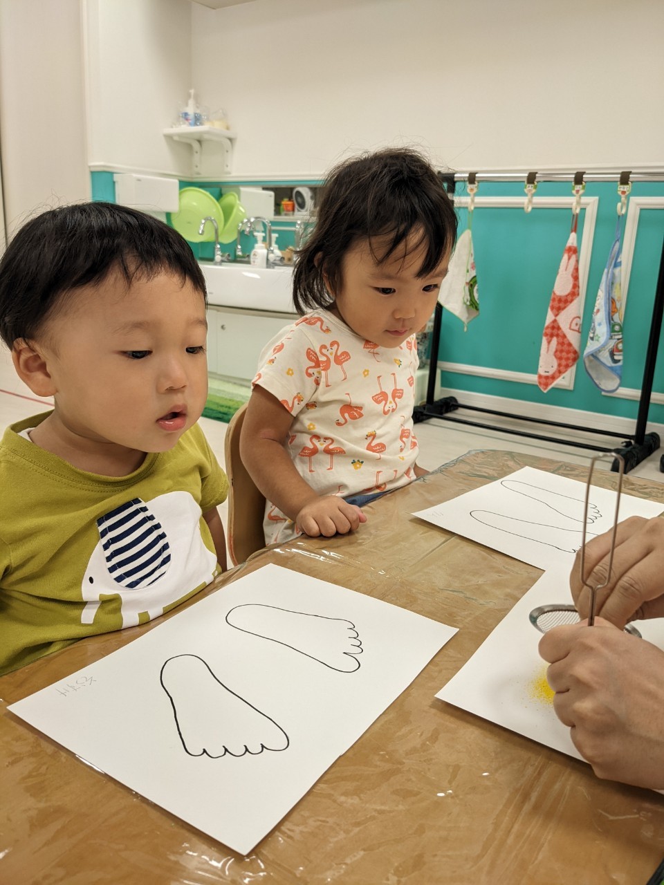 今日は、パステルアートをします!足型に色をつけていきますよ!!子ども達は興味を示していましたよ!サラサラ粉の感触……面白いです☺️