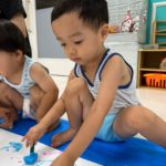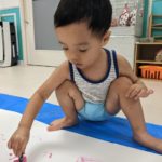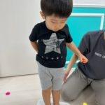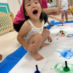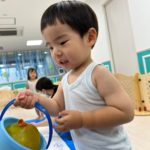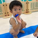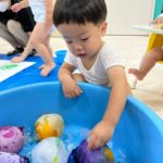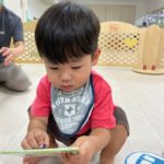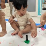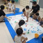 もうすぐ夏の遊びも終わりに近付いていますね!大きな模造紙に氷クレヨンでお絵描きをしました✨️描いていくと氷がとけてきて、水溜まりができ、手で弾いて、はじき絵にもなりました❣️色が混ざり違う色がでてきて、楽しかったですよ!!2歳児さんは、お絵描きに集中してました!1歳児さんは、氷に興味津々でしたよ😂