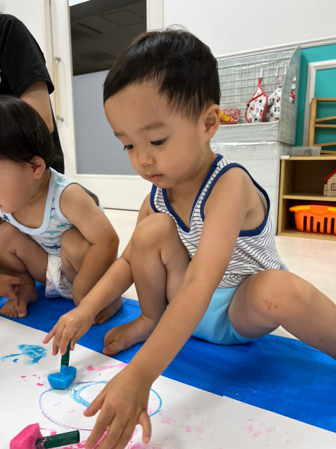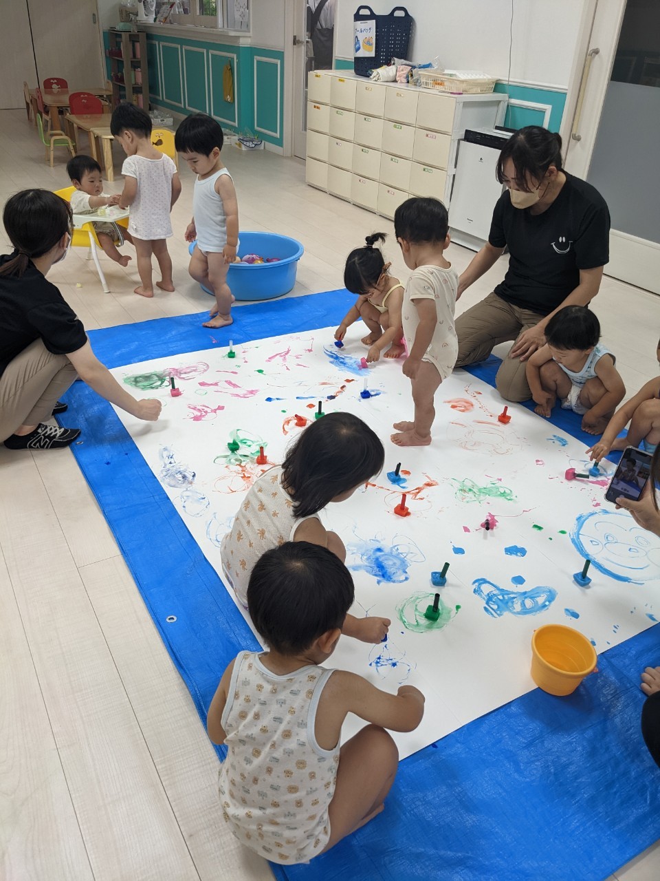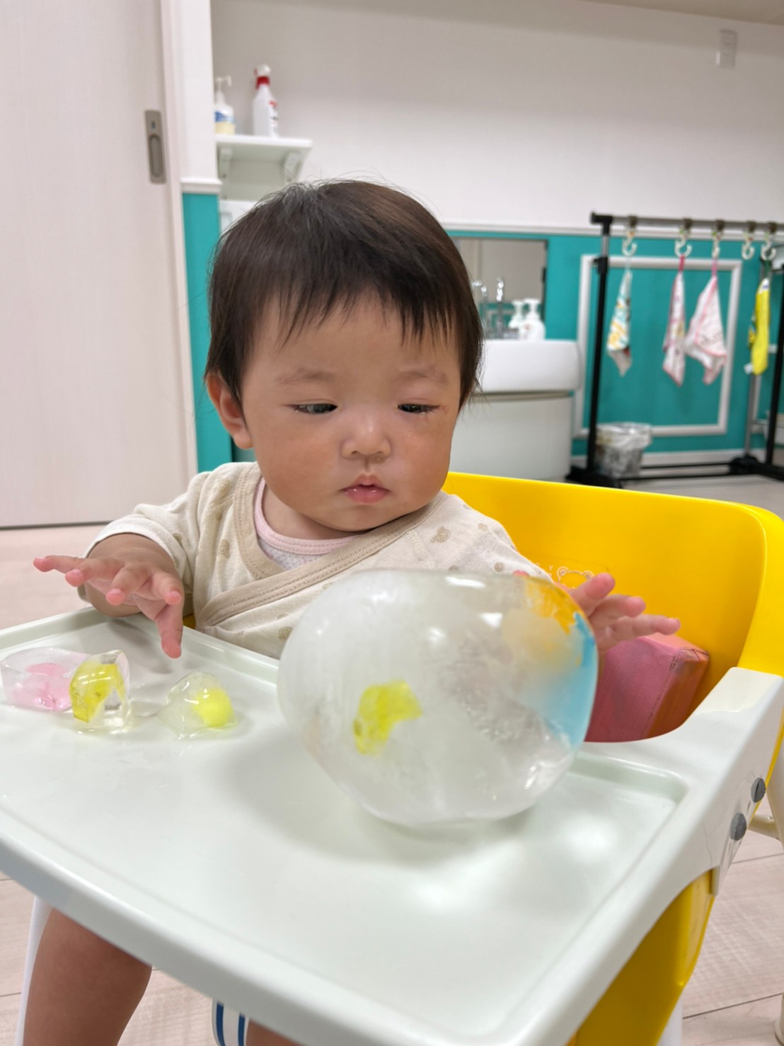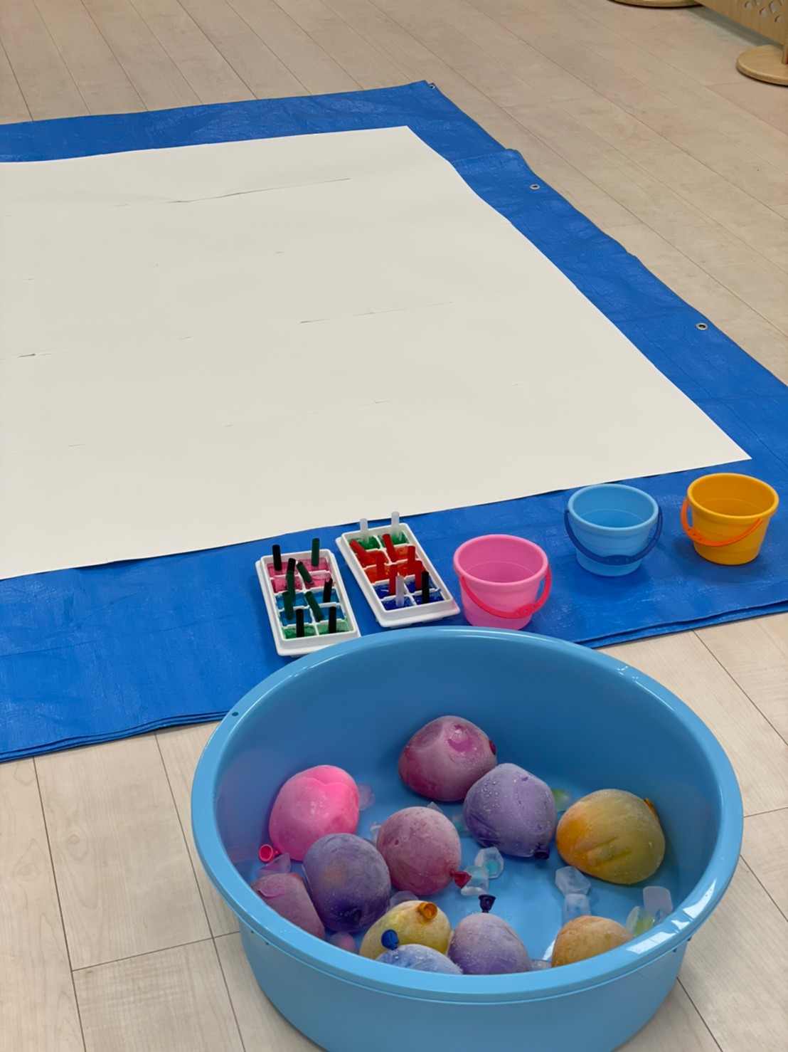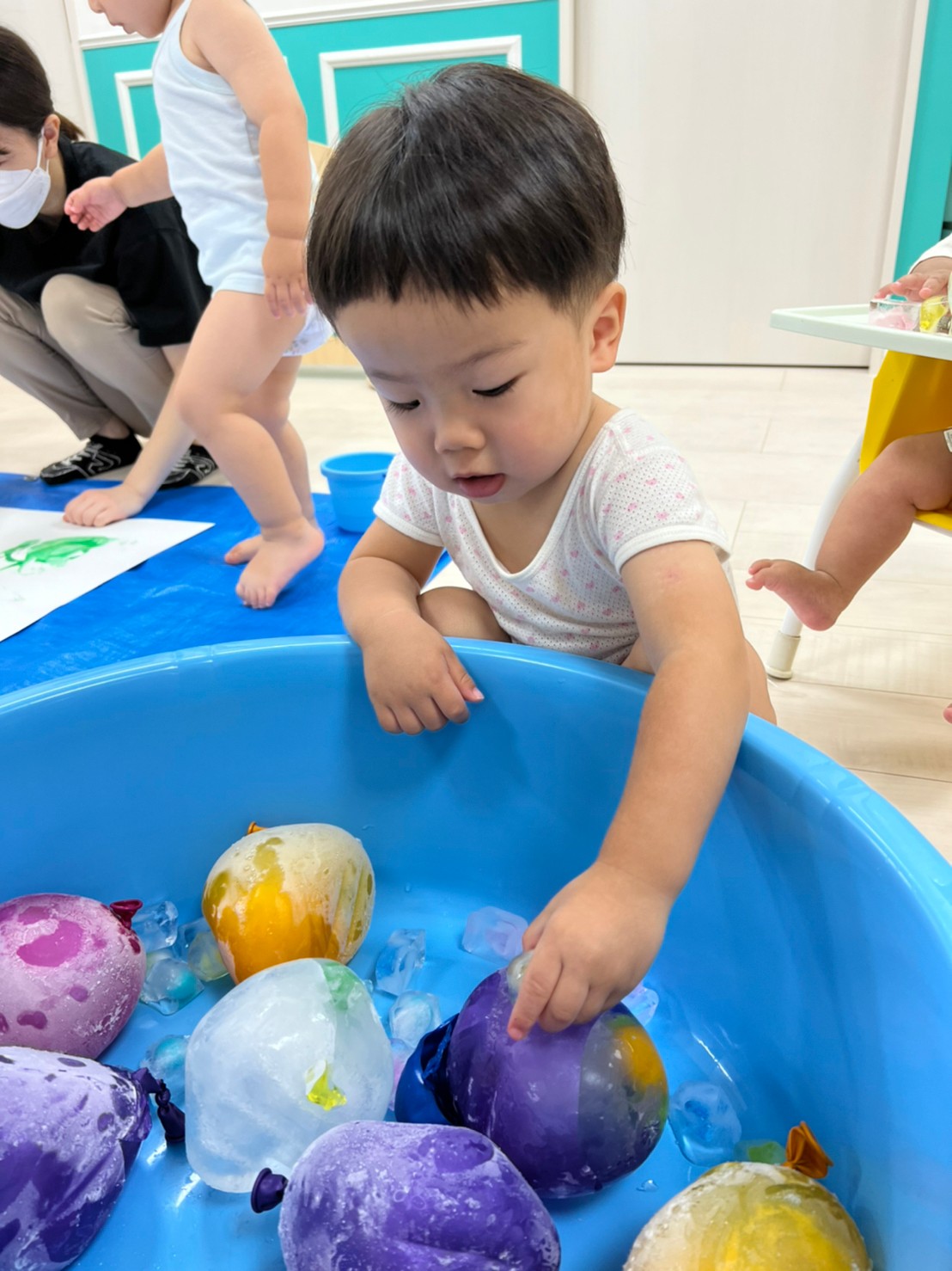もうすぐ夏の遊びも終わりに近付いていますね!大きな模造紙に氷クレヨンでお絵描きをしました✨️描いていくと氷がとけてきて、水溜まりができ、手で弾いて、はじき絵にもなりました❣️色が混ざり違う色がでてきて、楽しかったですよ!!2歳児さんは、お絵描きに集中してました!1歳児さんは、氷に興味津々でしたよ😂