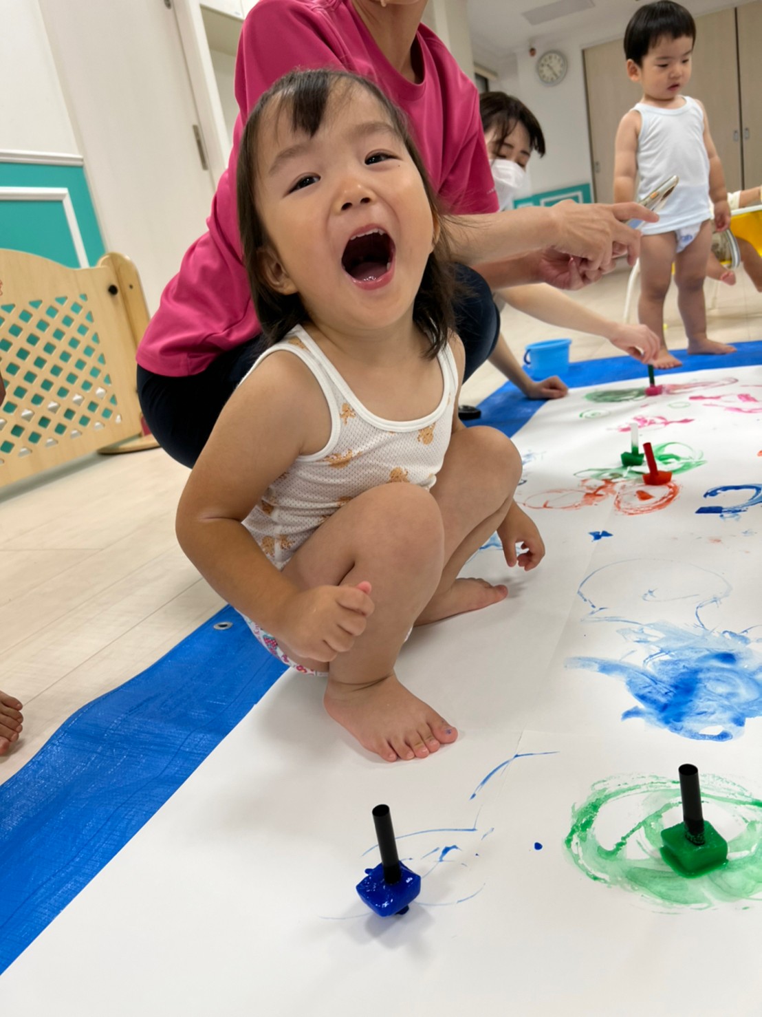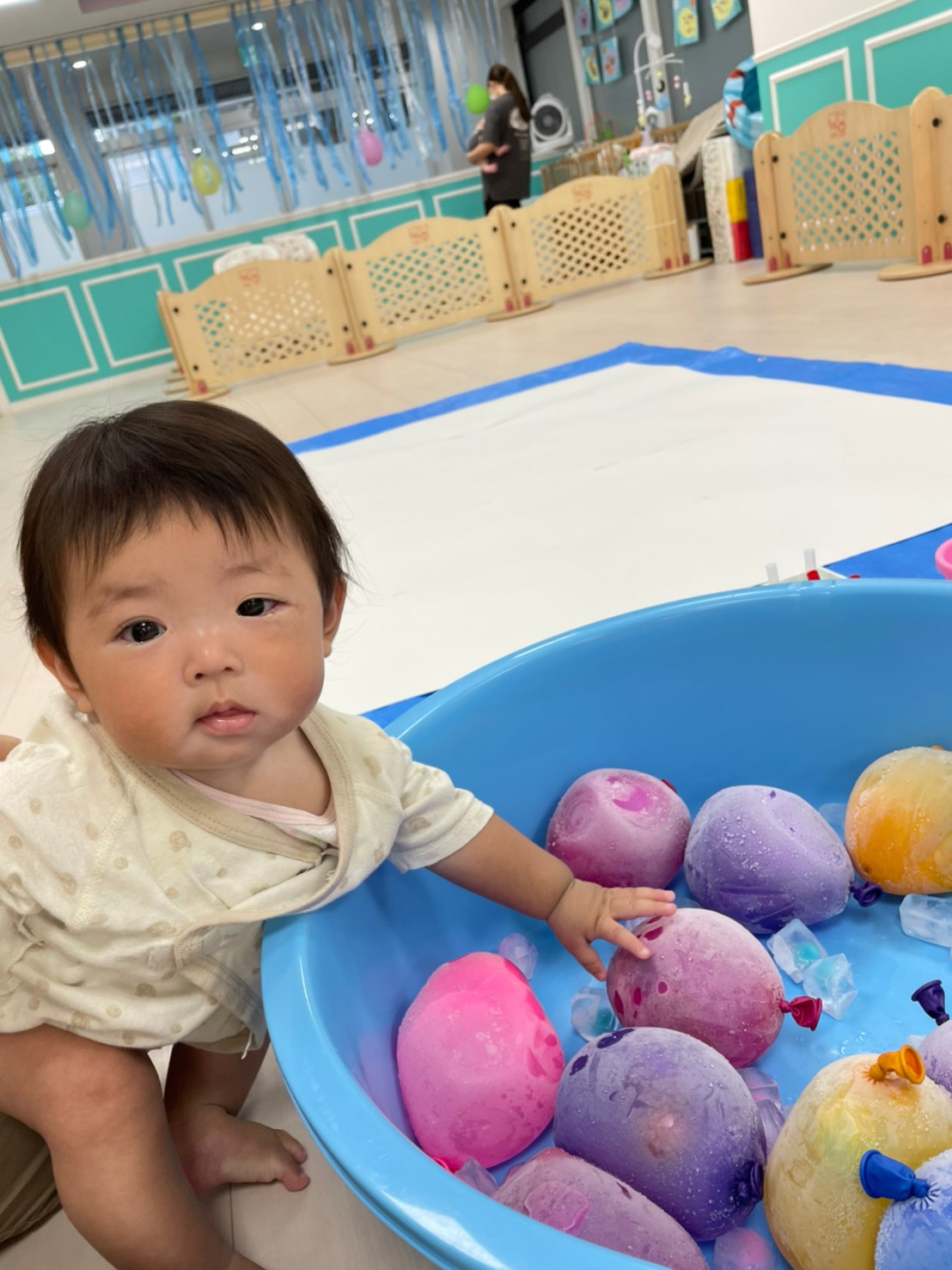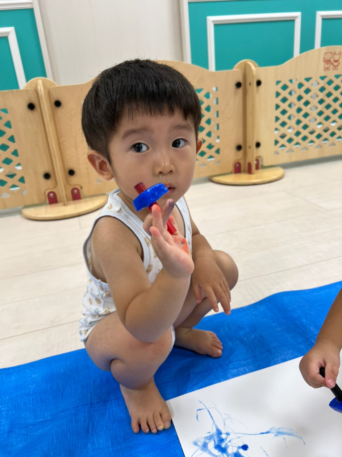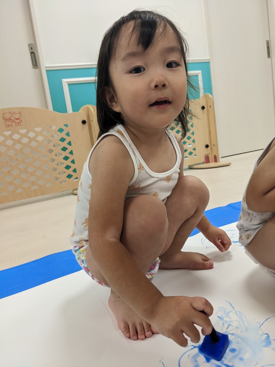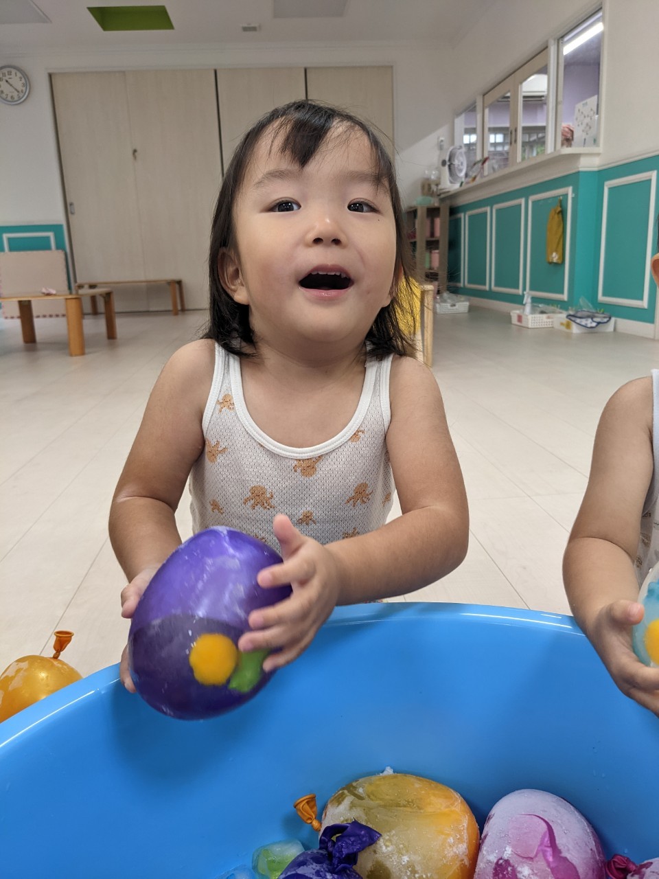 もうすぐ夏の遊びも終わりに近付いていますね!大きな模造紙に氷クレヨンでお絵描きをしました✨️描いていくと氷がとけてきて、水溜まりができ、手で弾いて、はじき絵にもなりました❣️色が混ざり違う色がでてきて、楽しかったですよ!!2歳児さんは、お絵描きに集中してました!1歳児さんは、氷に興味津々でしたよ😂