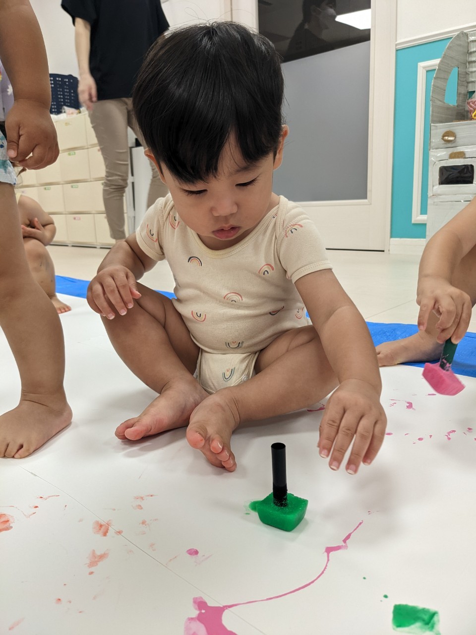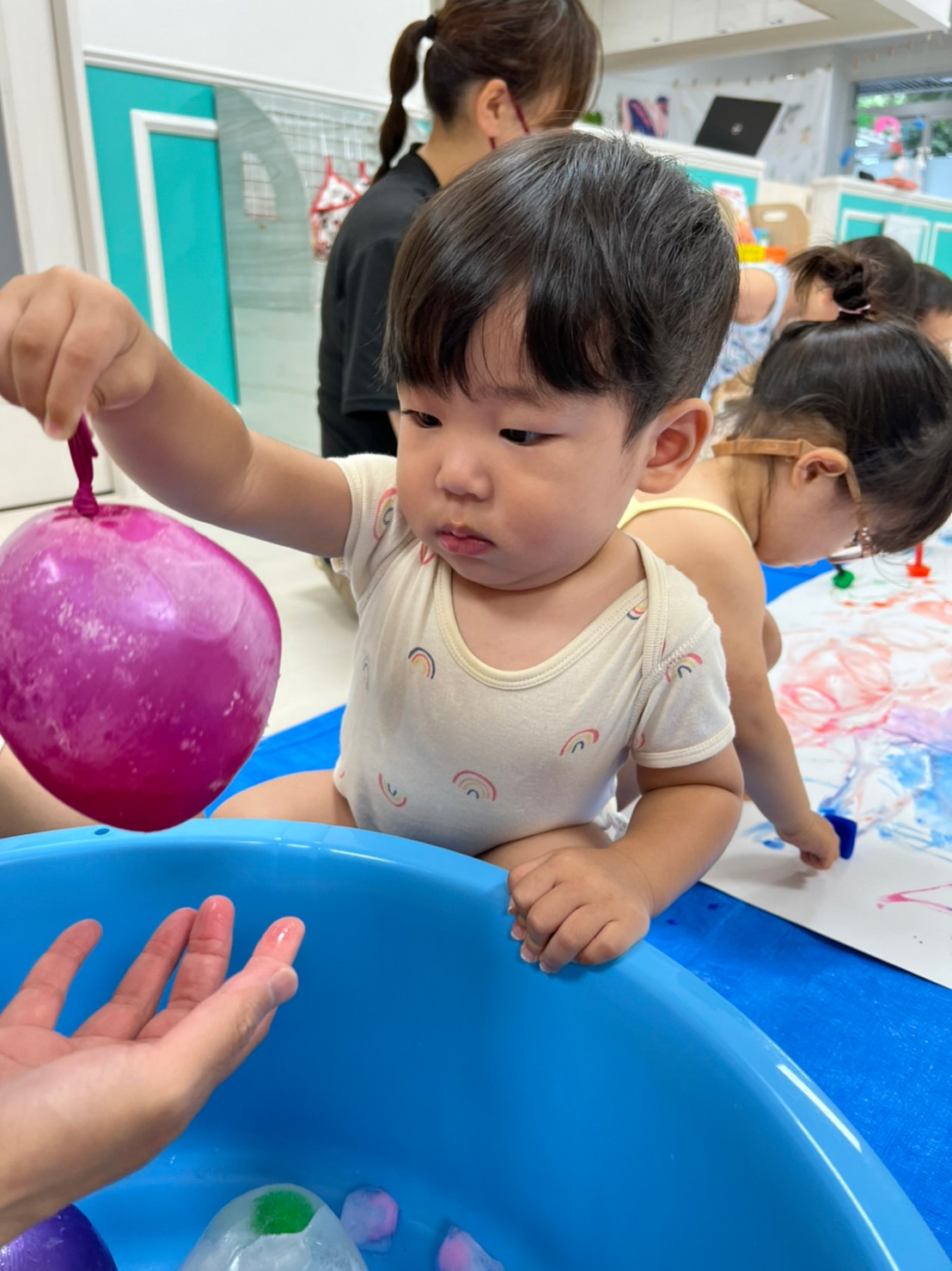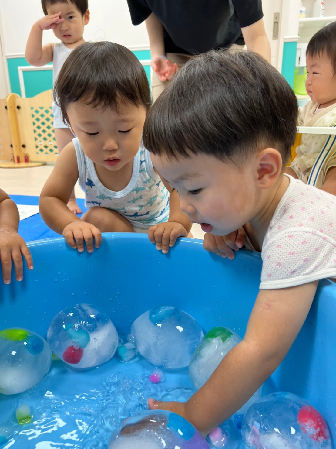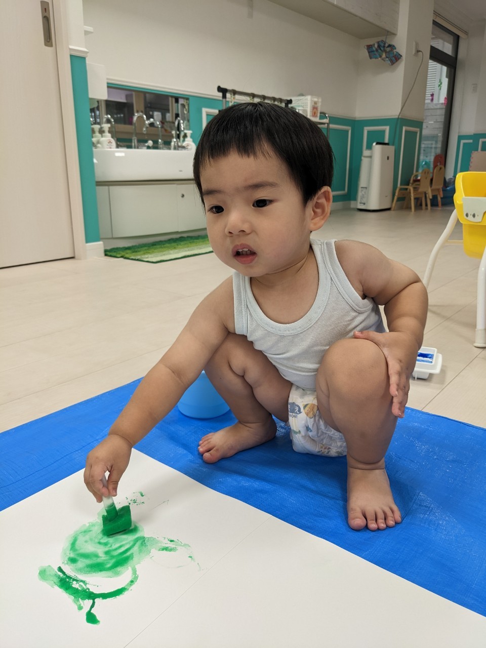 もうすぐ夏の遊びも終わりに近付いていますね!大きな模造紙に氷クレヨンでお絵描きをしました✨️描いていくと氷がとけてきて、水溜まりができ、手で弾いて、はじき絵にもなりました❣️色が混ざり違う色がでてきて、楽しかったですよ!!2歳児さんは、お絵描きに集中してました!1歳児さんは、氷に興味津々でしたよ😂