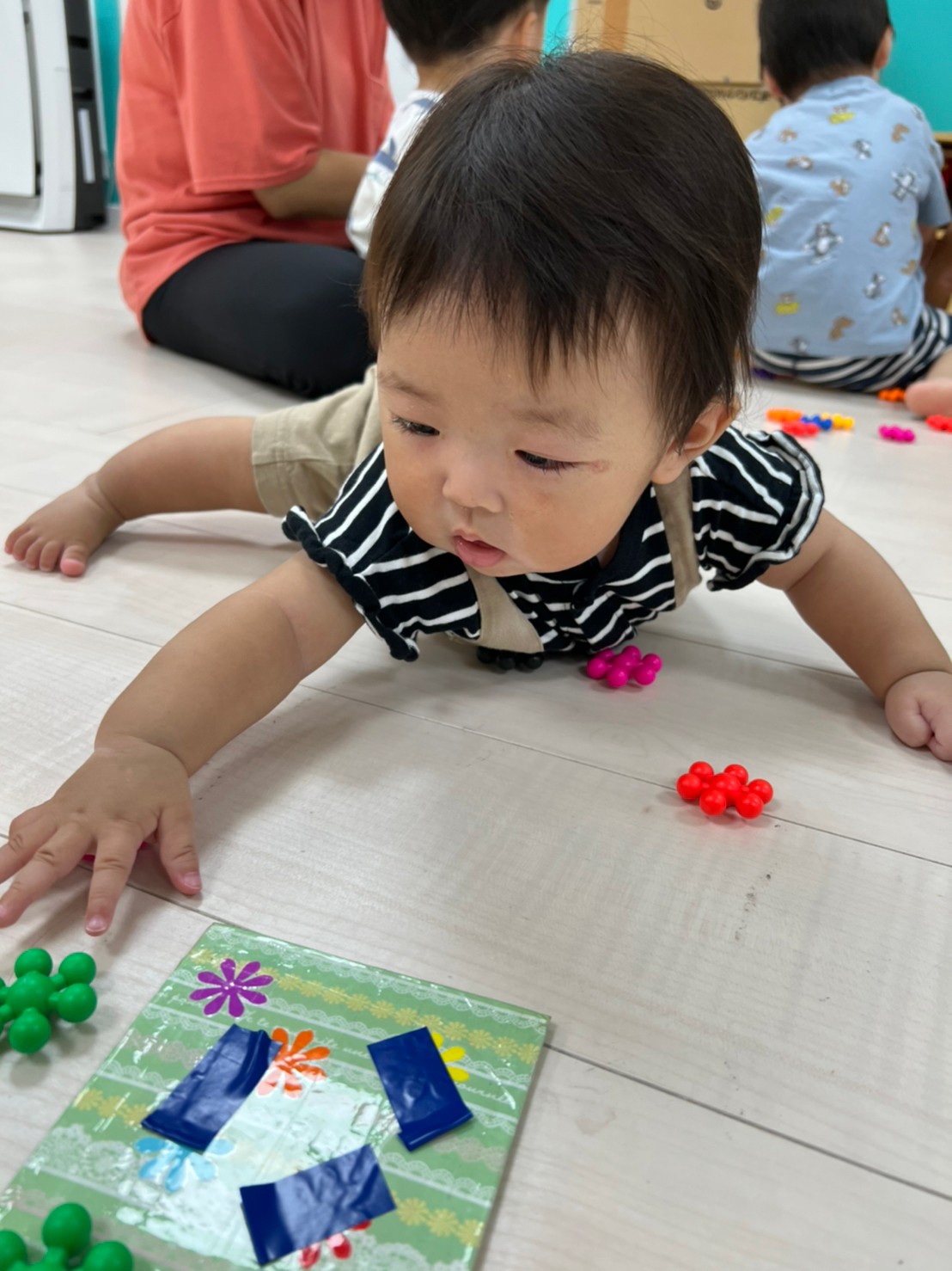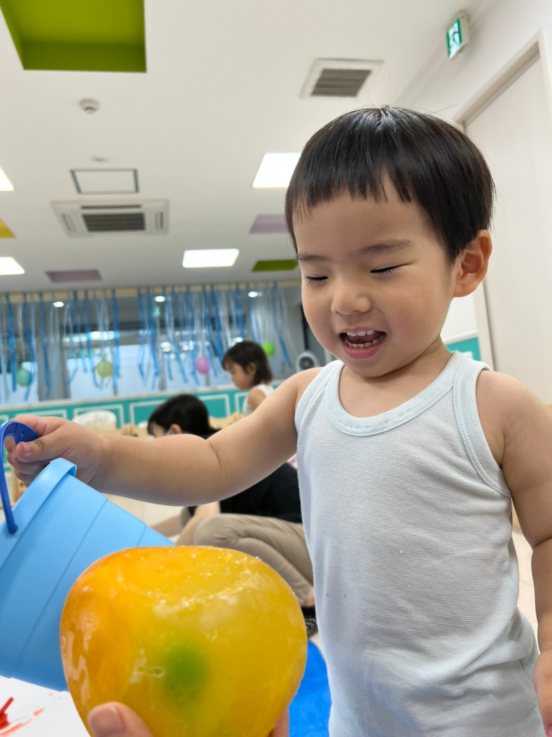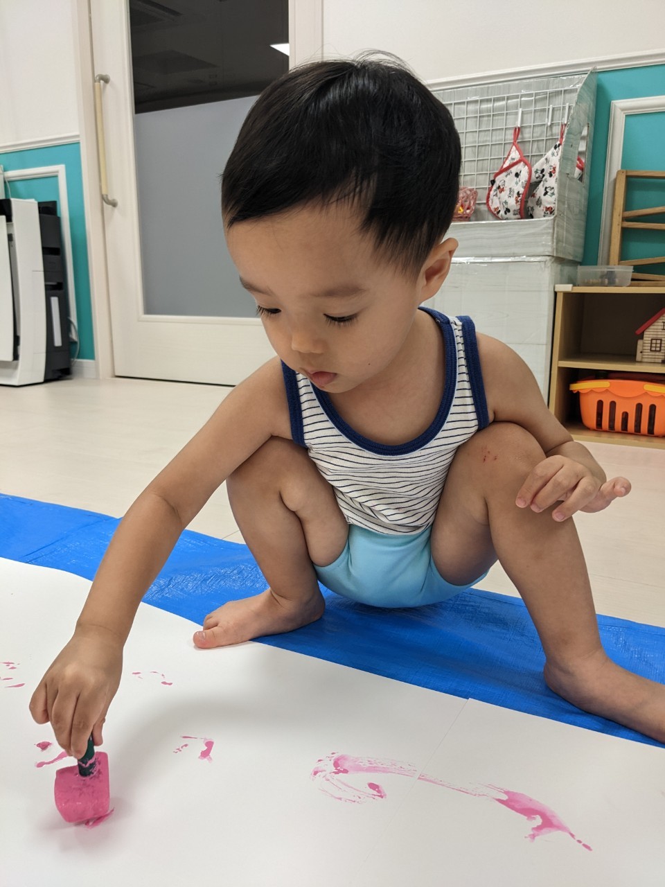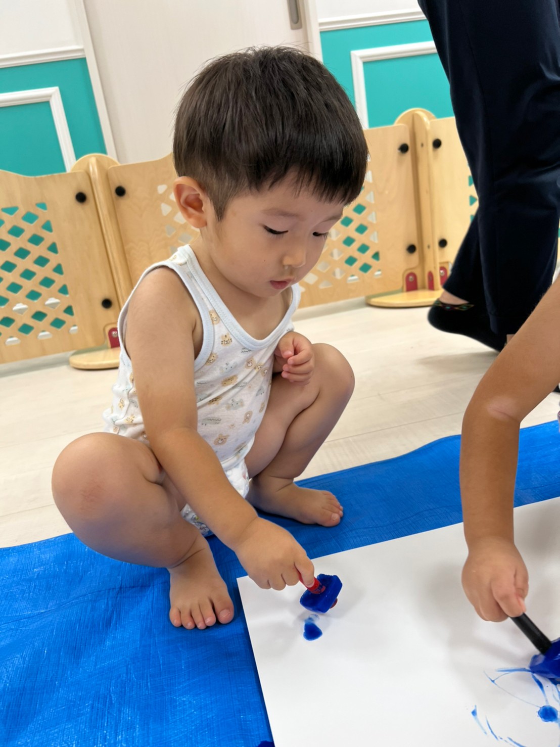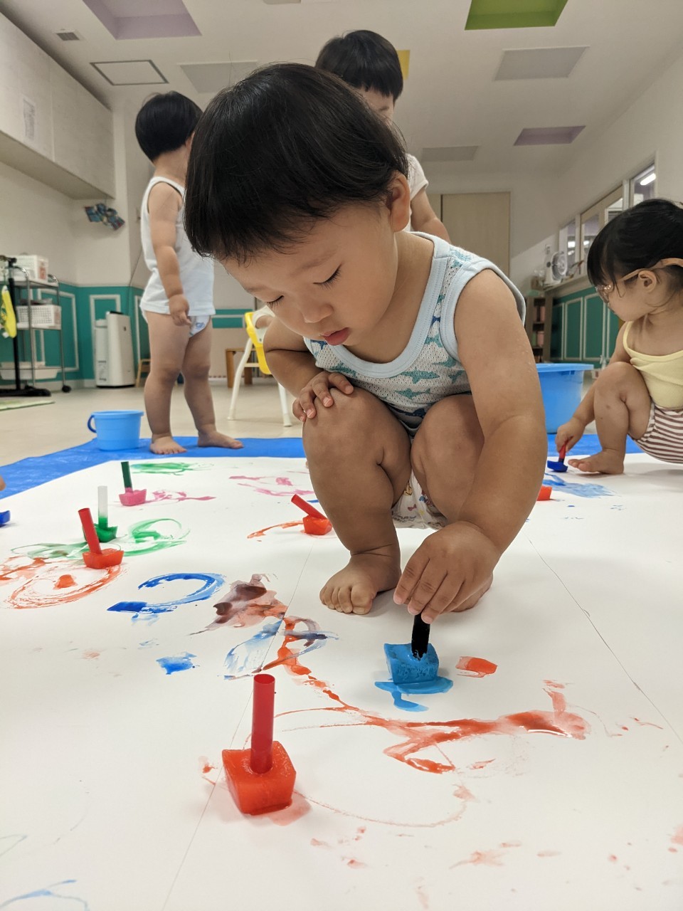 もうすぐ夏の遊びも終わりに近付いていますね!大きな模造紙に氷クレヨンでお絵描きをしました✨️描いていくと氷がとけてきて、水溜まりができ、手で弾いて、はじき絵にもなりました❣️色が混ざり違う色がでてきて、楽しかったですよ!!2歳児さんは、お絵描きに集中してました!1歳児さんは、氷に興味津々でしたよ😂
