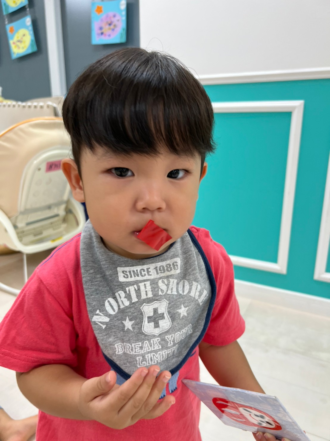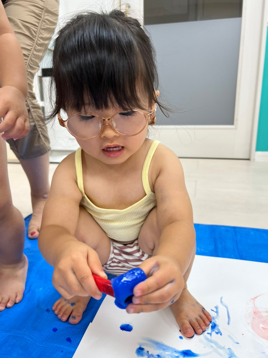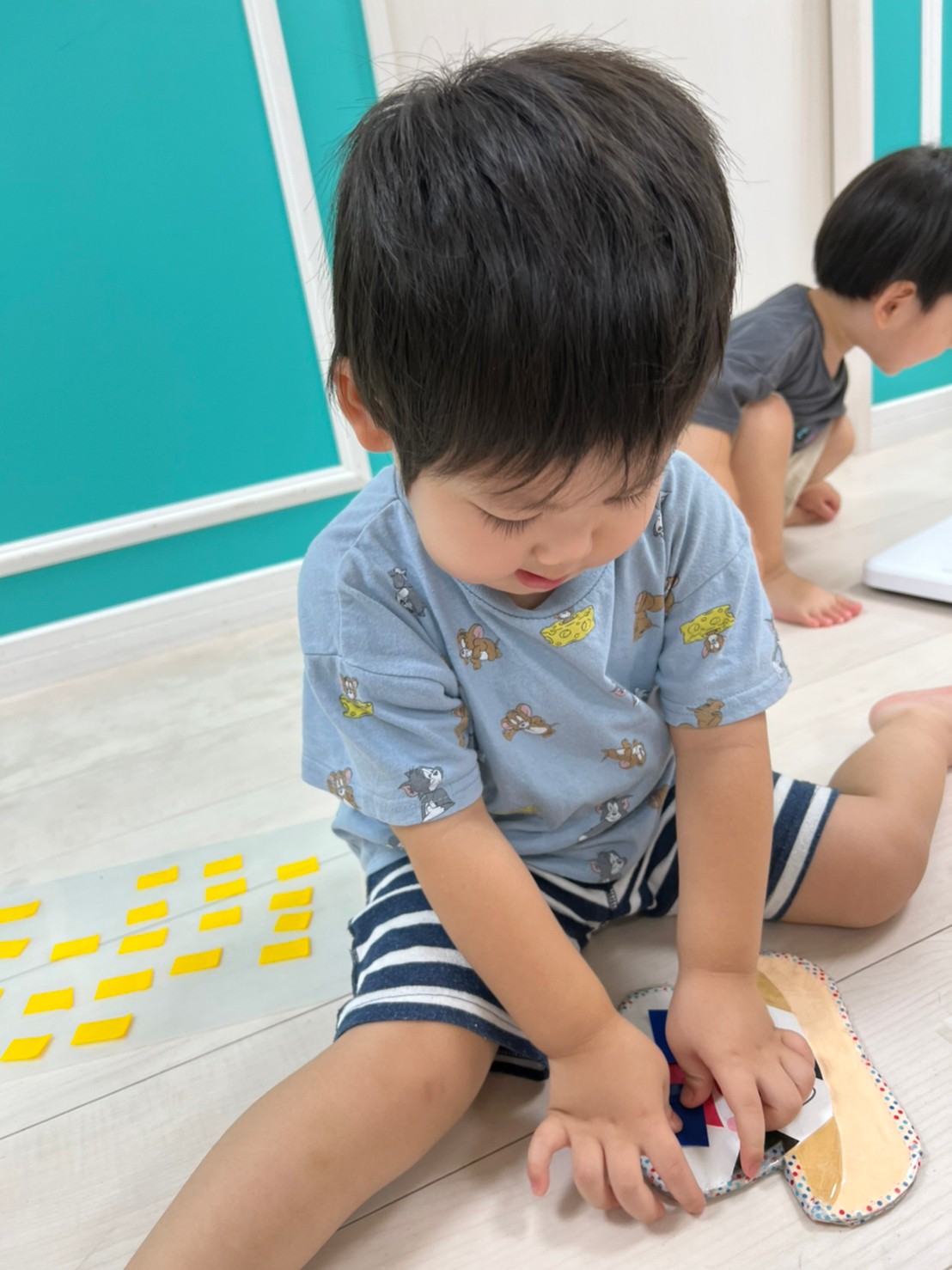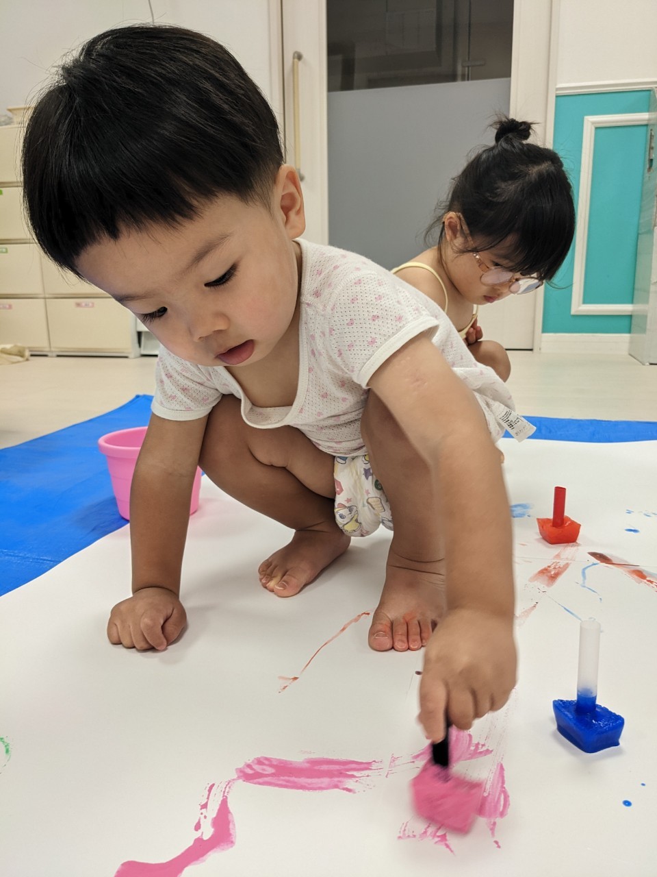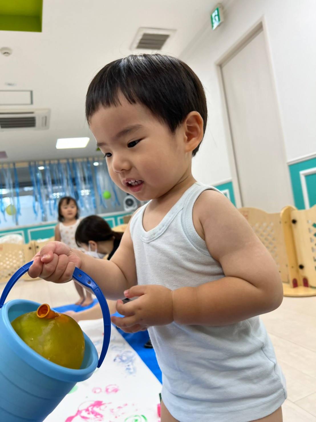 もうすぐ夏の遊びも終わりに近付いていますね!大きな模造紙に氷クレヨンでお絵描きをしました✨️描いていくと氷がとけてきて、水溜まりができ、手で弾いて、はじき絵にもなりました❣️色が混ざり違う色がでてきて、楽しかったですよ!!2歳児さんは、お絵描きに集中してました!1歳児さんは、氷に興味津々でしたよ😂